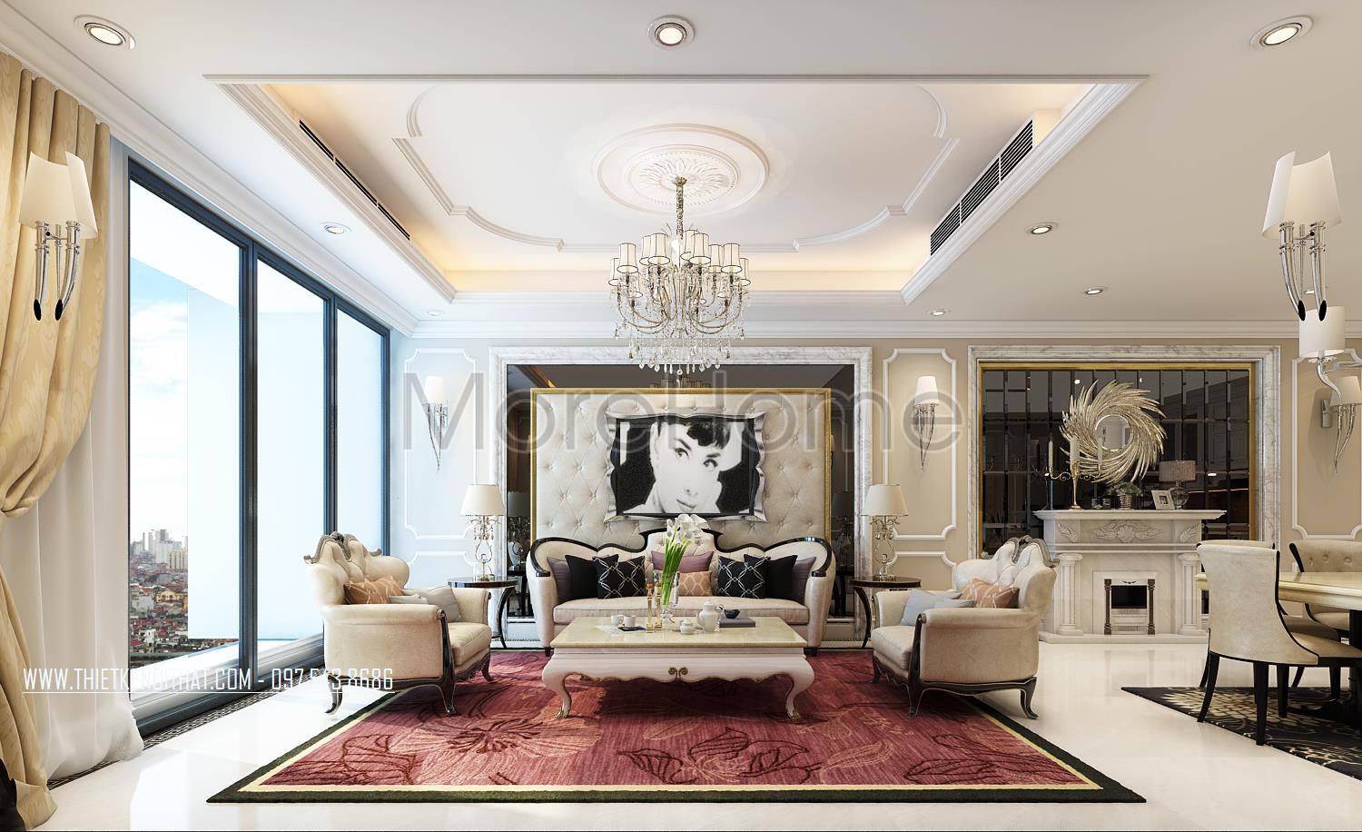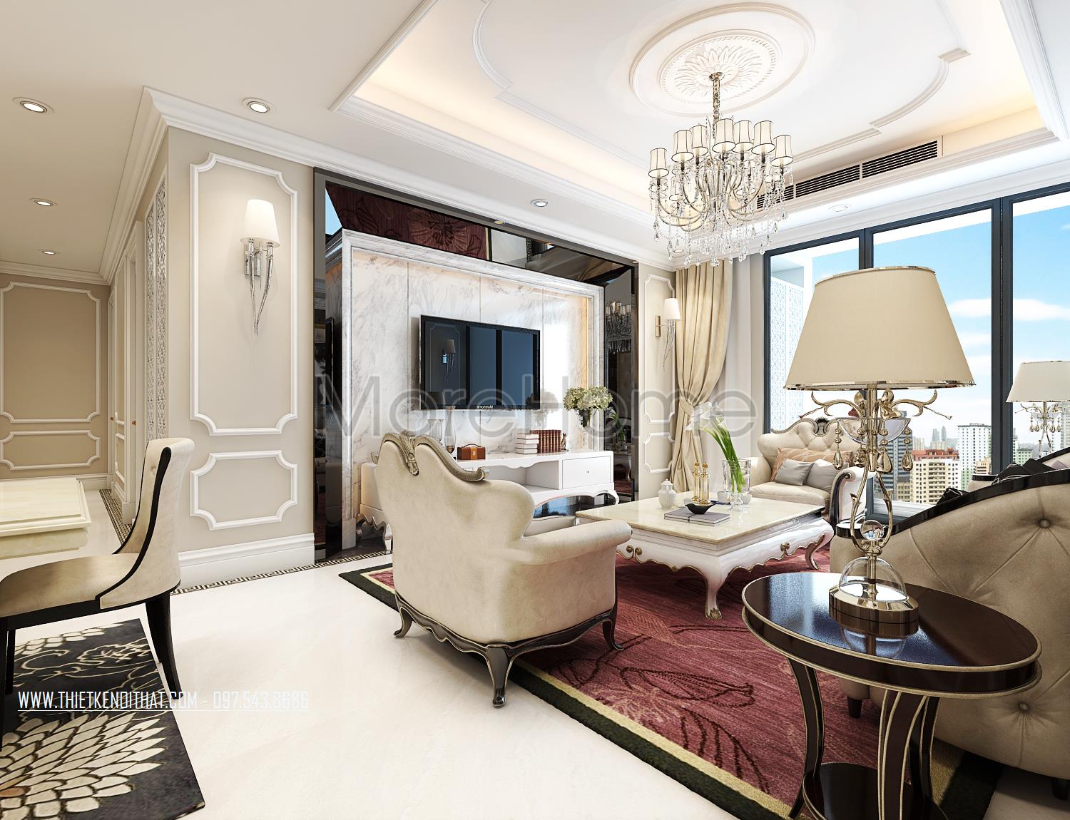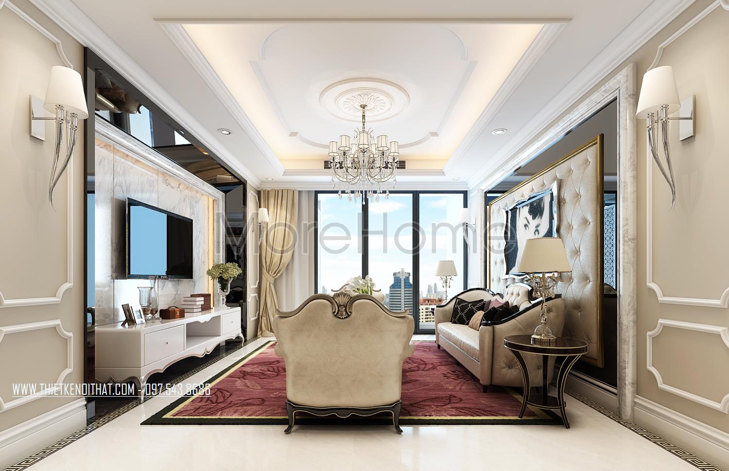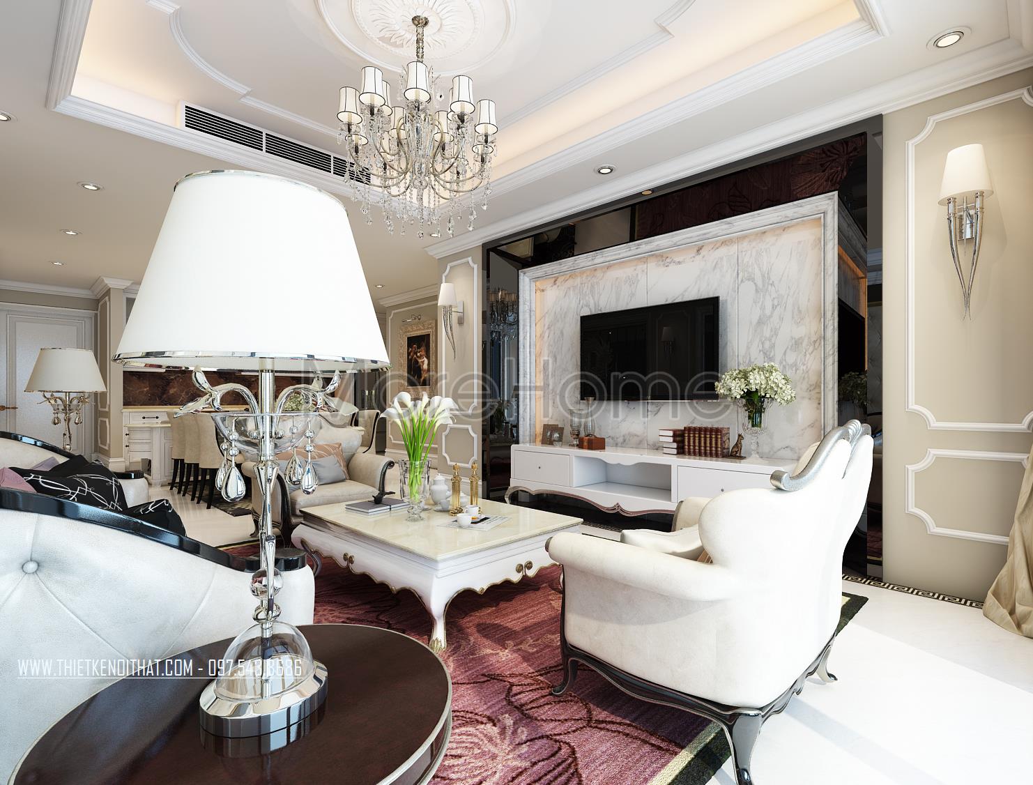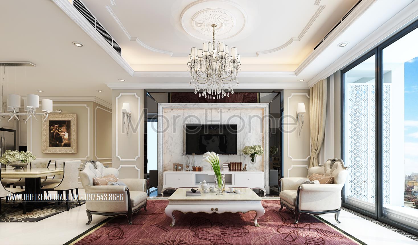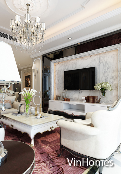 Thiết kế nội thất phòng khách tân cổ điển mang đến cảm giác nhẹ nhàng và tinh tế của phong cách châu Âu cổ. Tone màu sáng được sử dụng làm điểm nhấn của căn hộ giúp khắc phục tối đa điểm hạn chế về mặt diện tích của căn hộ, không hề mang lại sự rườm rà và khó chịu thường thấy ở phong cách này. Các mảng tường khác biệt được sử dụng tránh sự nhàm chán từ các bức tường thô đơn sắc. Để ý kỹ bạn có thể nhận thấy các vật liệu nhẹ như đá tự nhiên với độ bóng vừa phải được sử dụng khá linh hoạt từ đó mang đến độ phản chiếu nhẹ nhàng, hiện đại giúp tạo sự cân bằng cho không gian sinh hoạt chung.