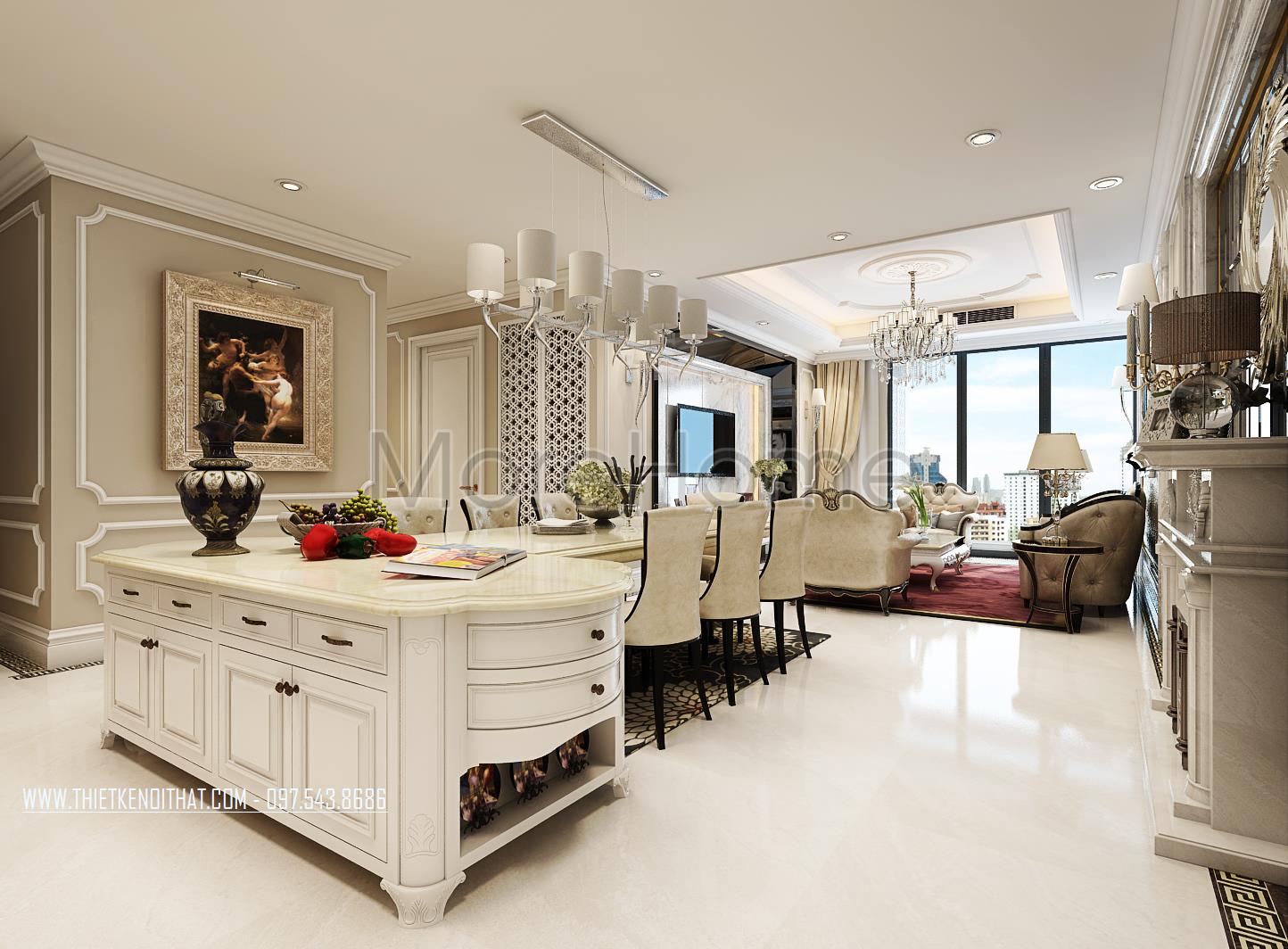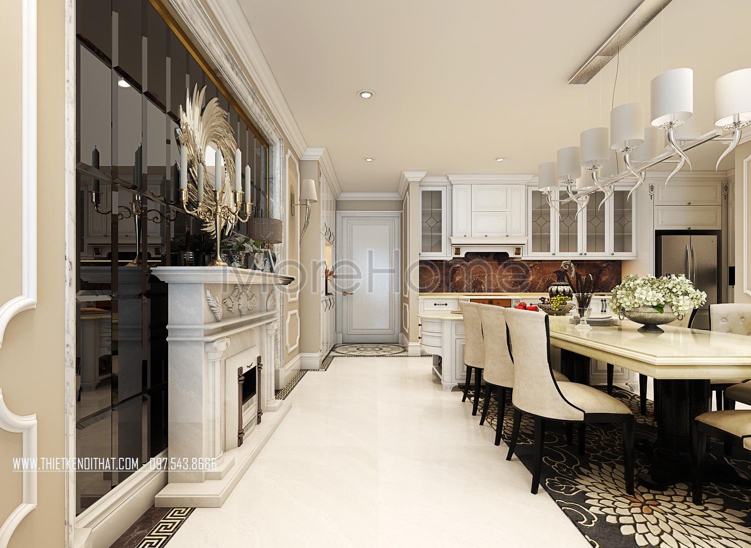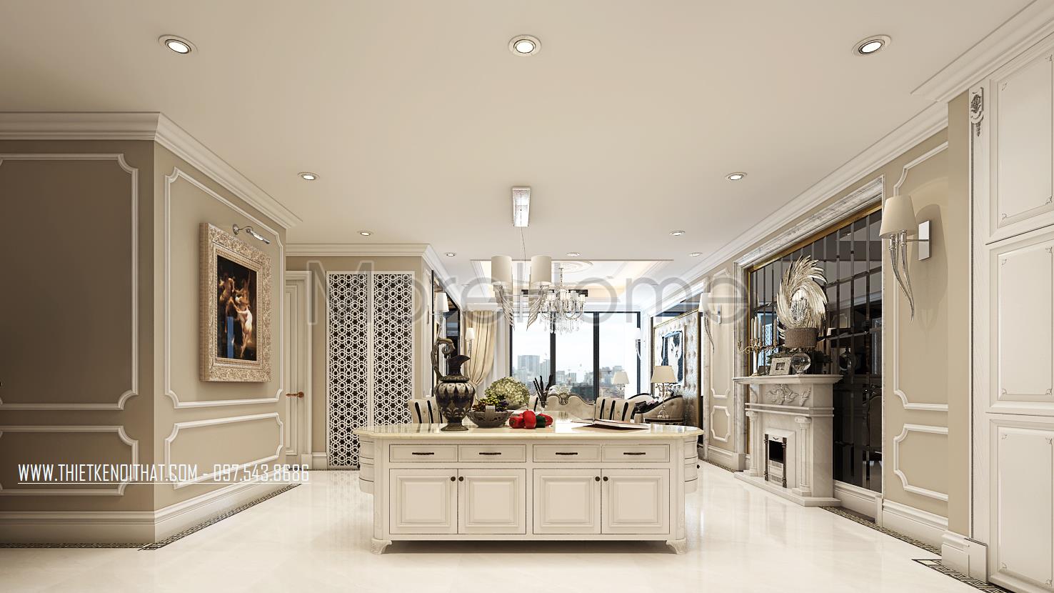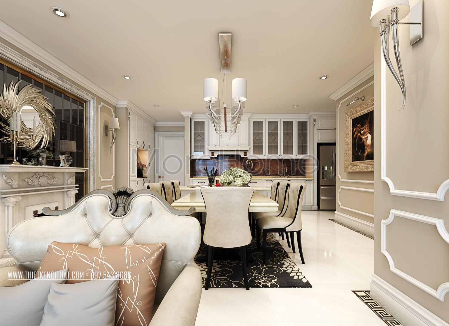 Các chi tiết trạm khắc hay đường cong tinh tế trên gỗ, tủ bếp là những điểm nhấn nhẹ nhàng mang lại điểm nhấn thẩm mỹ cho căn phòng. Một vài chi tiết trang trí khác như tranh sảnh, thảm trải sàn hay gương và thiết kế lò sưởi cách tân cũng chính là điểm nhấn sáng tạo góp phần lớn định hình phong cách thiết kế tân cổ điển cho toàn bộ khu sinh hoạt chung.