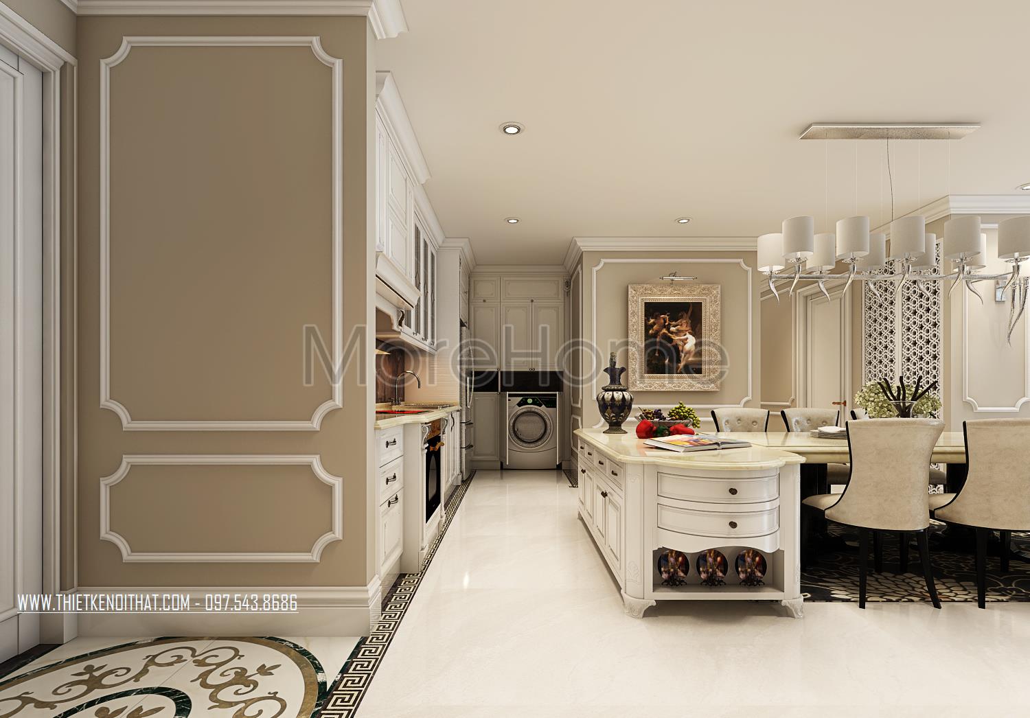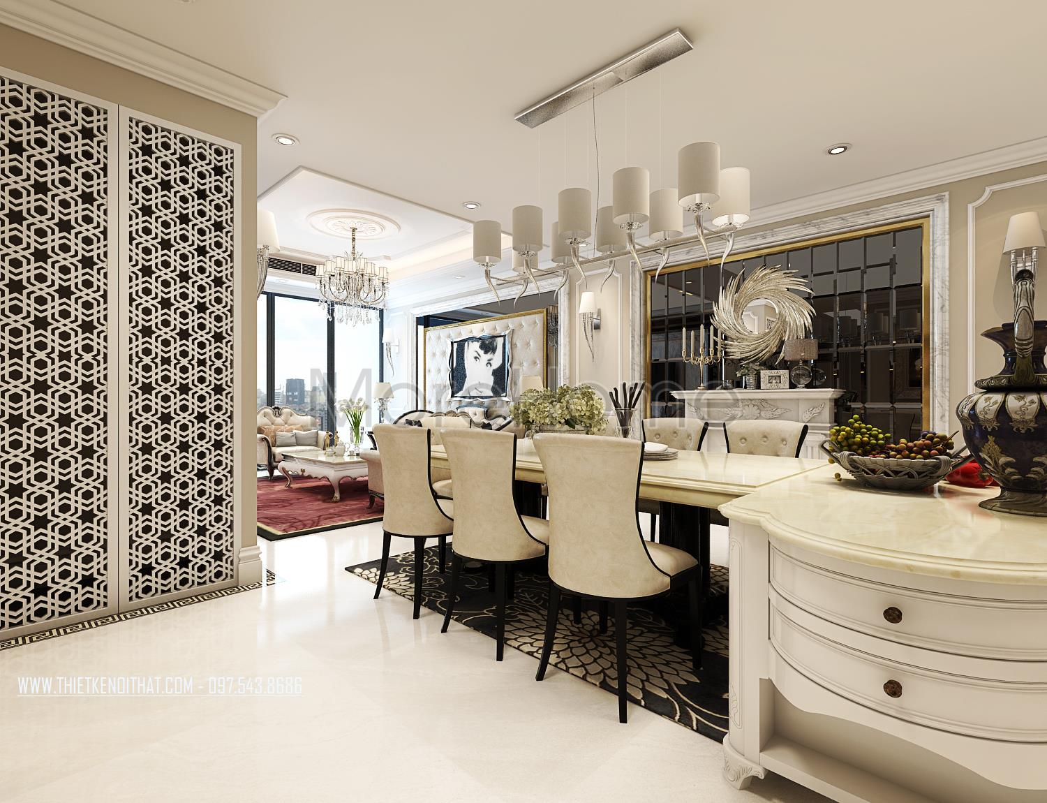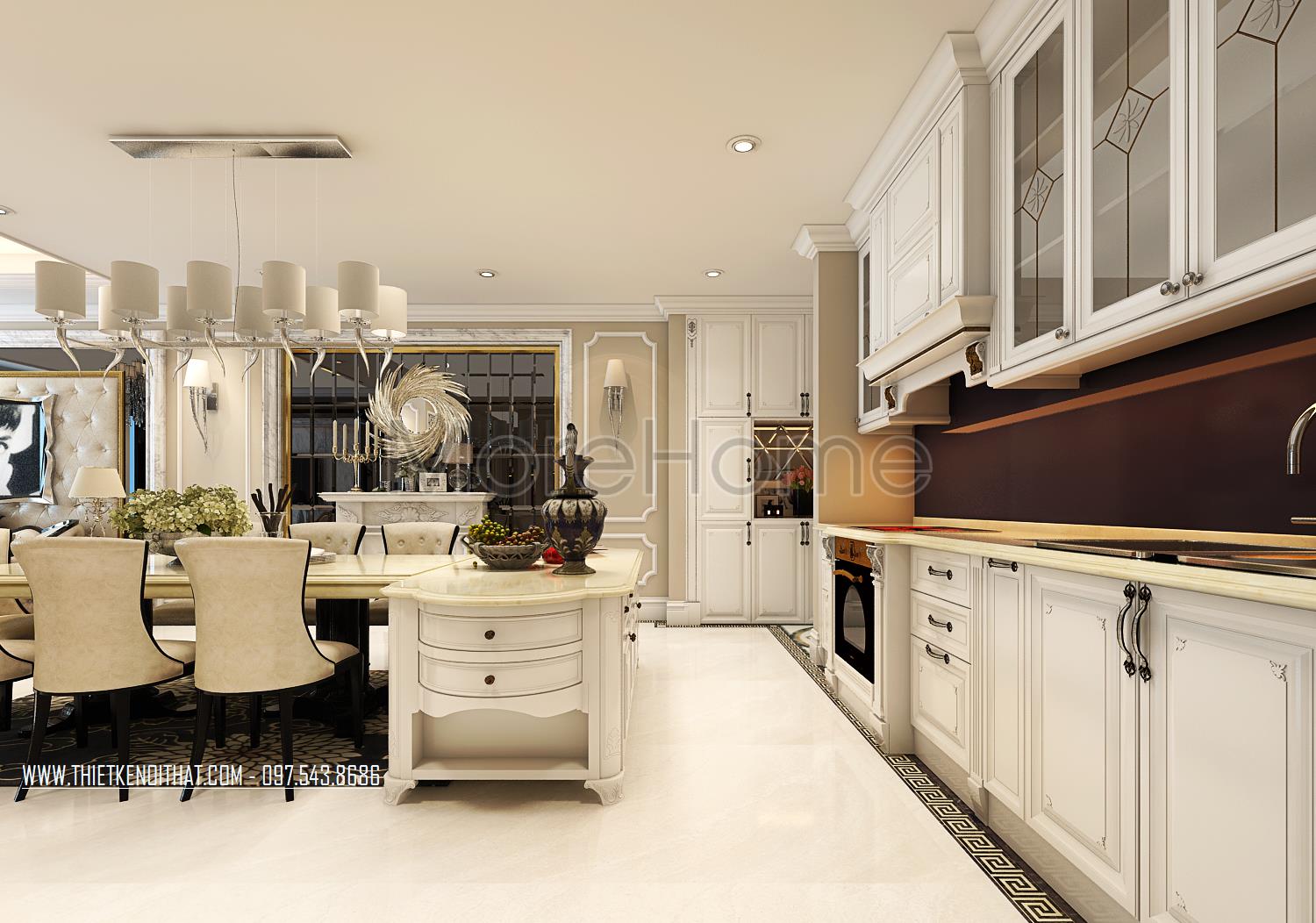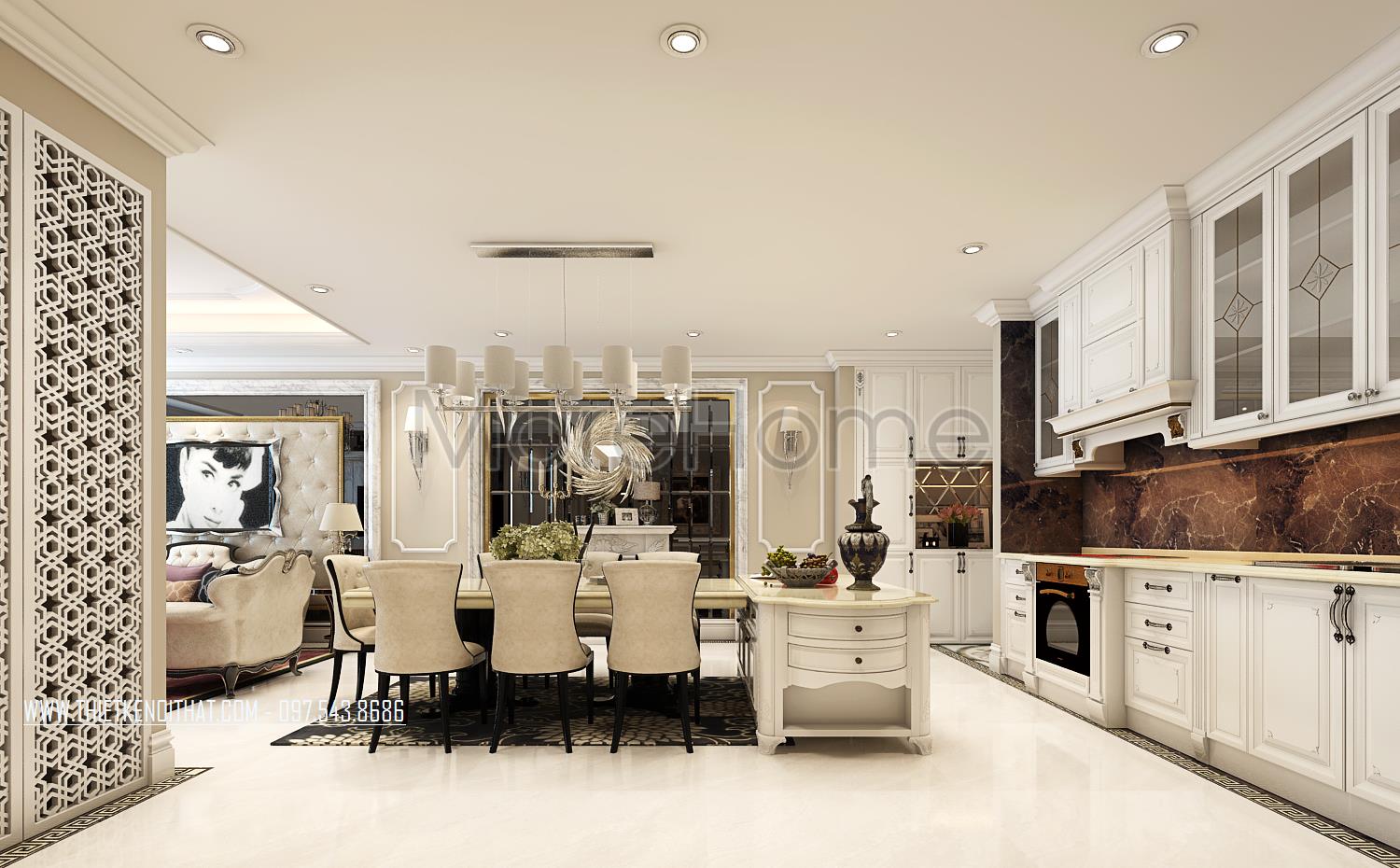 Các chi tiết trạm khắc hay đường cong tinh tế trên gỗ, tủ bếp là những điểm nhấn nhẹ nhàng mang lại điểm nhấn thẩm mỹ cho căn phòng. Một vài chi tiết trang trí khác như tranh sảnh, thảm trải sàn hay gương và thiết kế lò sưởi cách tân cũng chính là điểm nhấn sáng tạo góp phần lớn định hình phong cách thiết kế tân cổ điển cho toàn bộ khu sinh hoạt chung.