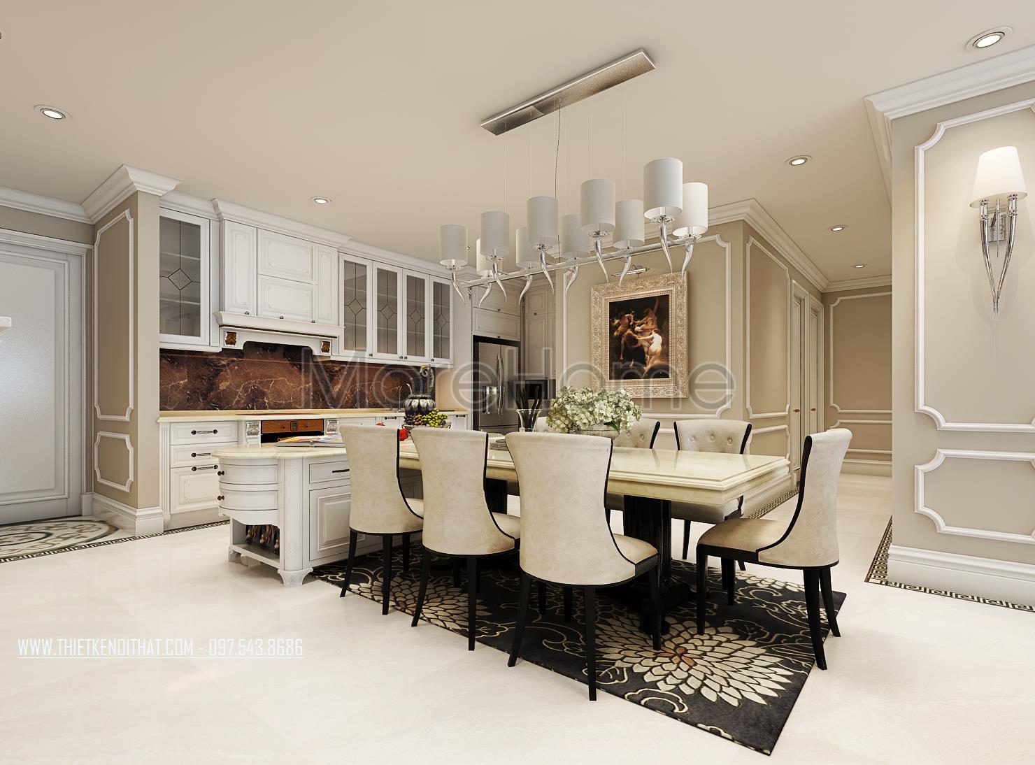 Thiết kế nội thất phòng ăn và bếp liền kề tạo sự đồng nhất và thuận tiện cho gia chủ. Thiết kế bếp dạng mở liền kề với bàn ăn không tăng độ thoáng và tầm quan sát cho căn phòng. Đối với các thiết kế chung cư, đây cũng chính là một cách khéo léo giúp khắc phục hạn chế về mặt diện tích. Thay vì các thiết kế rõ ràng được phân chia bằng cá bức tường thô cứng khá tốn diện tích thì thiết kế này lại mang đến sự thống nhất và khá thoáng mắt.