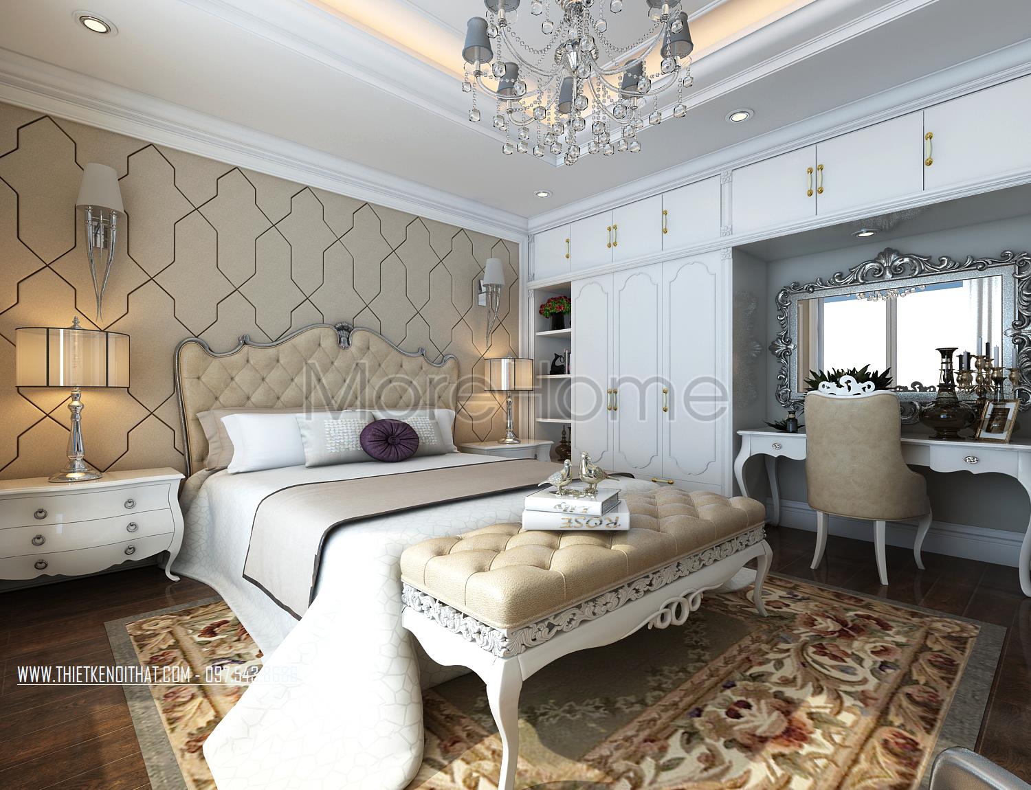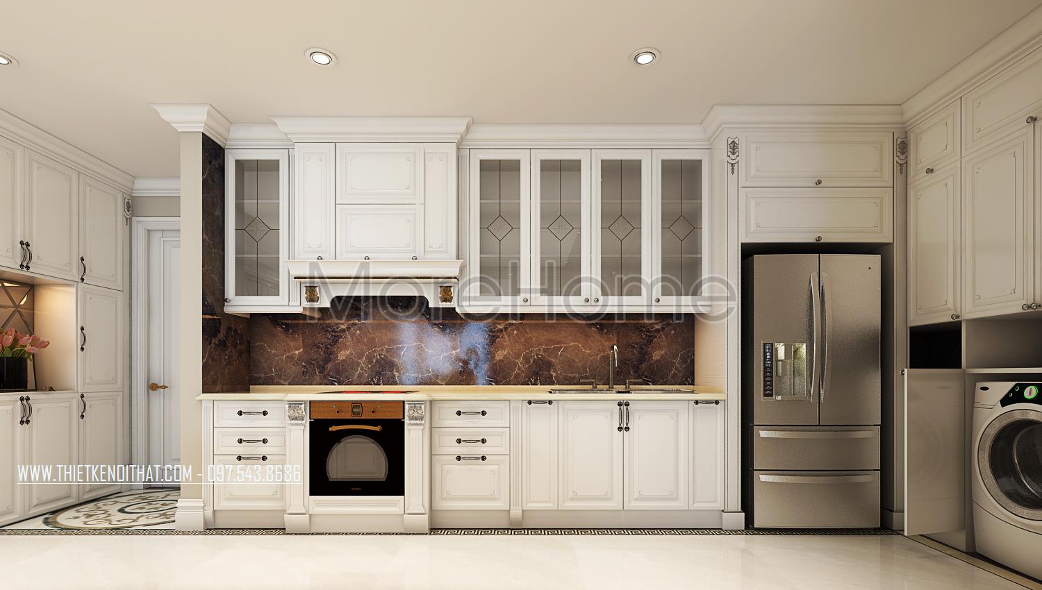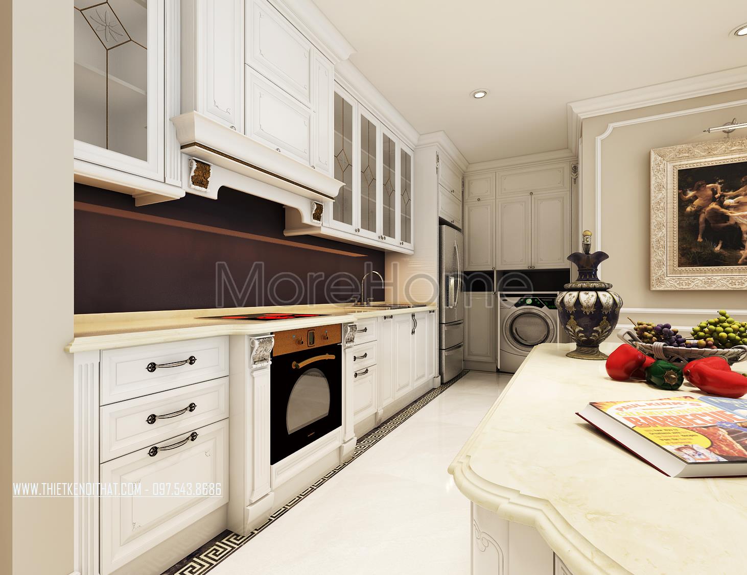 Các bức tường thô cứng được thay thế bằng thiết kế trang trí nhẹ nhàng, trạm khắc sáng tạo thổi hồn cho không gian vừa không làm mất đi tính công năng của sản phẩm lại giúp cá thiết kế trở nên thật đặc biệt và ấn tượng. Tuy nhiên với thiết kế cầu kỳ của tân cổ điển, gia chủ sẽ gặp một chút vấn đề khi dọn dẹp, vệ sinh sản phẩm.