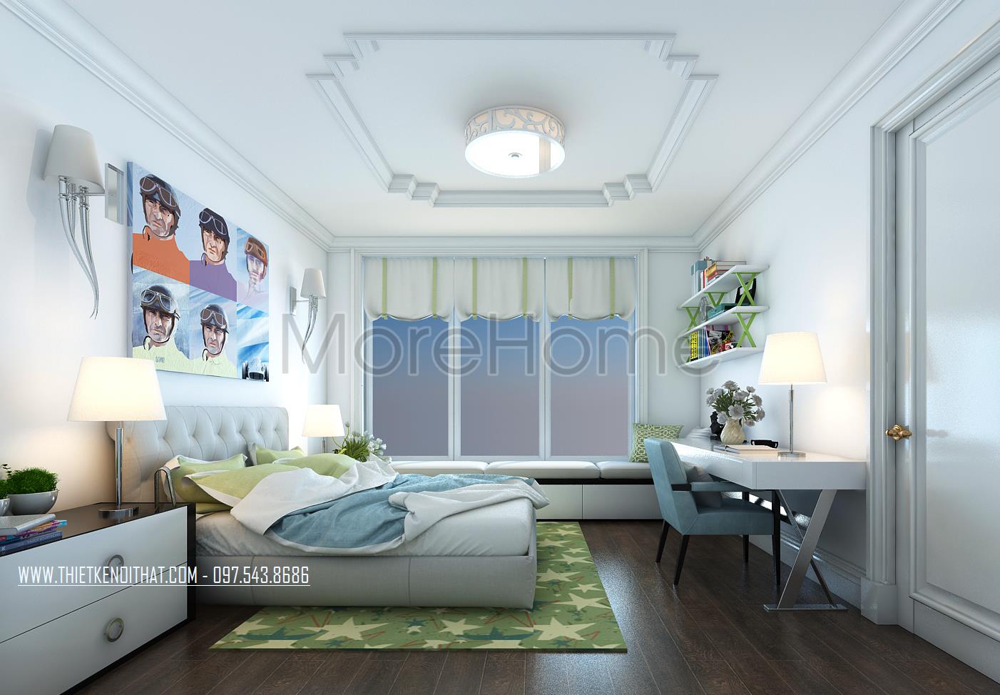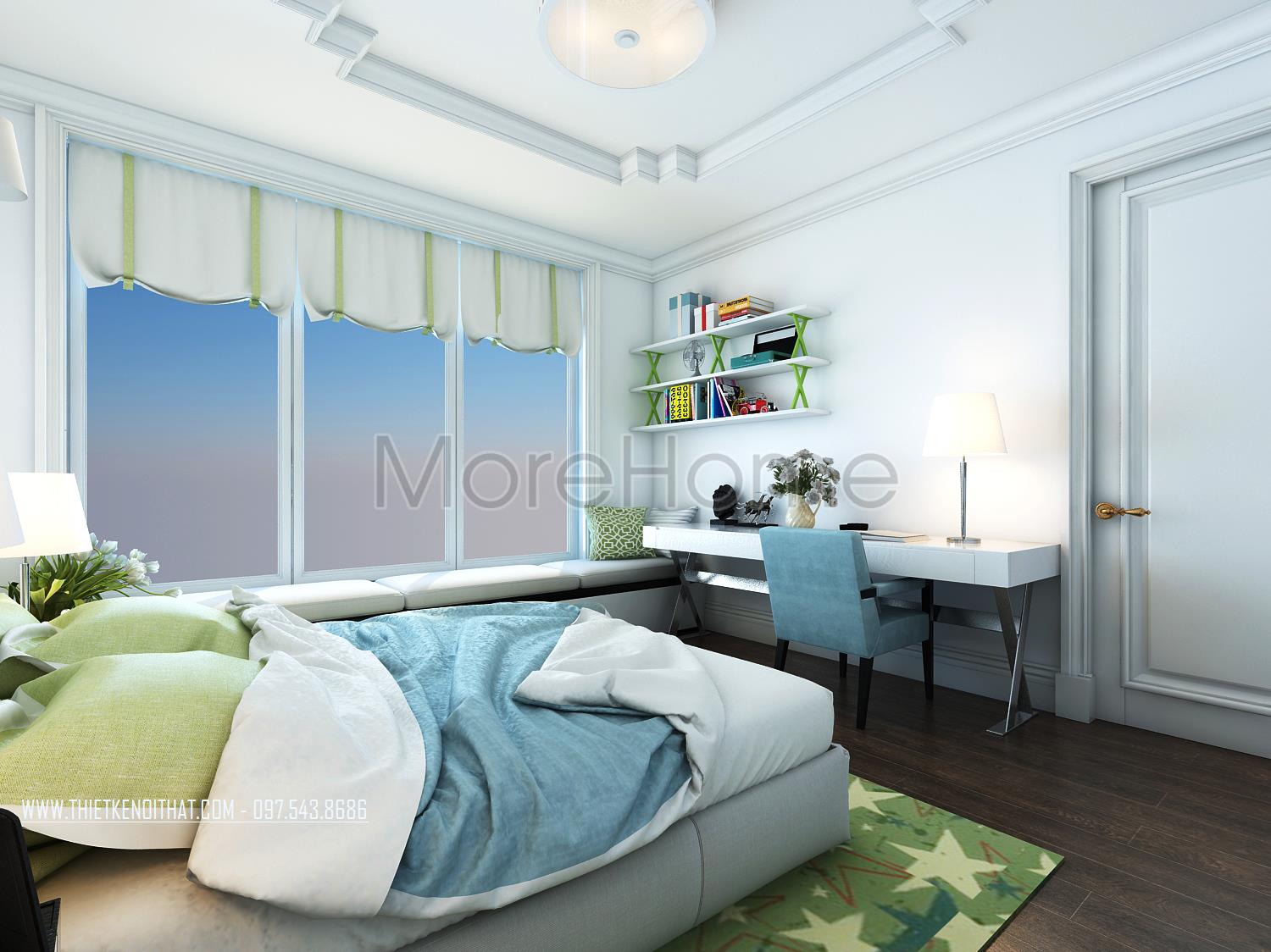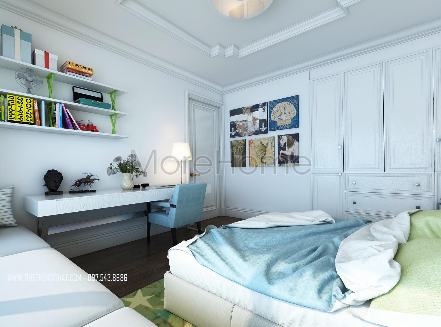 Thiết kế nội thất phòng ngủ cho trẻ sử dụng tone màu xanh da trời dịu mát tạo điểm nhấn và mang đến sự bình yên cho trẻ. Ánh sáng tự nhiên được tận dụng từ khung cửa rộng giúp mang lại hứng khởi và sự tự nhiên cho căn phòng. Gỗ thanh ngang với tone màu trắng sáng không quá cầu kỳ trong kiểu dáng là điểm nhấn mang đến sự hài hòa và tăng tính công năng cho căn phòng.