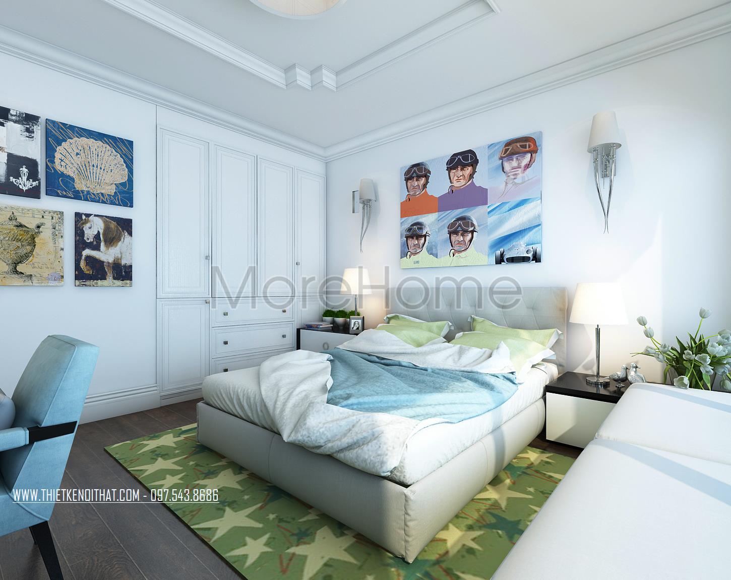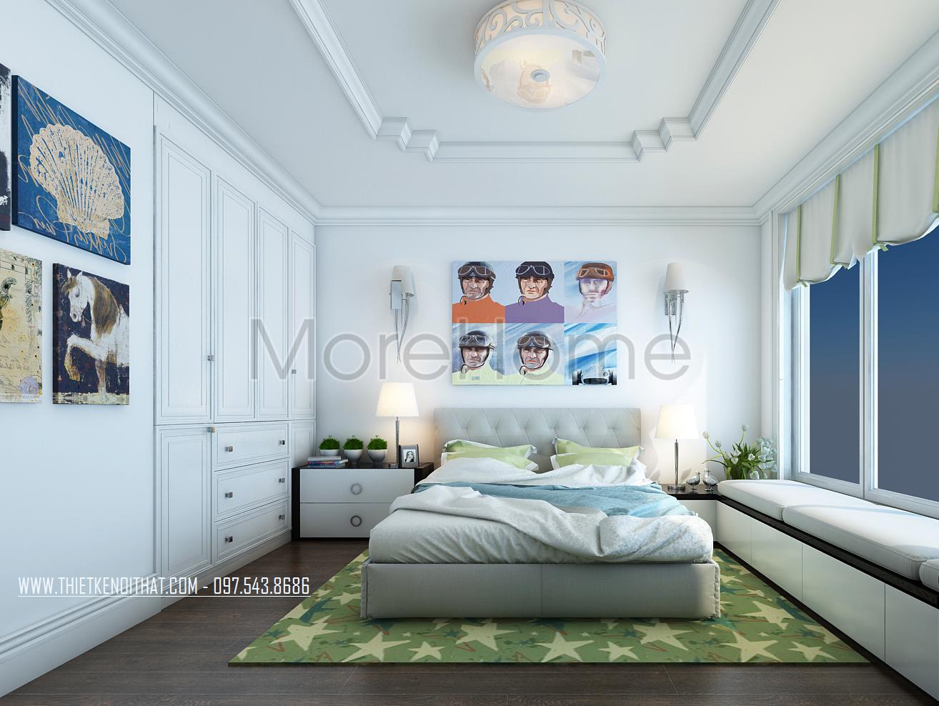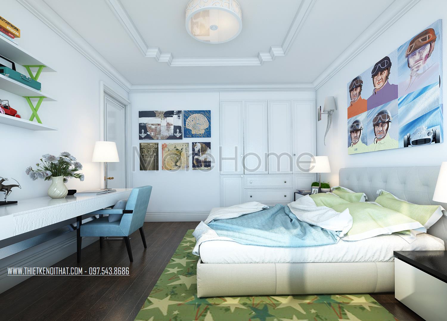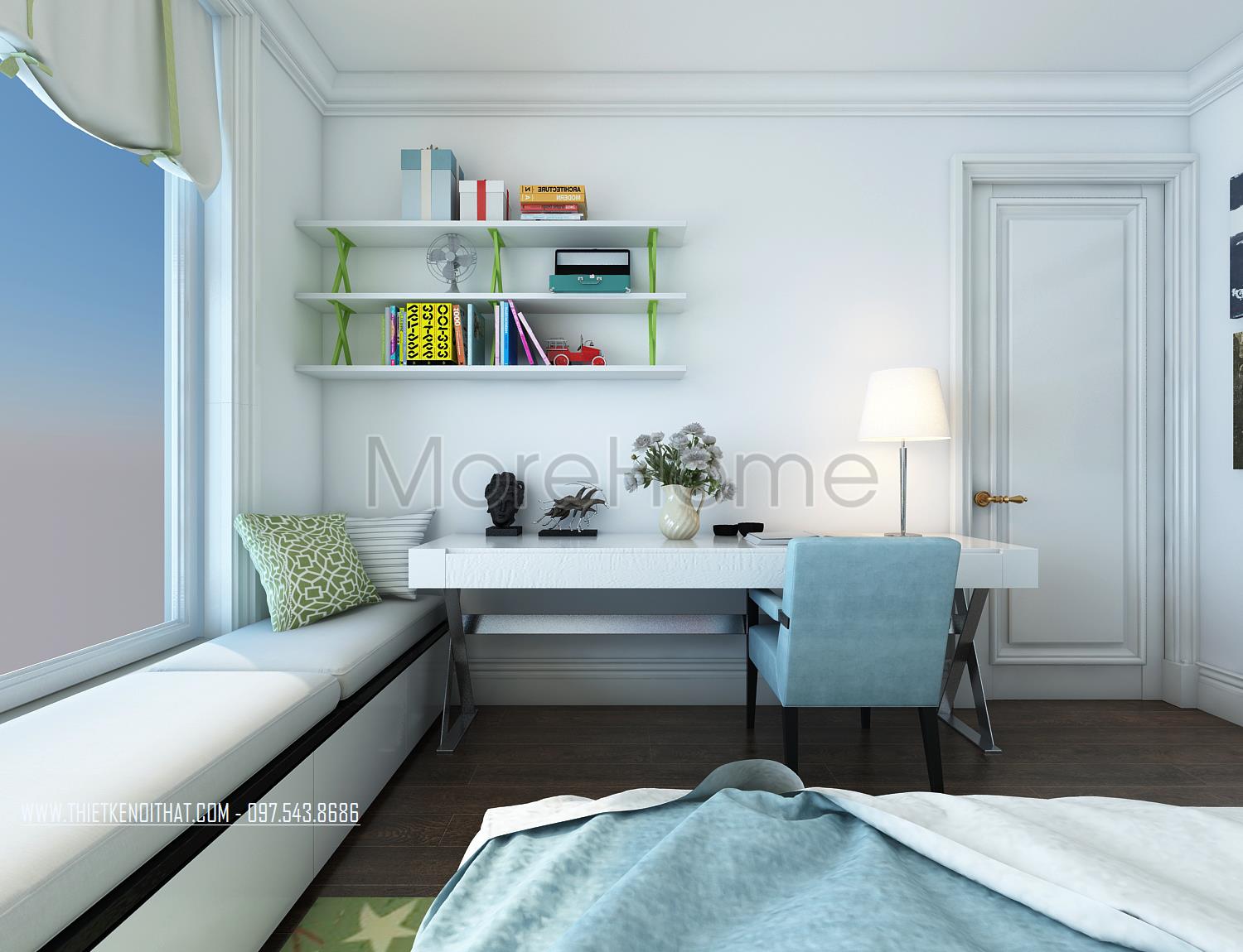 Thiết kế nội thất phòng ngủ cho trẻ sử dụng tone màu xanh da trời dịu mát tạo điểm nhấn và mang đến sự bình yên cho trẻ. Ánh sáng tự nhiên được tận dụng từ khung cửa rộng giúp mang lại hứng khởi và sự tự nhiên cho căn phòng. Gỗ thanh ngang với tone màu trắng sáng không quá cầu kỳ trong kiểu dáng là điểm nhấn mang đến sự hài hòa và tăng tính công năng cho căn phòng.