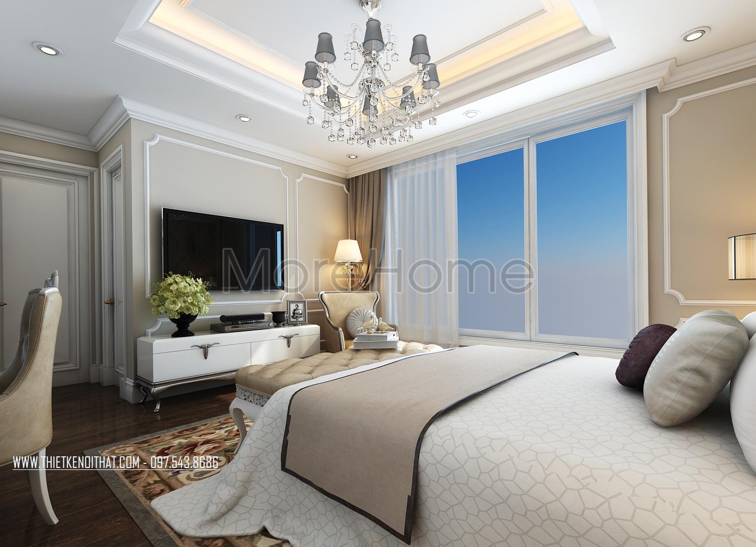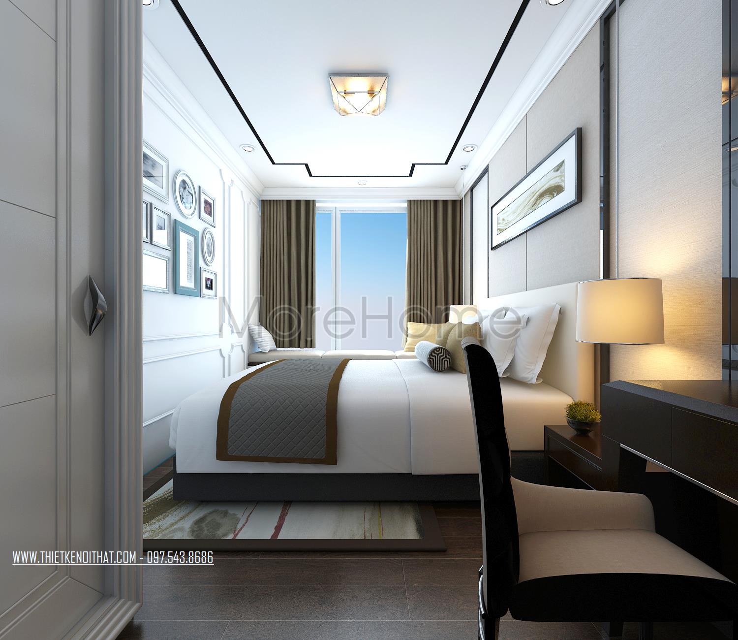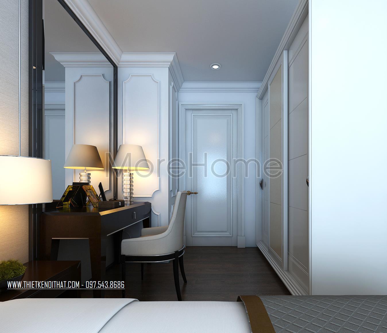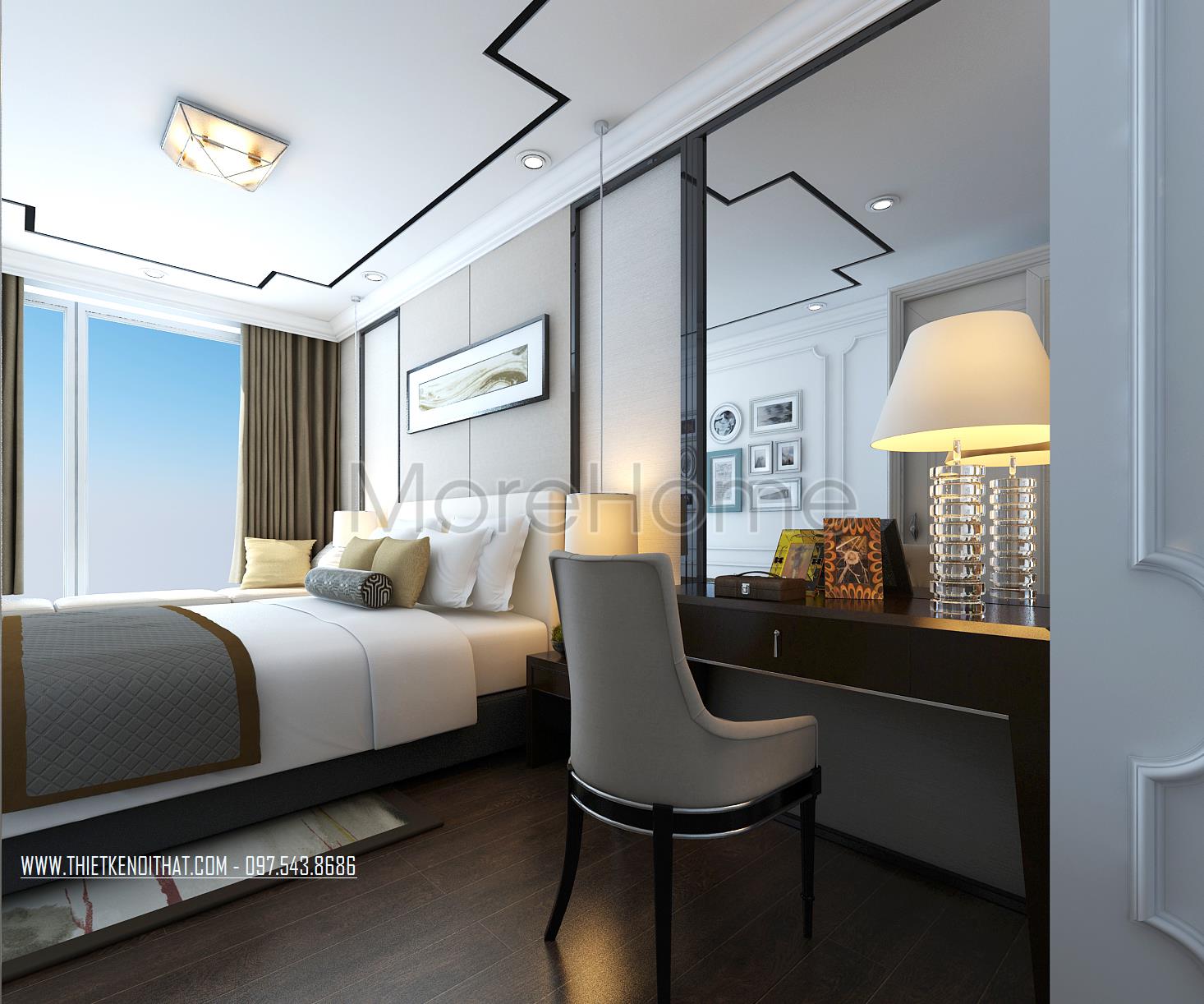 Thiết kế nội thất phòng ngủ Master sử dụng tone màu nâu sáng làm mang đến sự nổi trội cho căn phòng. Thiết kế tủ âm tường kết hợp không gian bàn trang điểm và tủ sách là một ý tưởng kết hợp không tồi vừa tiết kiện diện tích lại mang lại điểm nhấn cách tân cho căn phòng. Khung cửa rộng mang ánh sáng tự nhiên và tạo sự cân bằng trong thiết kế màu sắc, không gian.