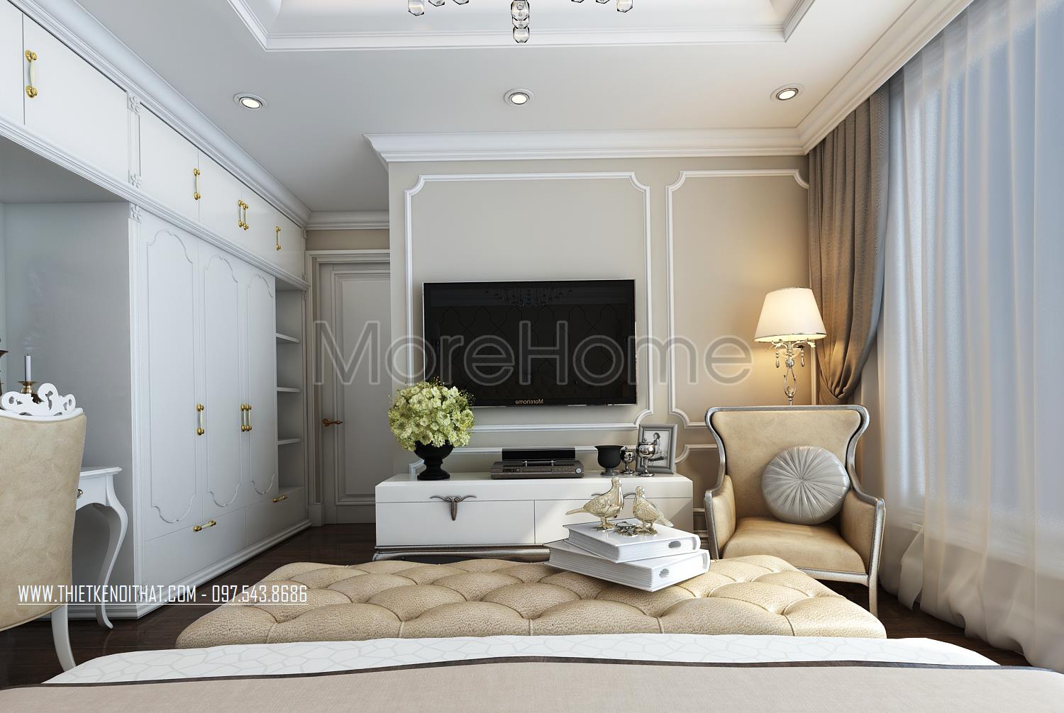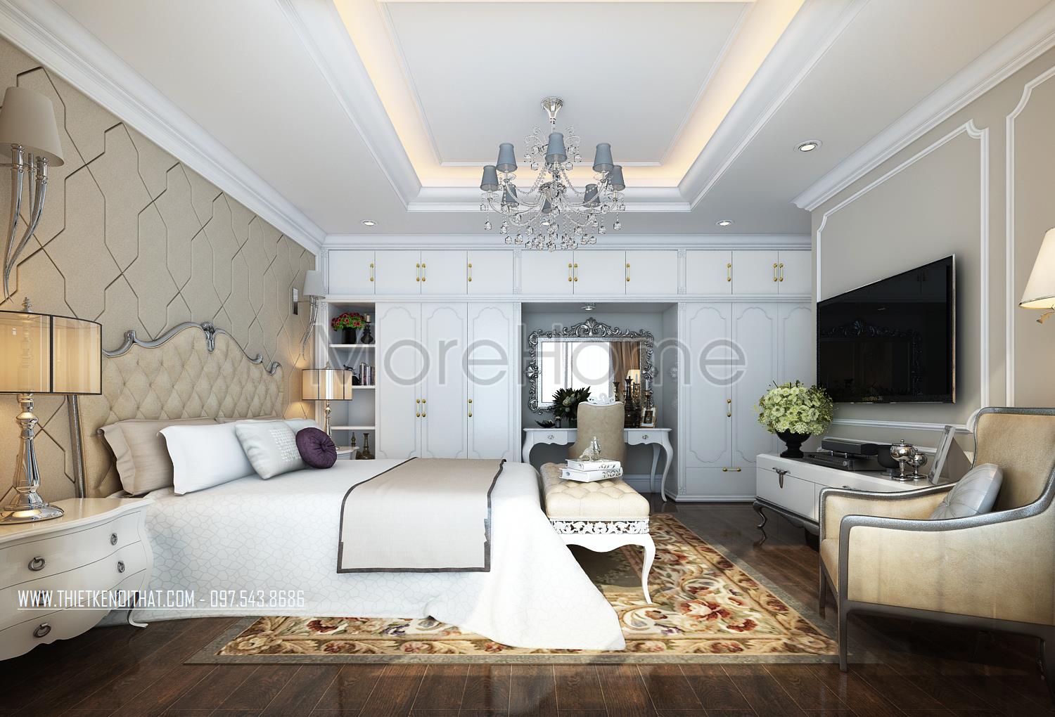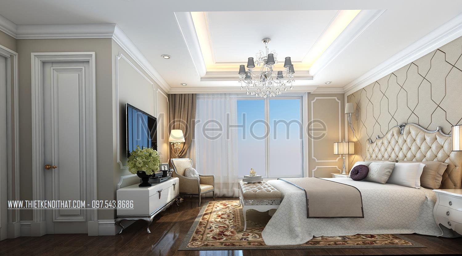 Thiết kế nội thất phòng ngủ Master sử dụng tone màu nâu sáng làm mang đến sự nổi trội cho căn phòng. Thiết kế tủ âm tường kết hợp không gian bàn trang điểm và tủ sách là một ý tưởng kết hợp không tồi vừa tiết kiện diện tích lại mang lại điểm nhấn cách tân cho căn phòng. Khung cửa rộng mang ánh sáng tự nhiên và tạo sự cân bằng trong thiết kế màu sắc, không gian.