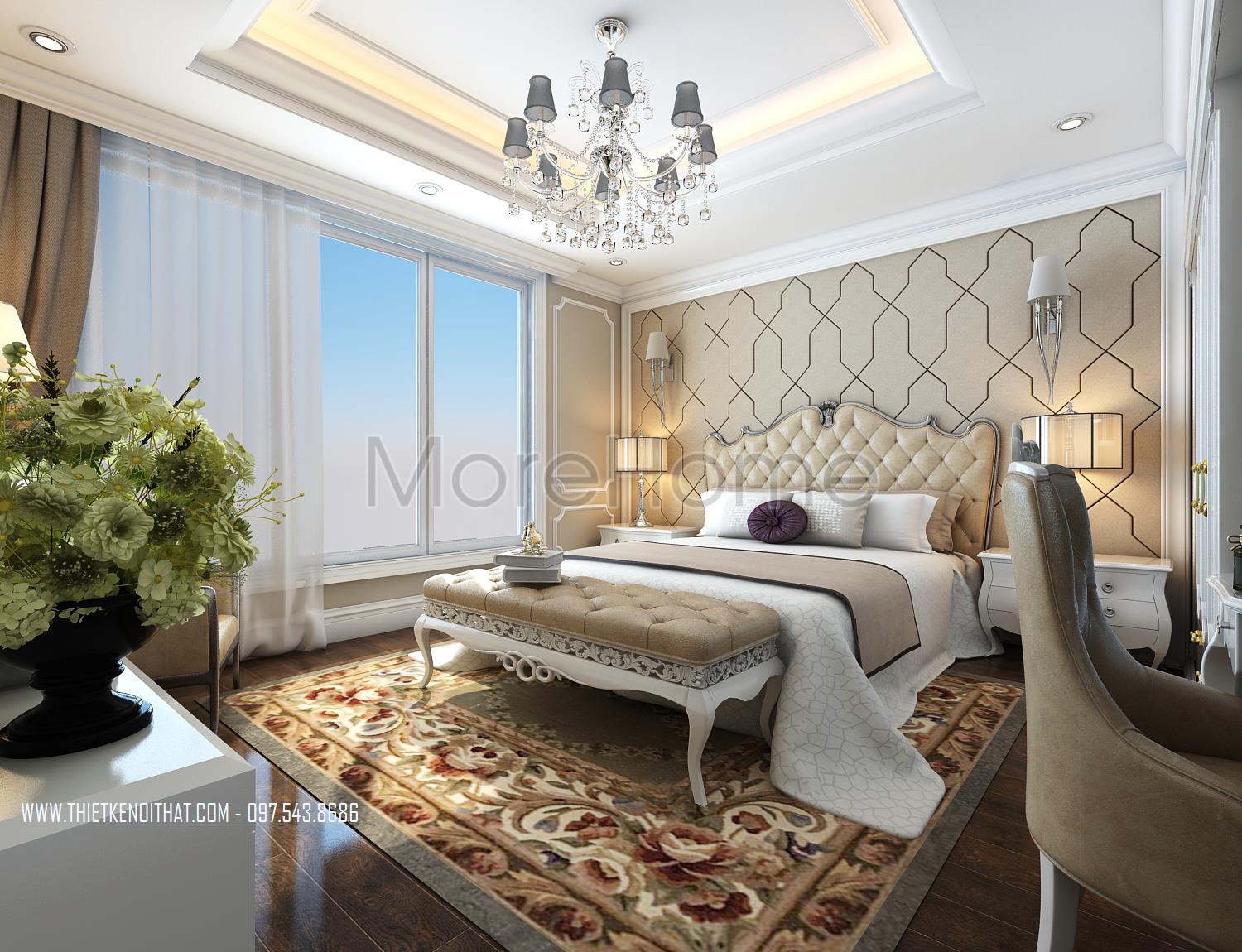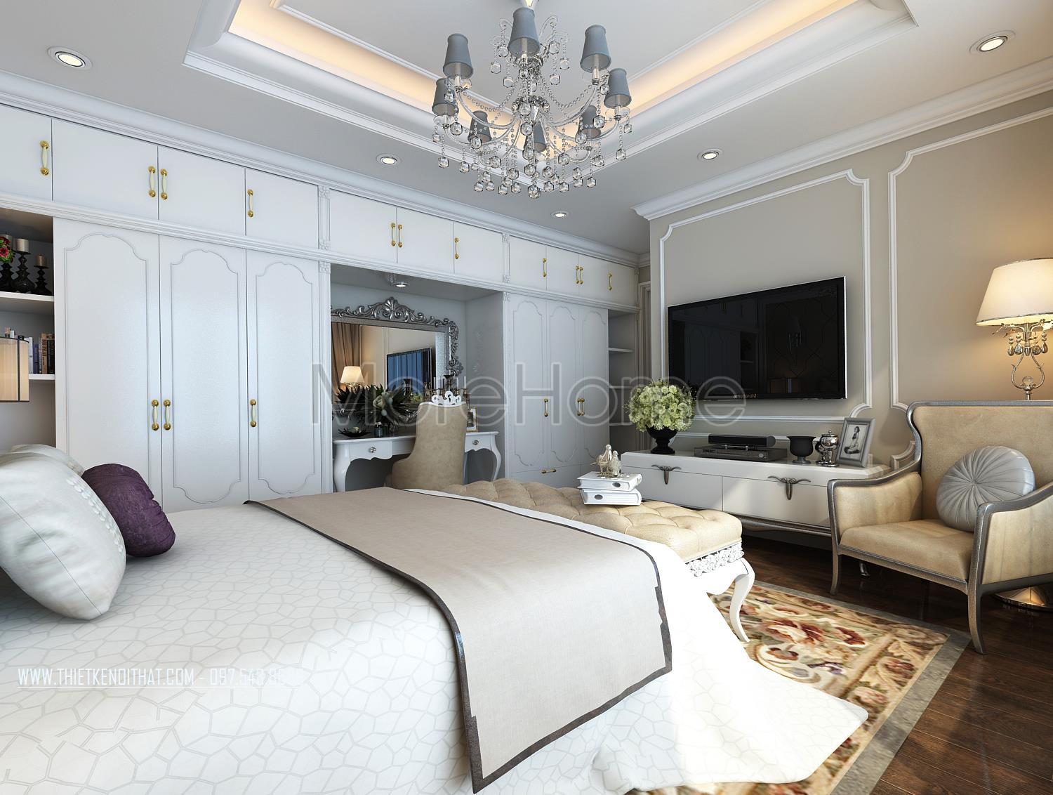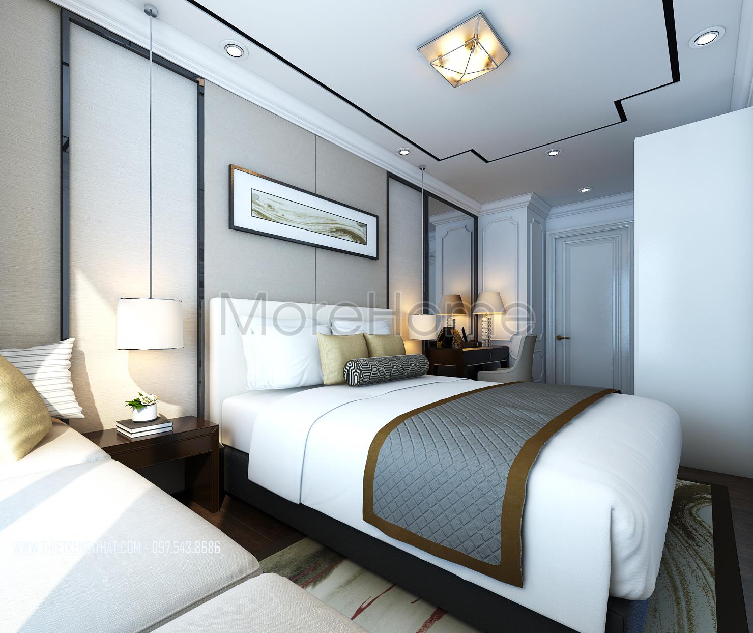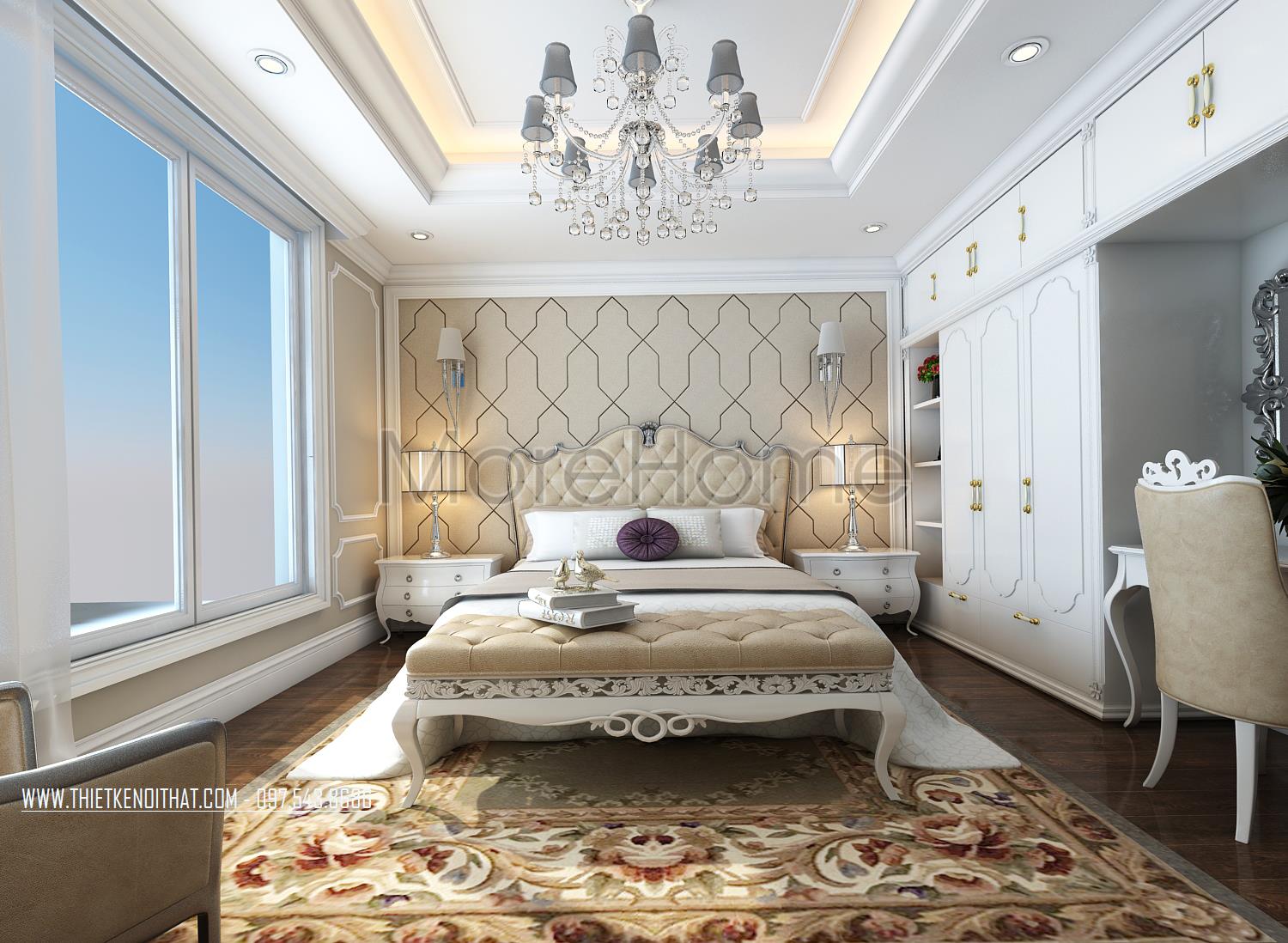 Thiết kế nội thất phòng ngủ Master sử dụng tone màu nâu sáng làm mang đến sự nổi trội cho căn phòng. Thiết kế tủ âm tường kết hợp không gian bàn trang điểm và tủ sách là một ý tưởng kết hợp không tồi vừa tiết kiện diện tích lại mang lại điểm nhấn cách tân cho căn phòng. Khung cửa rộng mang ánh sáng tự nhiên và tạo sự cân bằng trong thiết kế màu sắc, không gian.