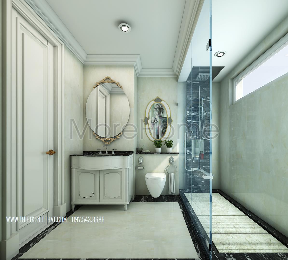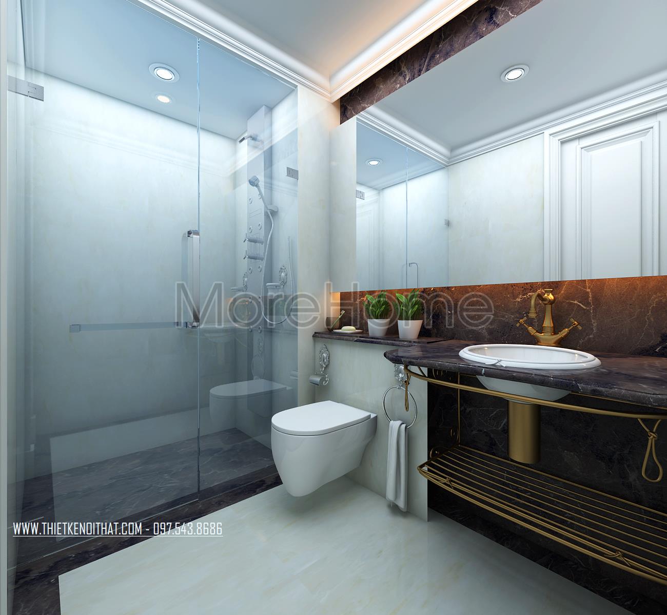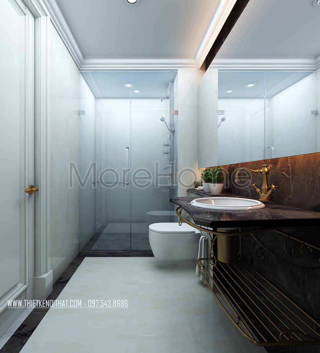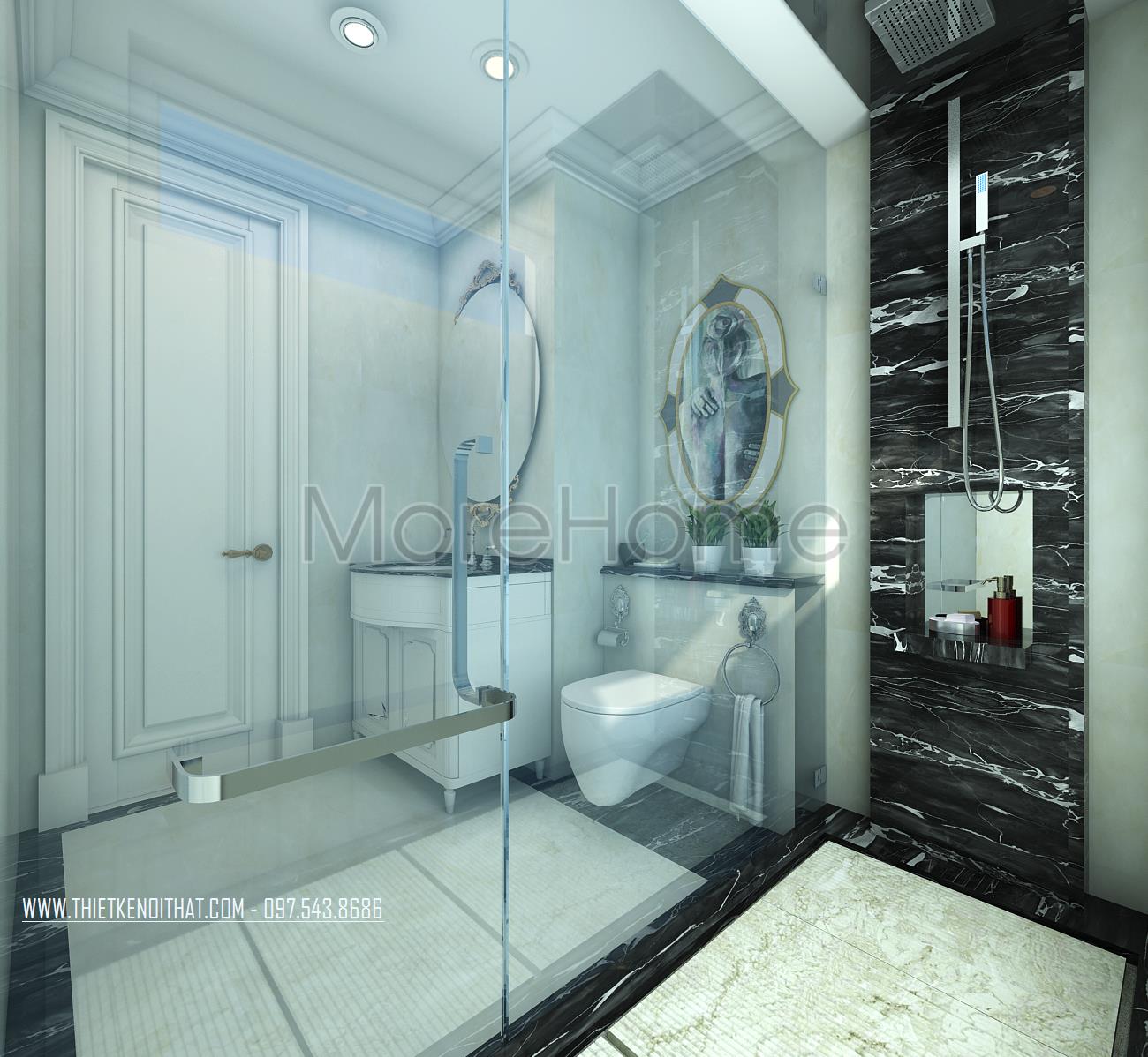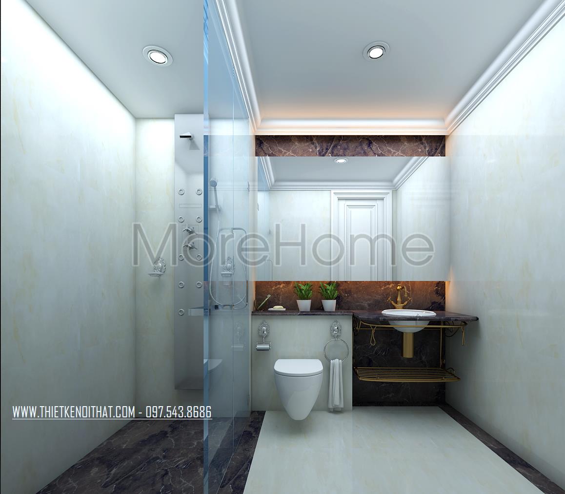 Cuối cùng là thiết kế nội thất nhà vệ sinh. Các vật liệu nhẹ như kính cường lực và gương được sử dụng mang đến sự tinh tế và hiện đại cho thiết kế. Bên cạnh đó các thiết kế trong suốt này còn giúp mang lại độ mở và tạo sự phản chiếu nhẹ nhàng cho không gian.