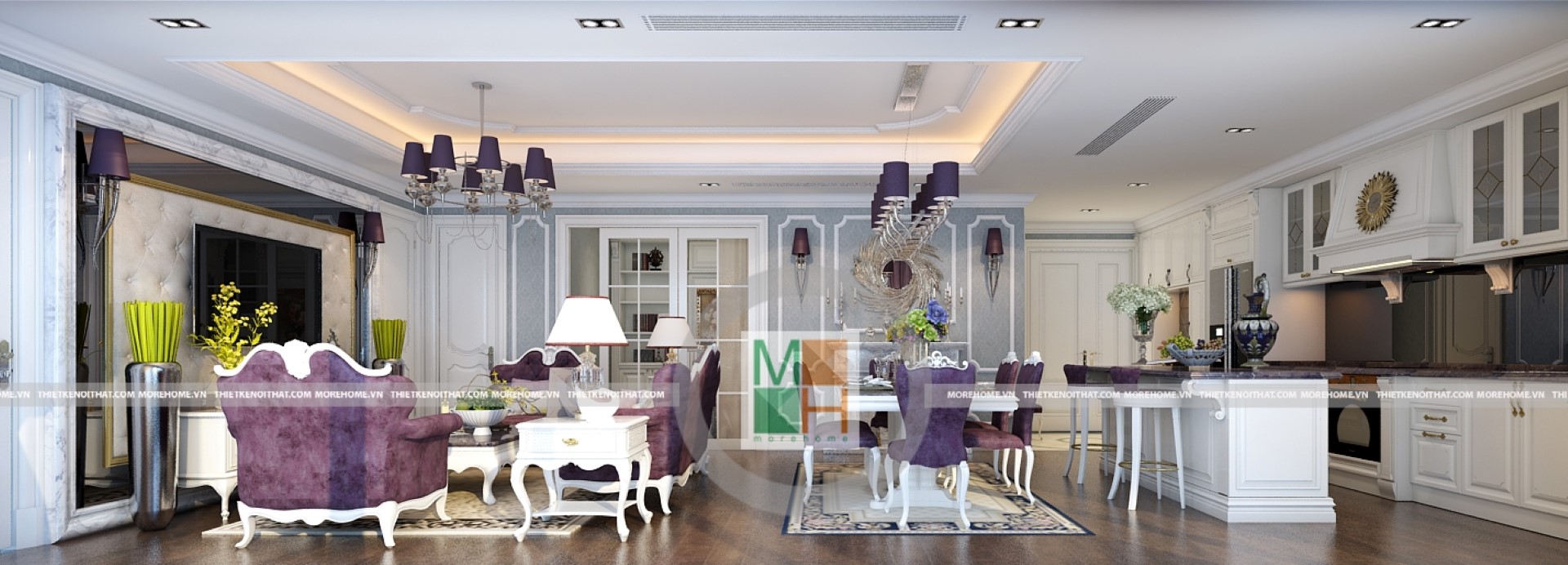 Thiết kế nội thất phòng khách tân cổ điển căn hộ Imperia Garden sử dụng tone màu nhung tím làm điểm nhấn giúp tạo sự cân bằng về màu sắc trong thiết kế. Bộ salong với thiết kế to, rộng tạo khối hình vuông gọn gàng đem lại cảm giác vững chãi và an toàn cho gia chủ. Các chi tiết đường cong nhẹ nhàng trên tay vịn hay trên bàn nhỏ chính là điểm nhấn tân cổ điển nhẹ nhàng góp phần định hình phong cách thiết kế của căn hộ. Ngoài ra, thiết kế căn hộ sử dụng gương phản chiếu và kính cường lực là một dụng ý của kiến trúc sư giúp mang lại cảm giác cơi nới cho căn nhà.