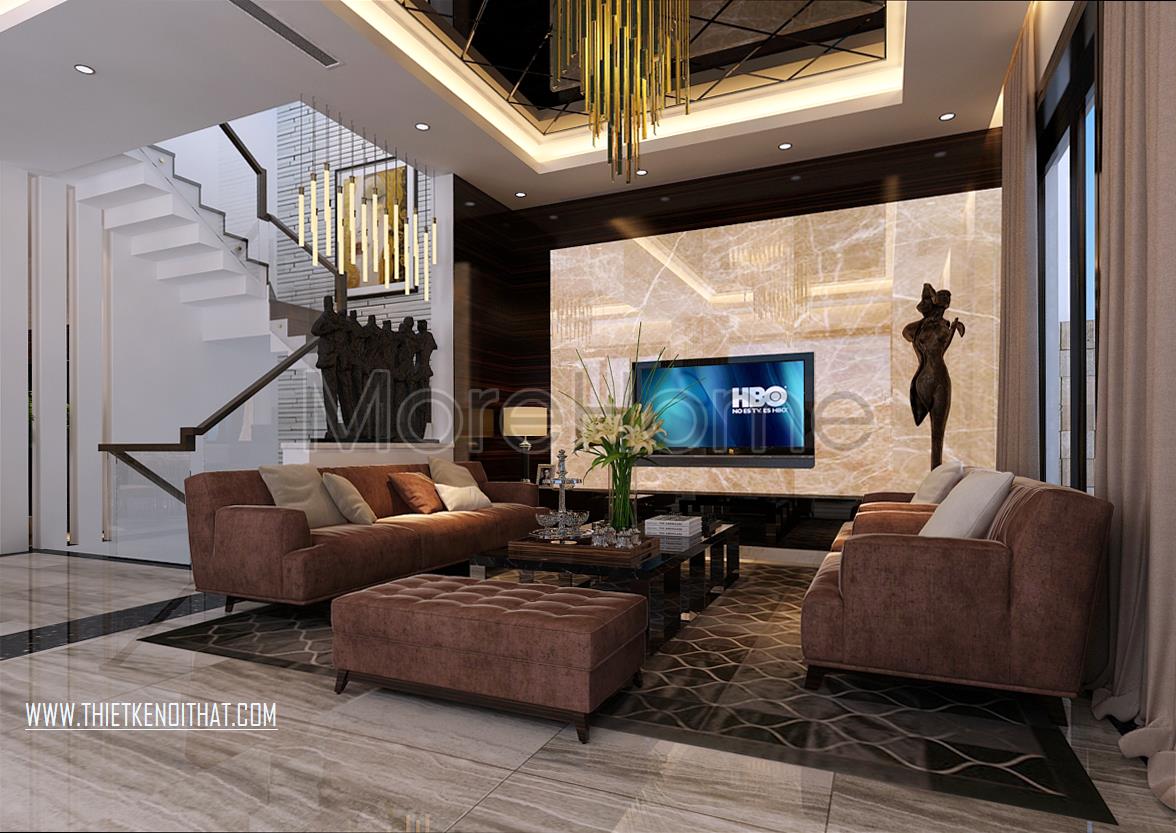 Thiết kế nội thất phòng khách hiện đại sử dụng tone màu nâu trầm làm chủ yếu mang lại cảm giác ấm áp và gần gũi cho gia chủ. Bộ sofa to và rộng được khéo léo sử dụng tạo cảm giác chắc chắn và an toàn cho gia chủ.