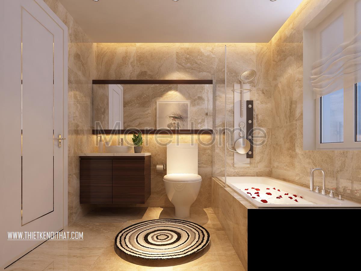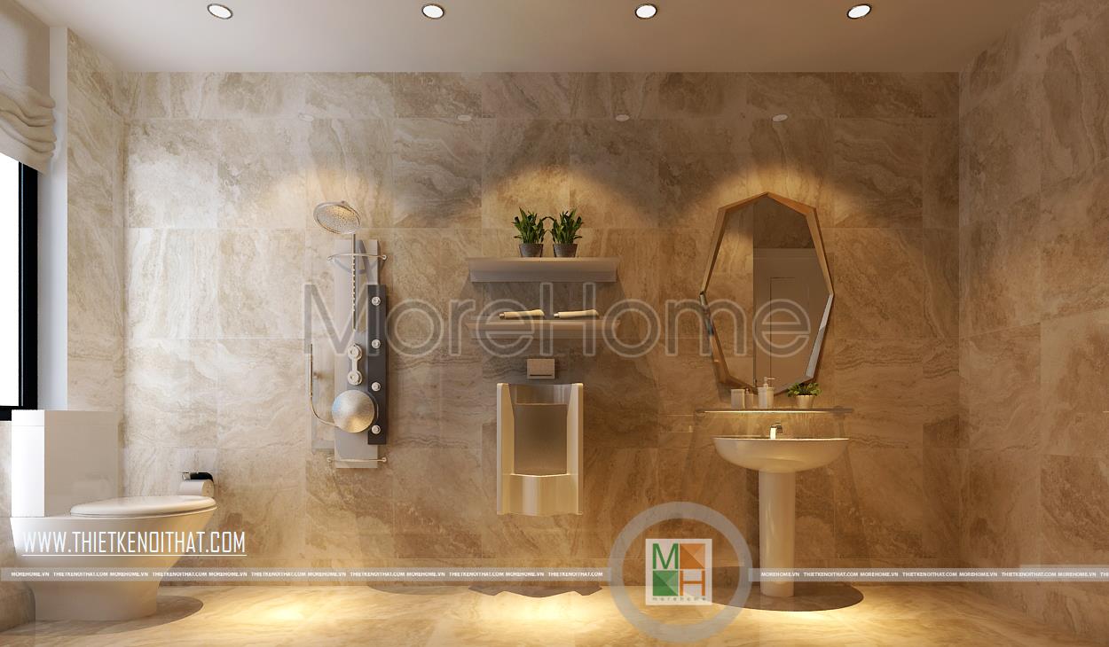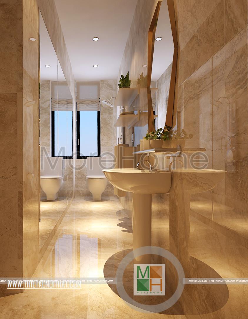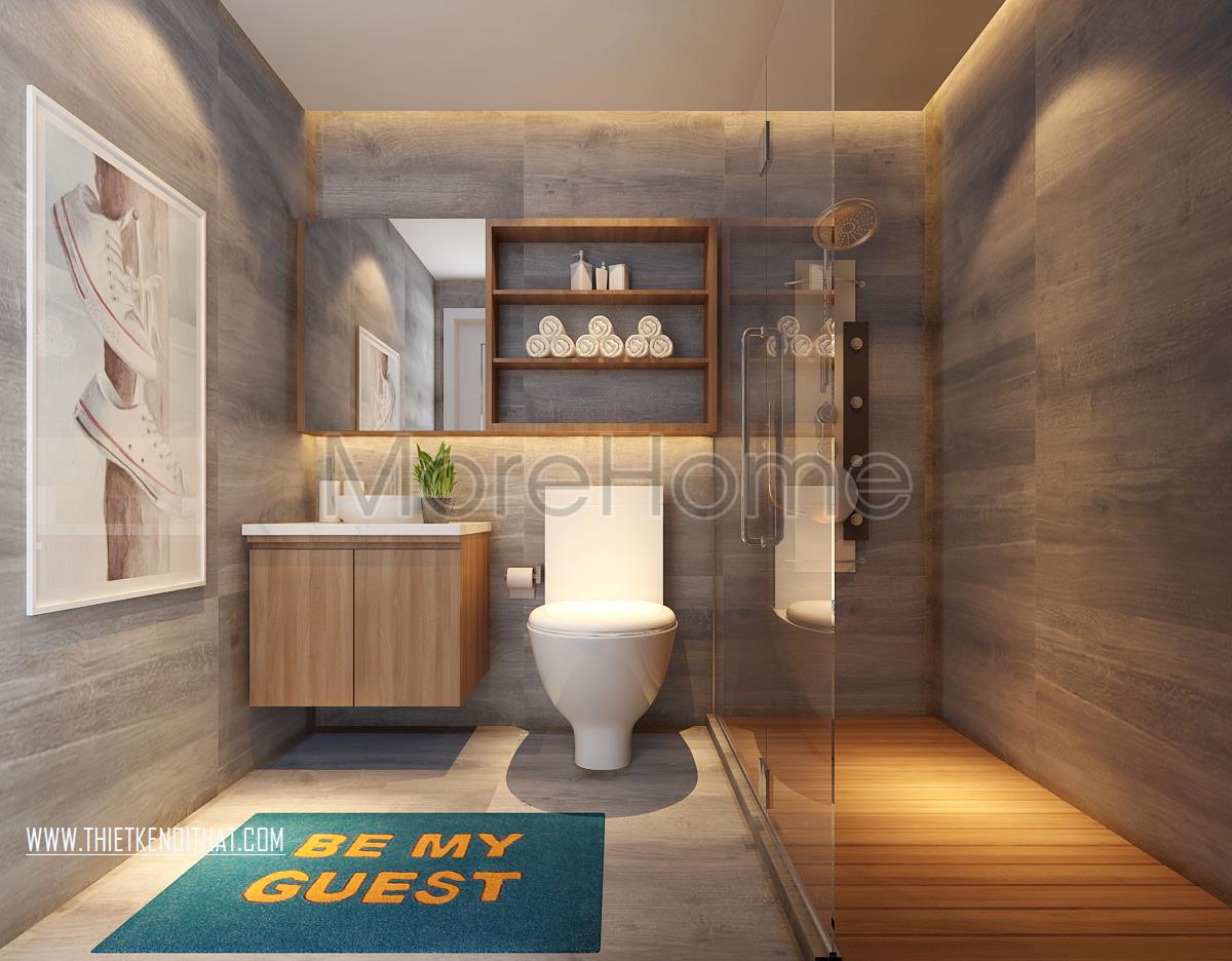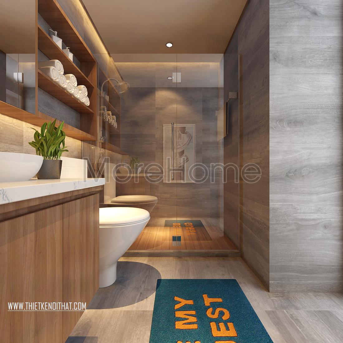 Không gian nhà vệ sinh được thiết kế gọn gàng, các vật liệu nhẹ như kính trong suốt và gỗ được sử dụng giúp tạo độ thoáng và mở cho căn phòng. Việc sử dụng gương và kính trong suốt cũng chính là biện pháp thường xuyên được sử dụng trong thiết kế tạo độ phản chiếu thích hợp giúp mang lại cảm giác cơi nới không gian.