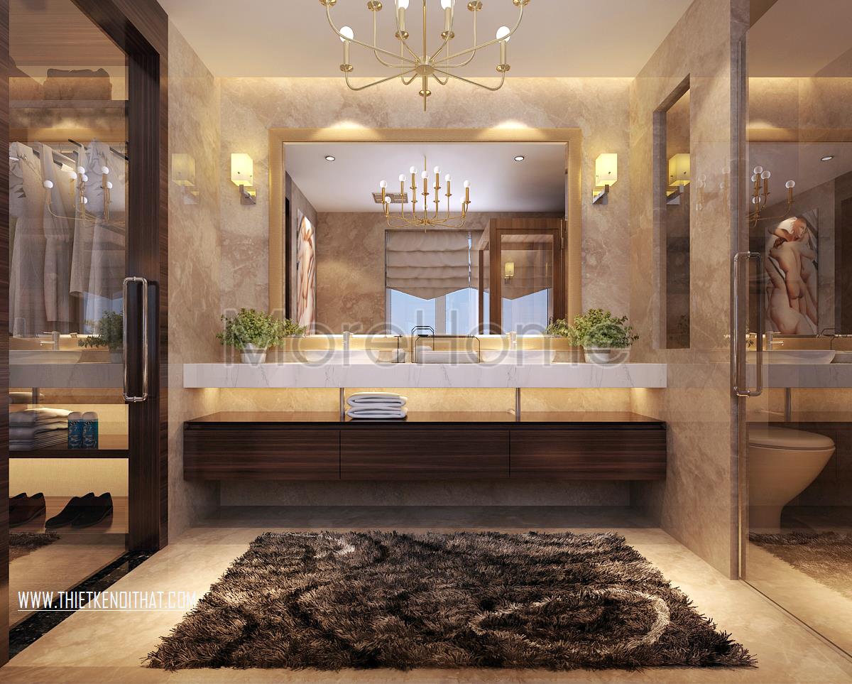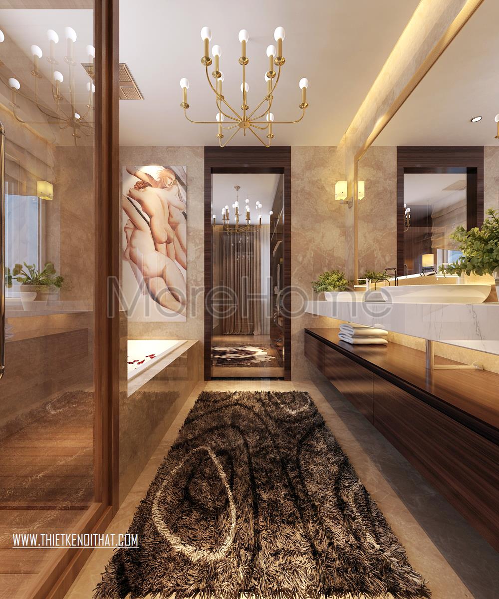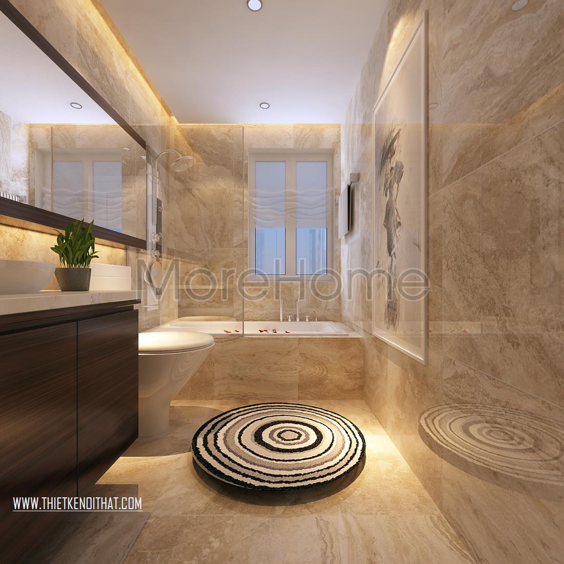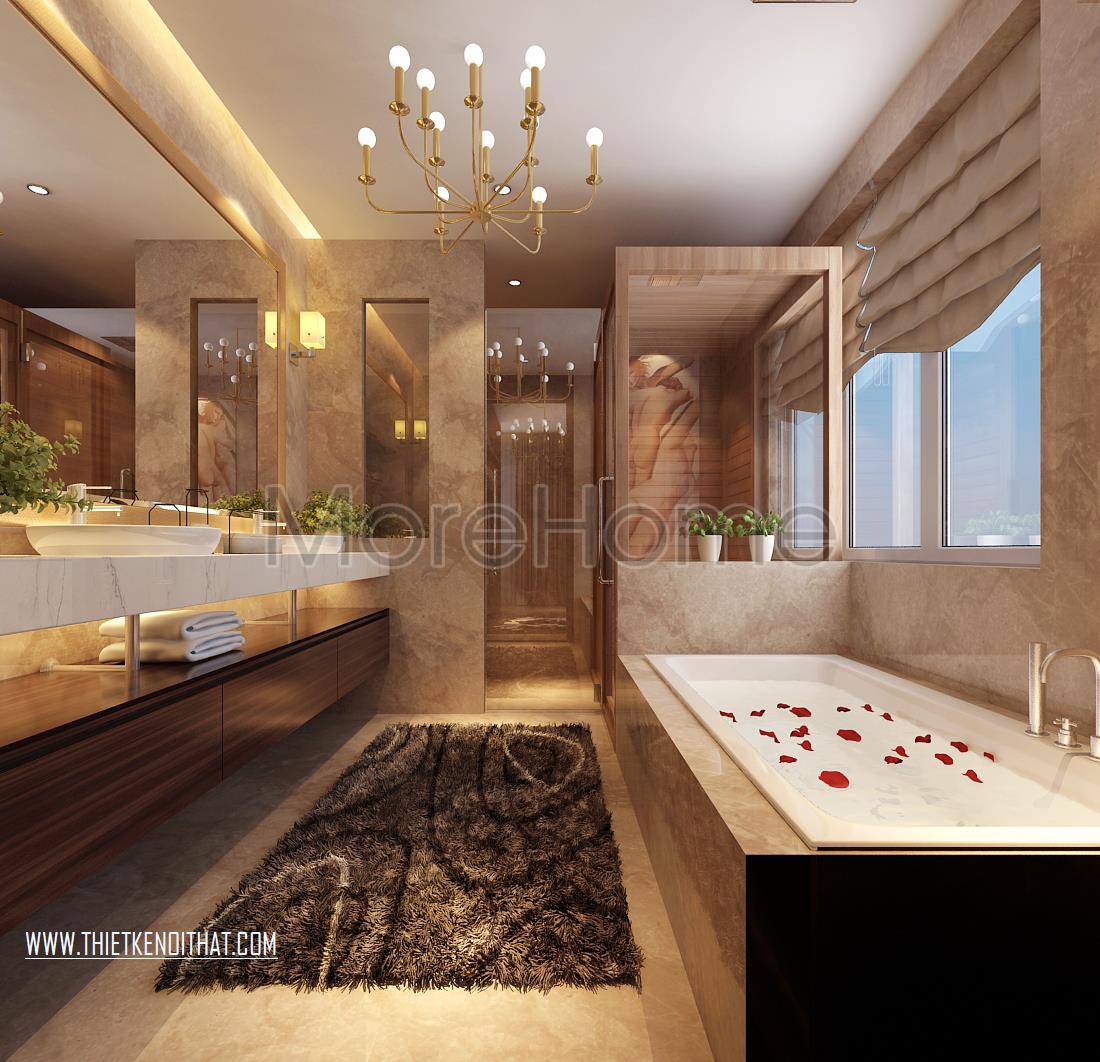 Không gian nhà vệ sinh được thiết kế gọn gàng, các vật liệu nhẹ như kính trong suốt và gỗ được sử dụng giúp tạo độ thoáng và mở cho căn phòng. Việc sử dụng gương và kính trong suốt cũng chính là biện pháp thường xuyên được sử dụng trong thiết kế tạo độ phản chiếu thích hợp giúp mang lại cảm giác cơi nới không gian.