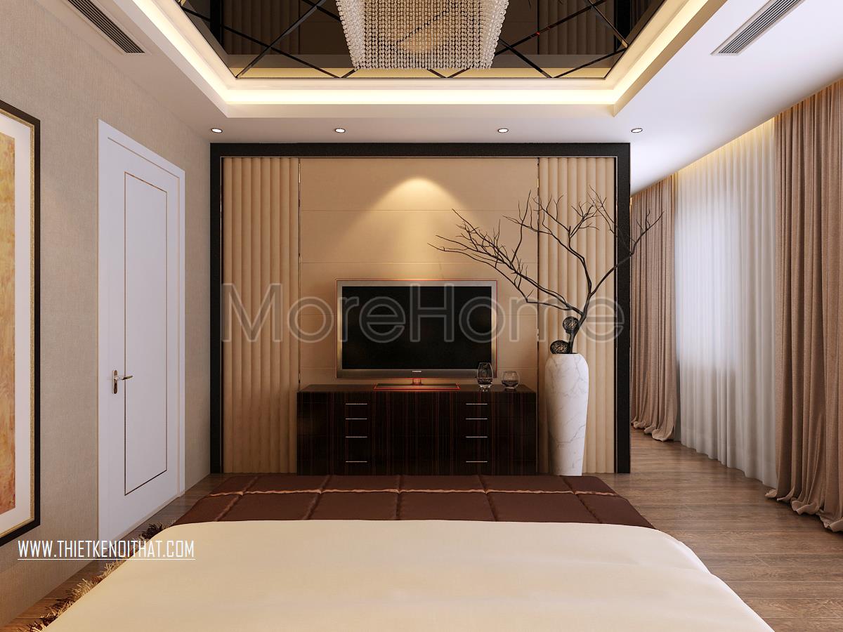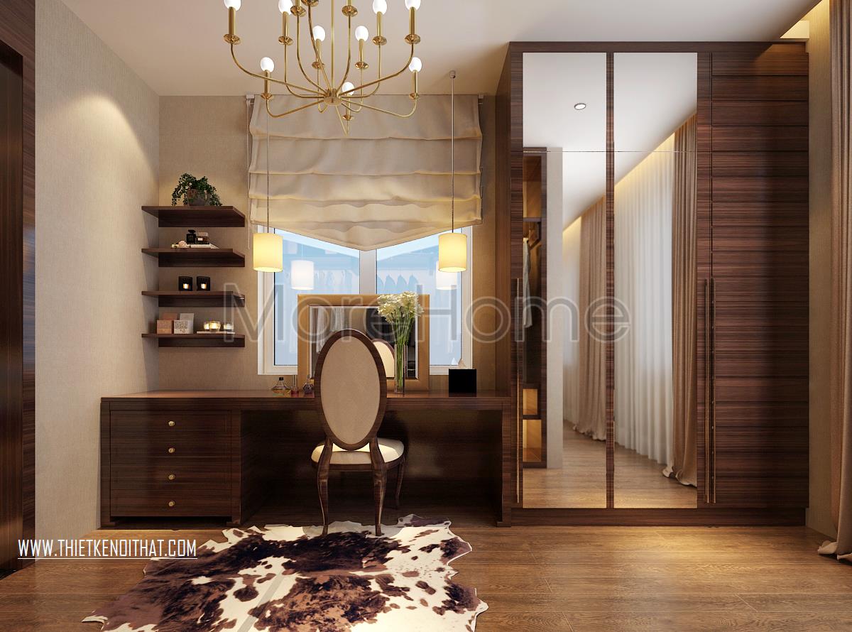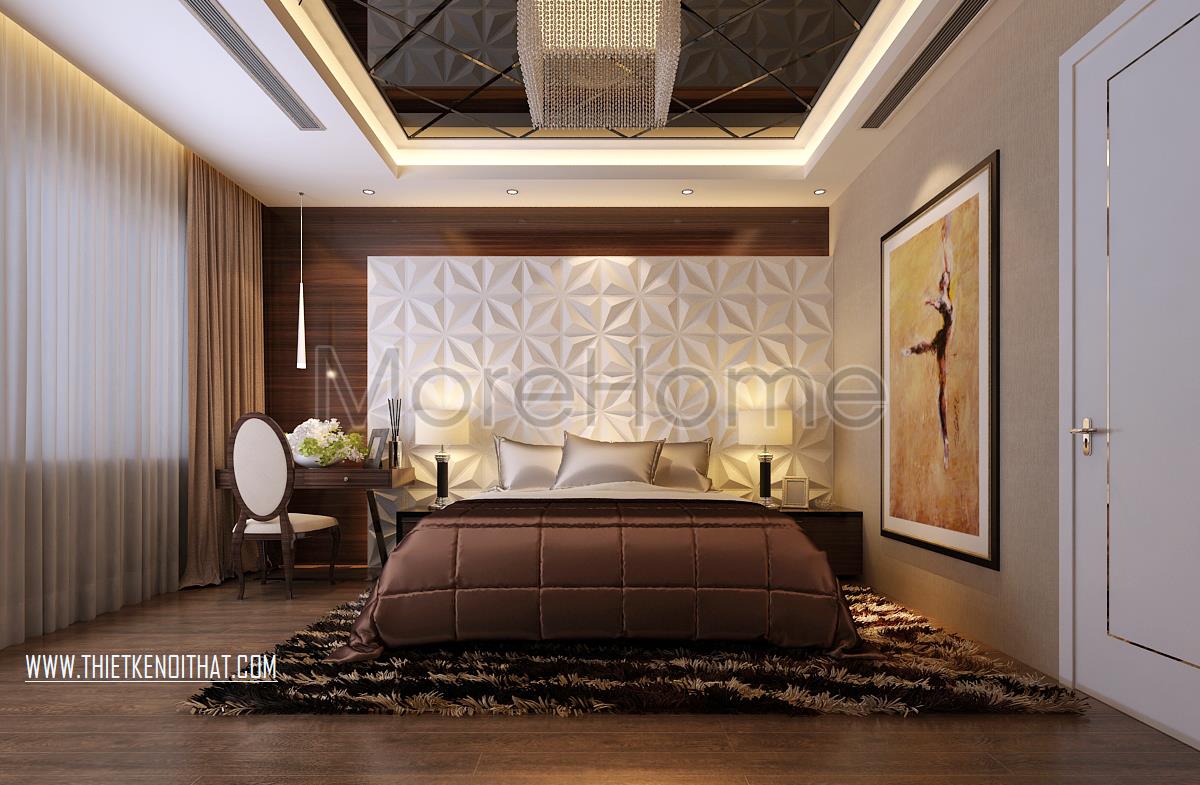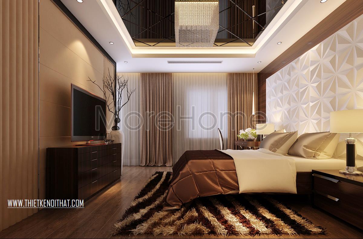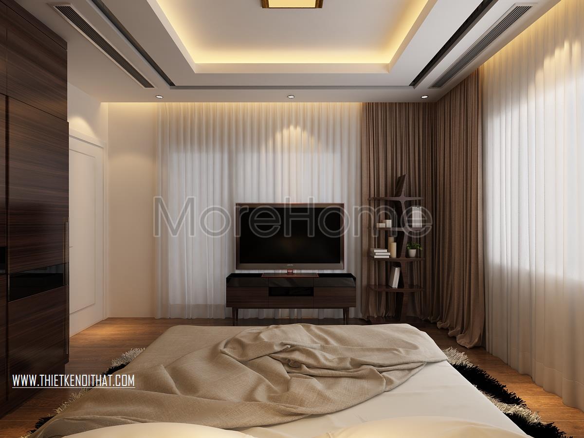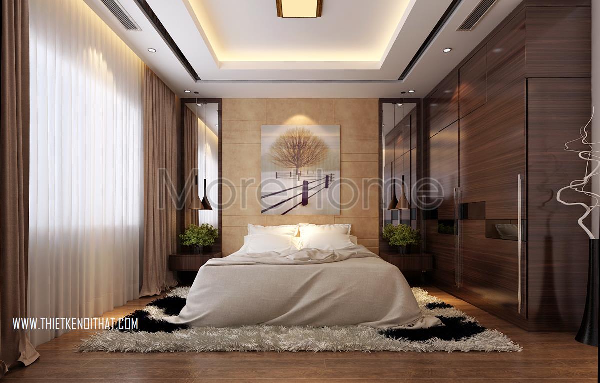 Còn với thiết kế phòng ngủ Master, kiến trúc sư khéo léo chia nhỏ không gian các các góc riêng biệt mang đến sự thoải mái cho gia chủ. Không gian làm việc, hay tủ quần áo được bố trí riêng, tạo vách ngăn với không gian nghỉ theo ý muốn của gia chủ.