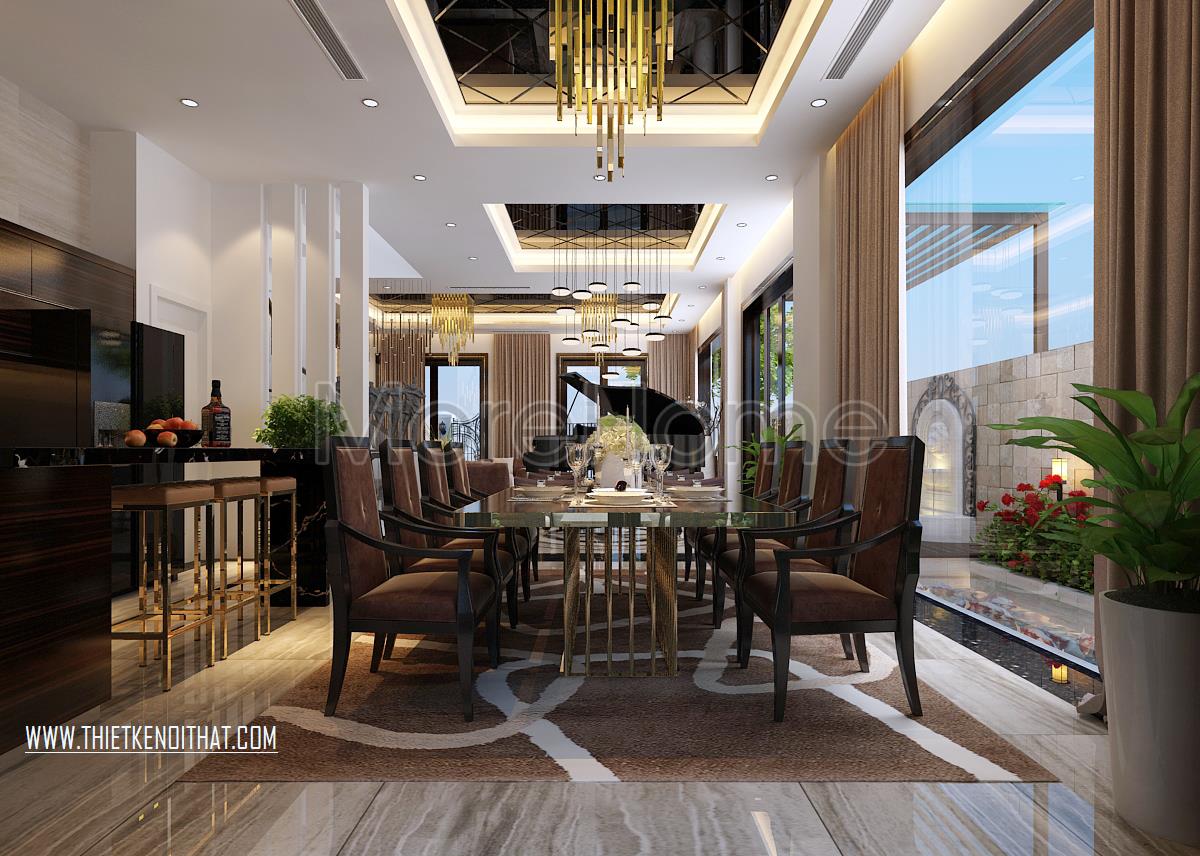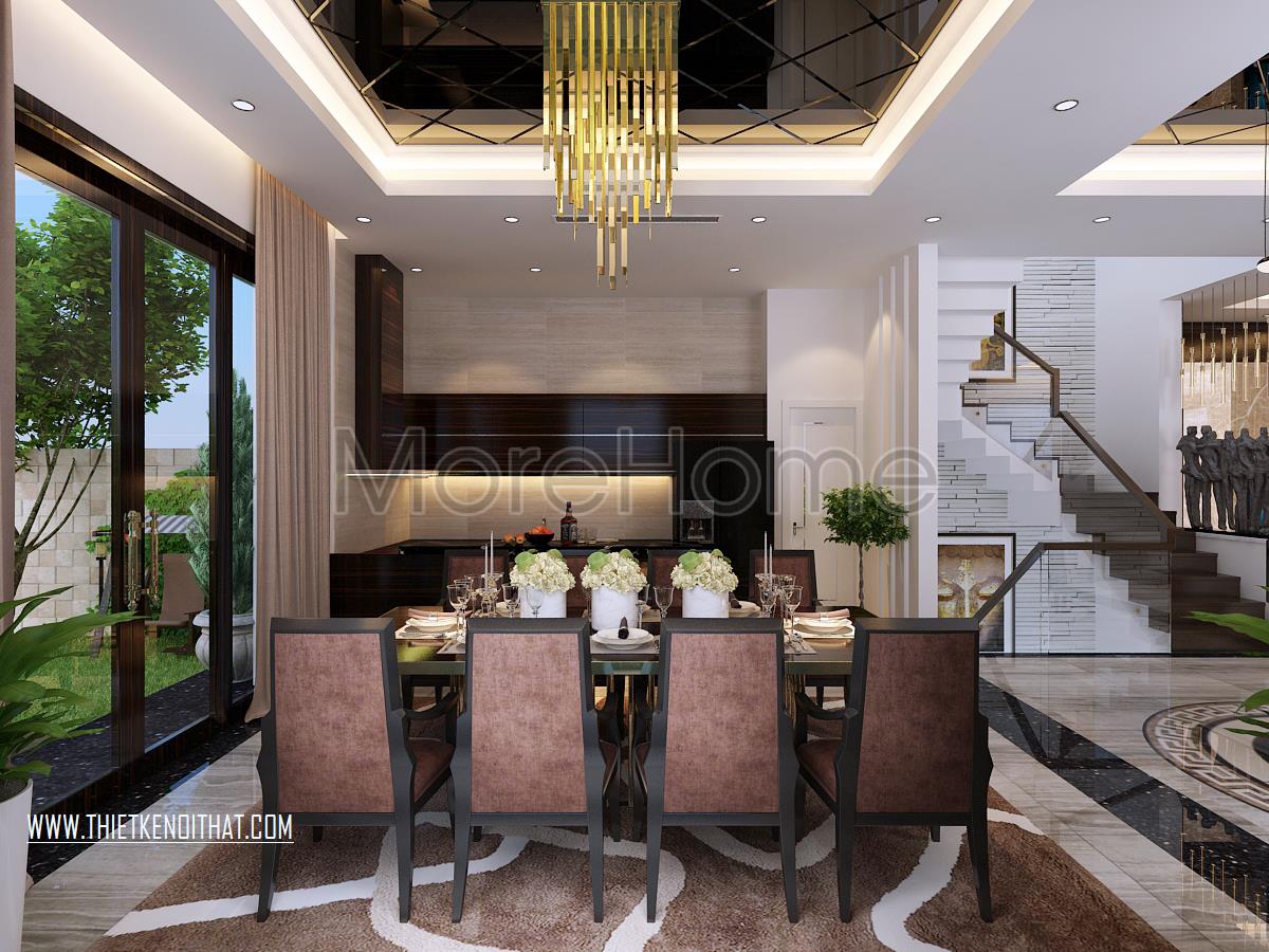 Tiếp đến là thiết kế nội thất phòng bếp và khu vực bàn ăn hiện đại. Tone màu nâu trầm vẫn được ưu tiên sử dụng vừa đảm bảo tính đồng nhất trong không gian thiết kế lại mang đến sự ấm cúng và mang lại hiệu ứng cảm xúc gần gũi cho các thành viên khác trong gia đình.