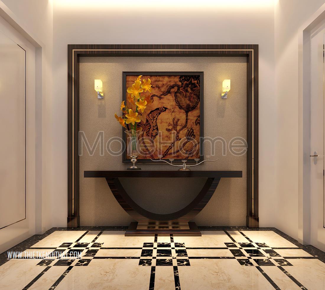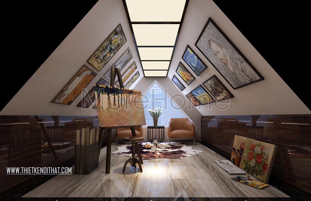 Cuối cùng là thiết kế khu tâm linh. Thiết kế nằm gọn trong một góc nhỏ tầng trên cùng của căn nhà. Nhìn vào không gian thiết kế này, chúng ta có thể dễ dàng cảm nhận được sự linh thiêng và trang trọng cũng như tâm trí của gia chủ vào thiết kế và bố trí không gian. Ánh sáng và màu sắc được điều tiết hài hòa tạo sự cân bằng cho không gian. Bên cạnh đó, thiết kế đối xứng cũng tạo sự đồng nhất và thể hiện rõ dụng ý của gia chủ.