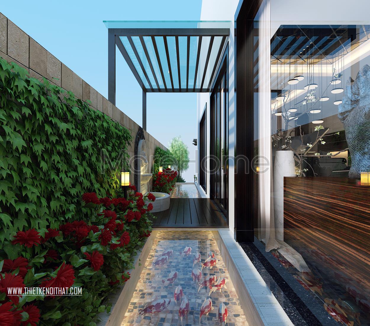 Thiết kế nội và ngoại thất đều khéo léo nhấn mạnh vẻ đẹp không gian thiết kế xanh mang đến không gian sinh hoạt tự nhiên, không có gò bó hay tạo sự bí bách mà ngược lại đem đến cảm giác thân thiện và thư thái cho gia chủ. Thiết kế sử dụng các vật liệu nhẹ như gỗ và kính cường lực làm chủ yếu vừa đảm bảo tính linh hoạt trong thi công, sửa chữa mà lại tăng tính thẩm mỹ cho căn nhà.