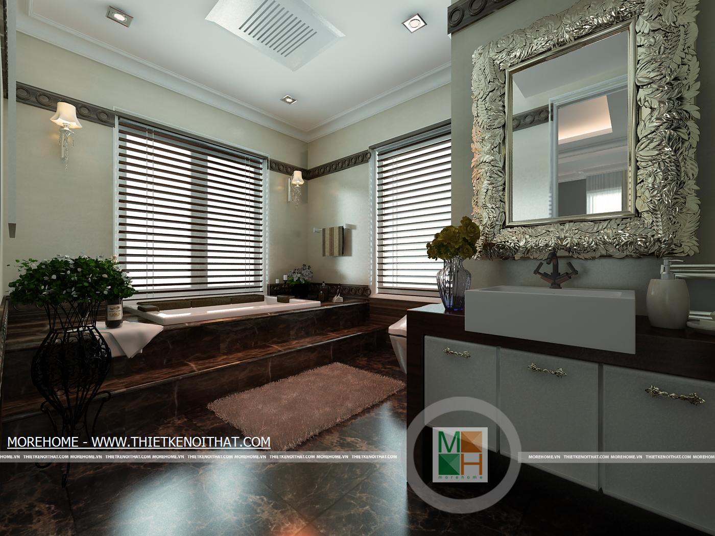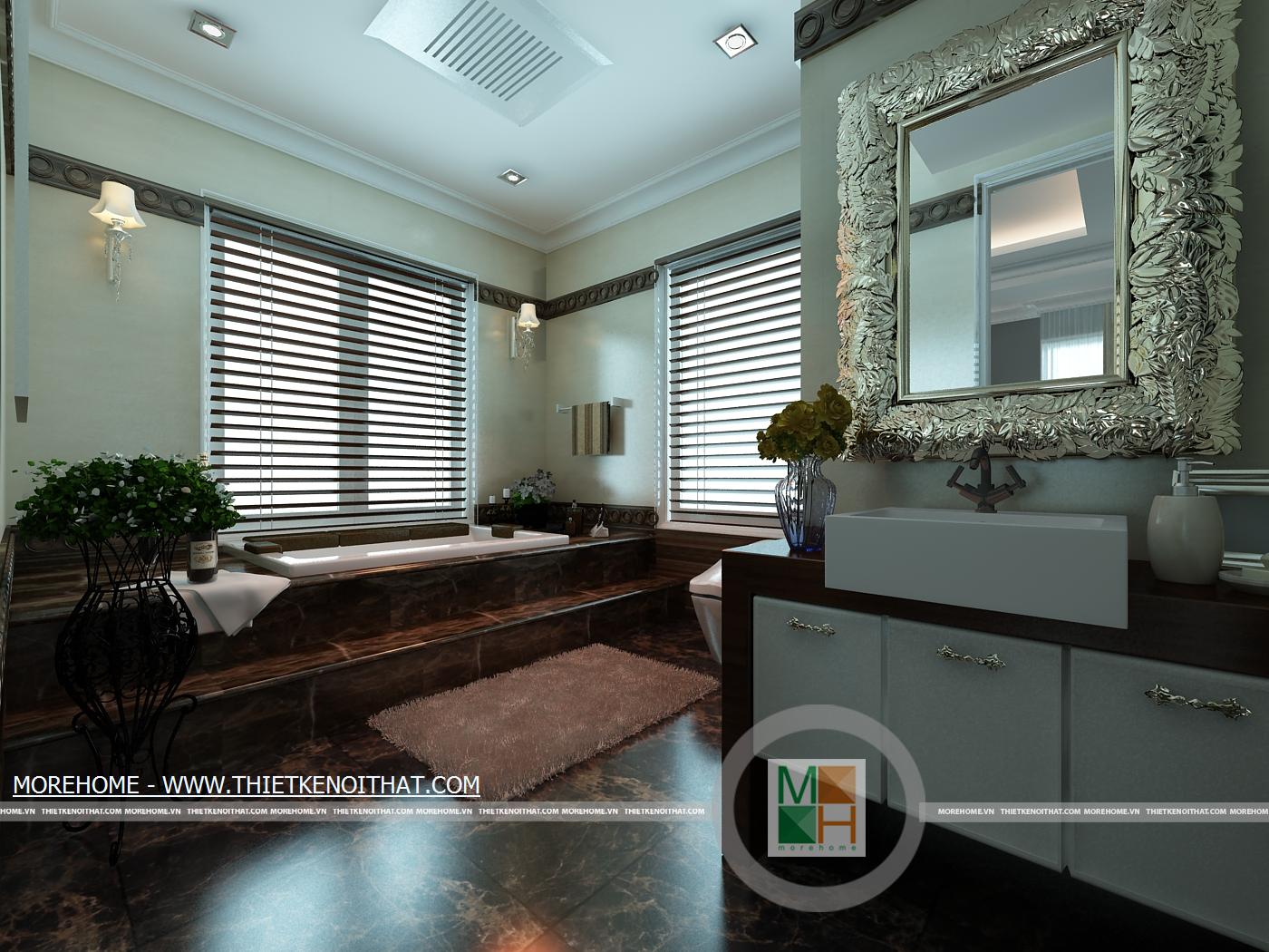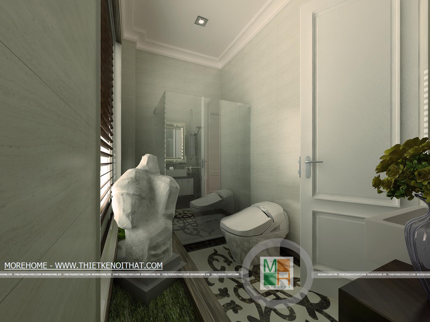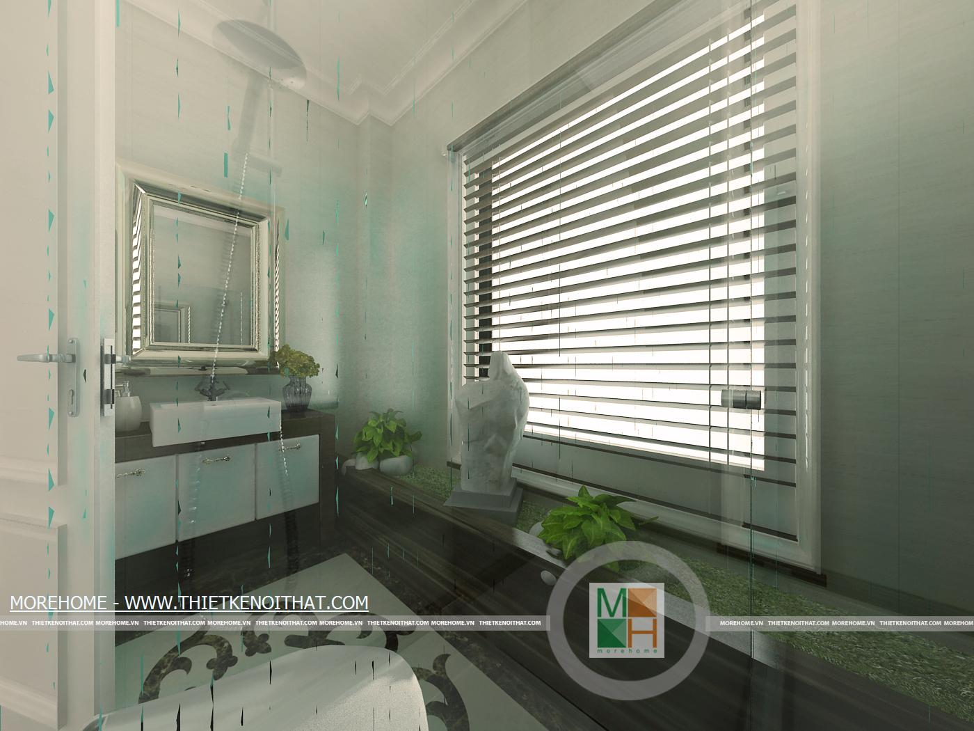 Phòng tắm với những thiết bị hiện đại tăng thêm giá trị cho biệt thự. Dưới cửa xếp, thiết kế gia của Morehome đã sử dụng những yếu tố thiên nhiên như cây cảnh, hòn non bộ cùng với tông màu sáng tạo cảm giác hết sức dễ chịu, điều mà bất cứ ai cũng mong muốn sau một ngày hoạt động mệt nhọc. Ngay từ chính phòng tắm, chủ nhân ngôi nhà cũng có thể thư thả ngắm nhìn thiên nhiên qua ô cửa kính. Cảm tưởng bước vào một spa cao cấp tại chính phòng tắm trong ngôi nhà của mình chính là điều mà kiến trúc sư mong muốn khi thiết kế và sắp đặt.