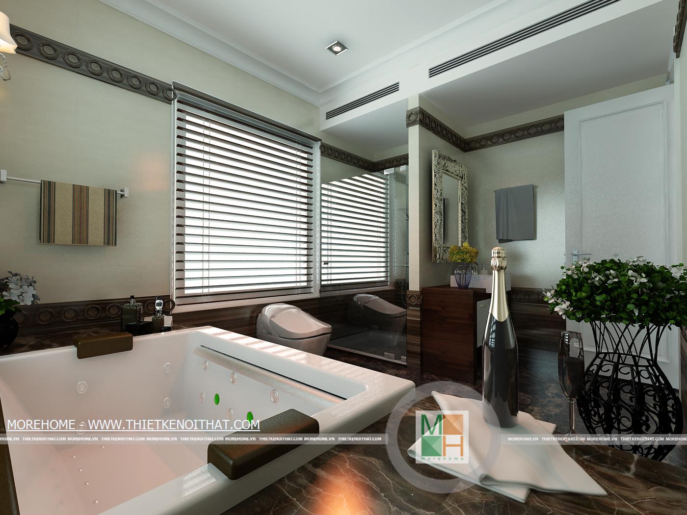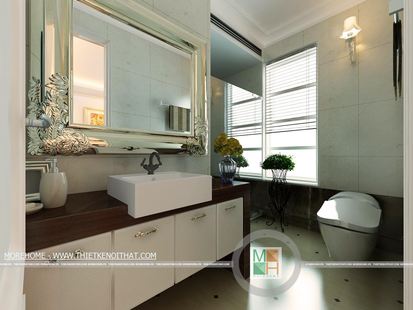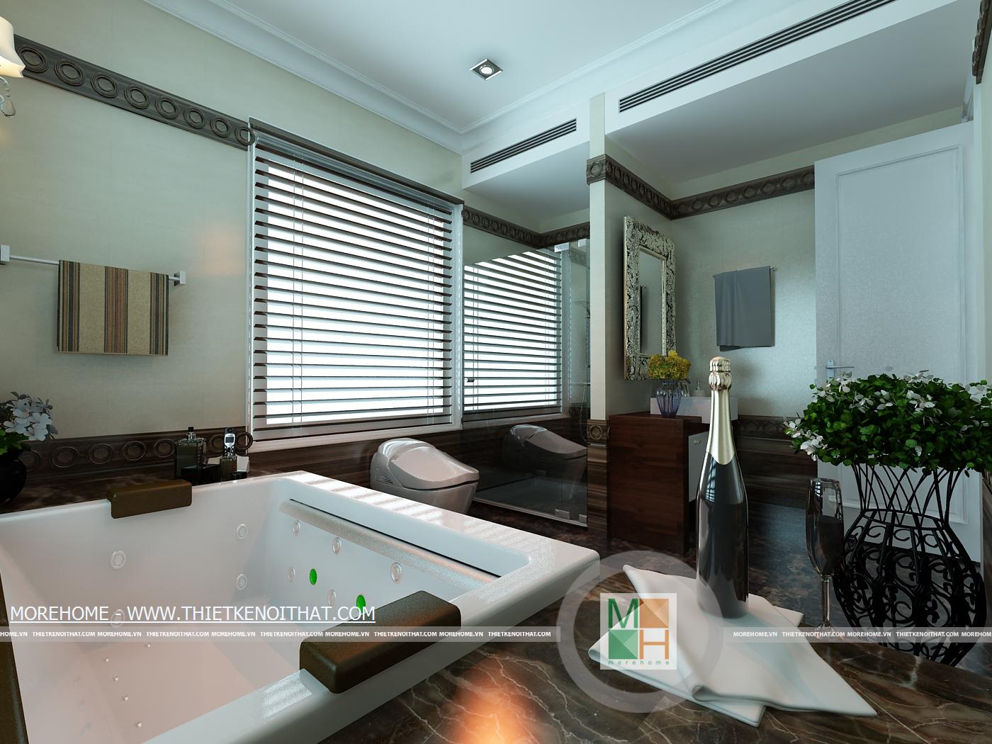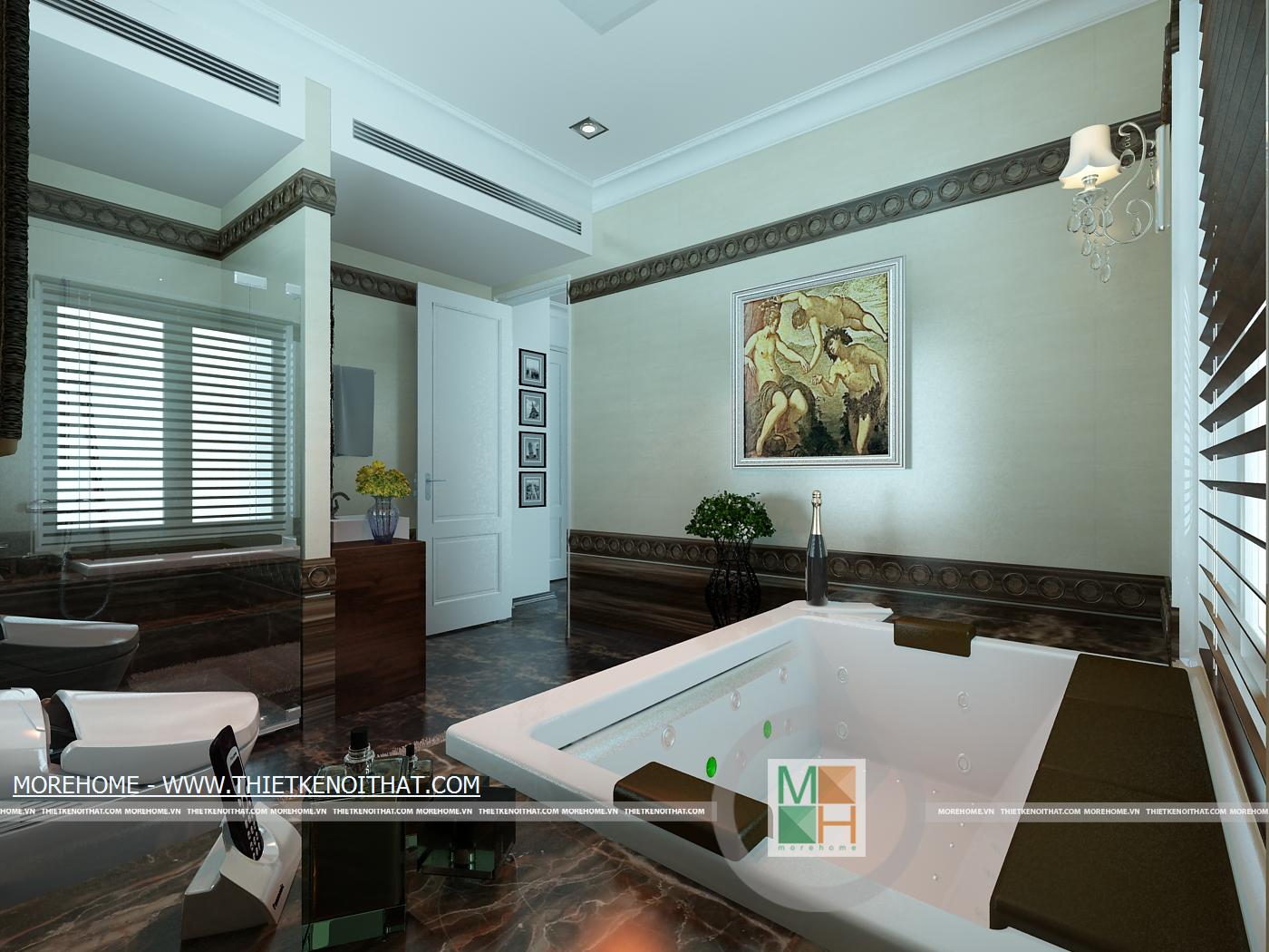 Phòng tắm với những thiết bị hiện đại tăng thêm giá trị cho biệt thự. Dưới cửa xếp, thiết kế gia của Morehome đã sử dụng những yếu tố thiên nhiên như cây cảnh, hòn non bộ cùng với tông màu sáng tạo cảm giác hết sức dễ chịu, điều mà bất cứ ai cũng mong muốn sau một ngày hoạt động mệt nhọc. Ngay từ chính phòng tắm, chủ nhân ngôi nhà cũng có thể thư thả ngắm nhìn thiên nhiên qua ô cửa kính. Cảm tưởng bước vào một spa cao cấp tại chính phòng tắm trong ngôi nhà của mình chính là điều mà kiến trúc sư mong muốn khi thiết kế và sắp đặt.