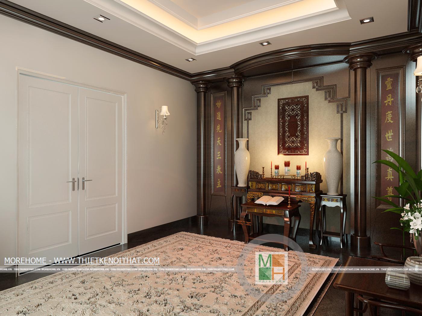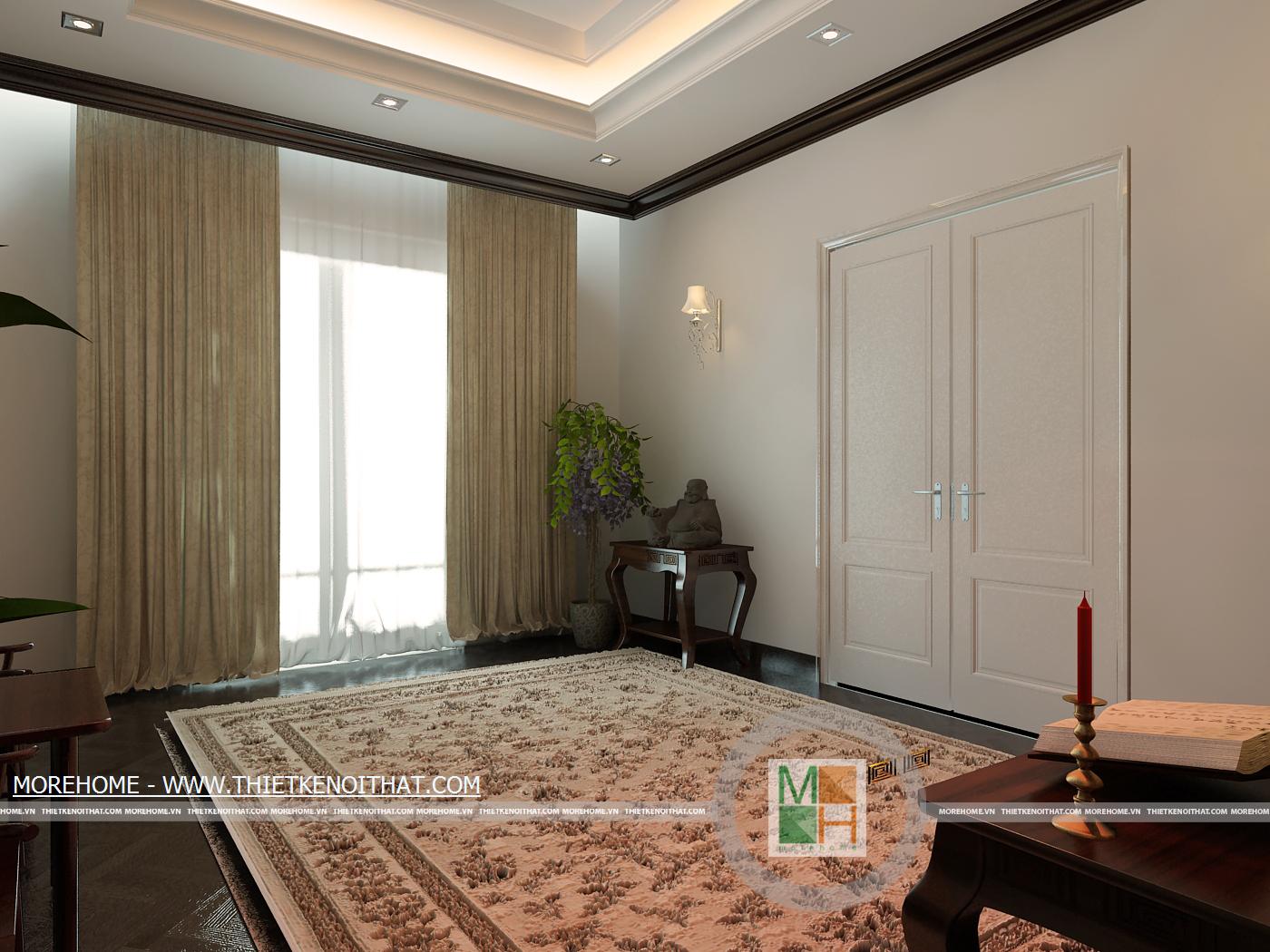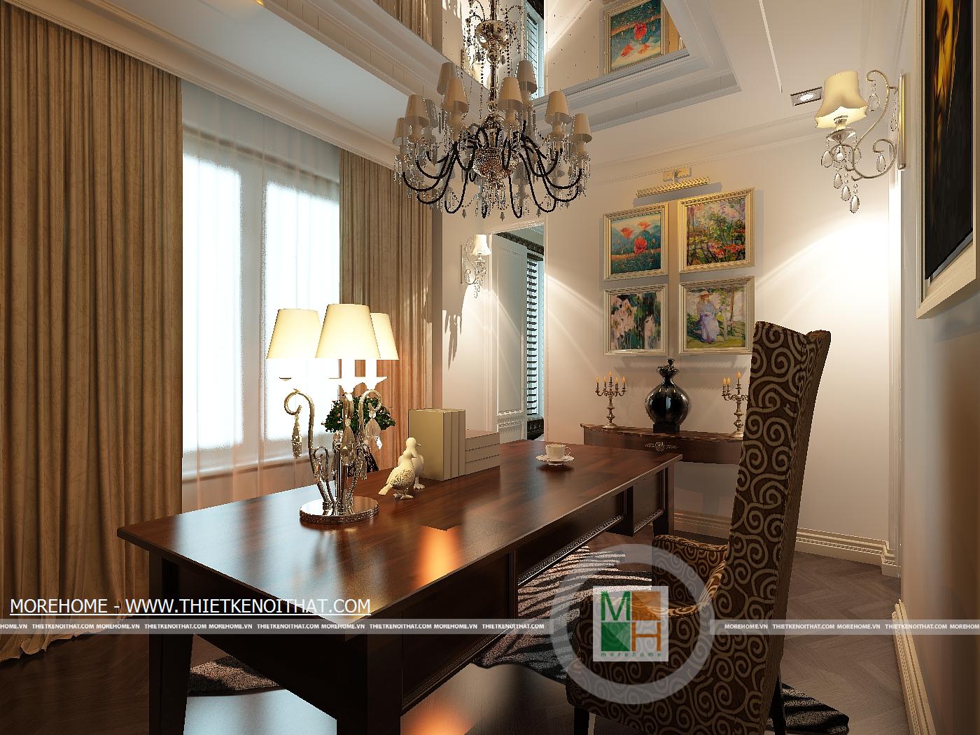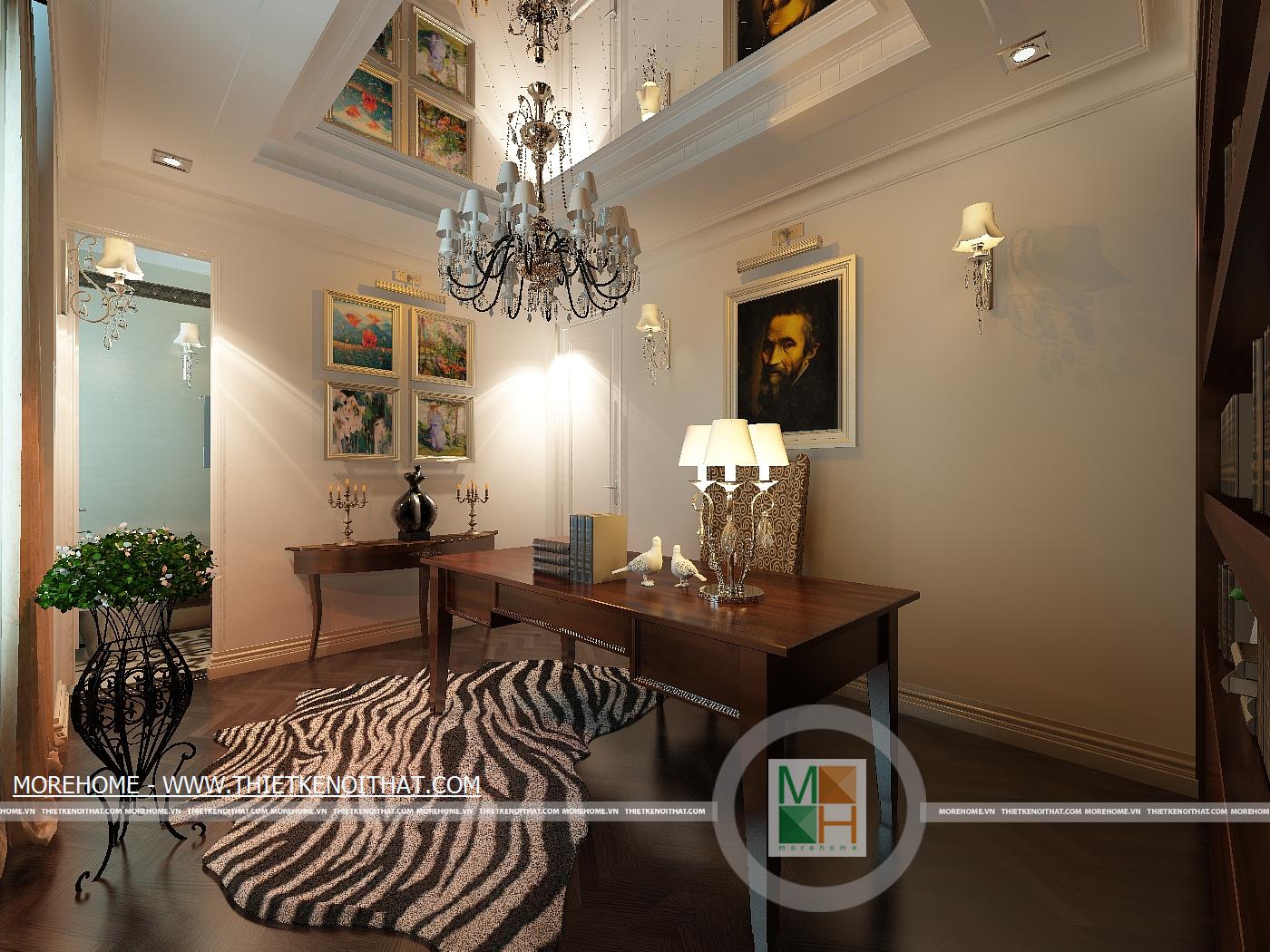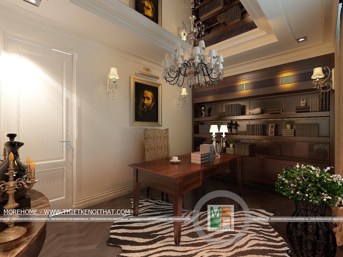 Phòng làm việc là nơi cần sự yên tĩnh, sâu lắng, bởi vậy, thiết kế gia Morehome đã sử dụng màu nâu là màu chủ đạo. Màu nâu cũng tạo nên màu sắc cổ điển cho căn phòng. Bàn đọc sách được đặt đối diện với cửa sổ để tận dụng ánh sáng tự nhiên. Điểm nhấn tại phòng làm việc chính là trần nhà bằng gương được gắn đèn chùm. Đây là một sáng tạo trong thiết kế của chuyên gia nội thất Morehome. Hơn cả sự hiện đại sang trọng, cách bố trí đó đã tạo nên một không gian mở, đem đến cảm giác thoải mái cho chủ nhân trong những phút dừng tay nghỉ ngơi, thư thái khi ngước nhìn từ phía trần nhà.