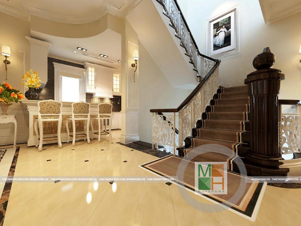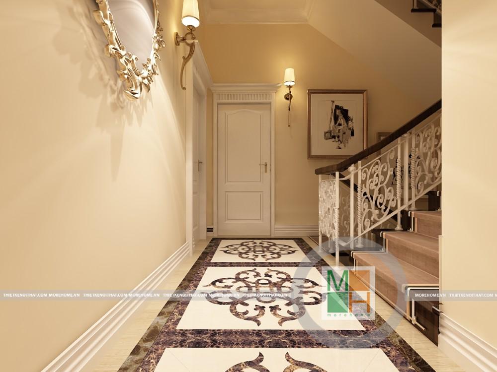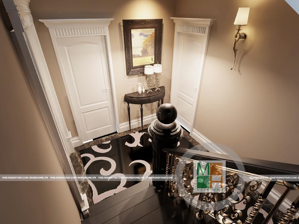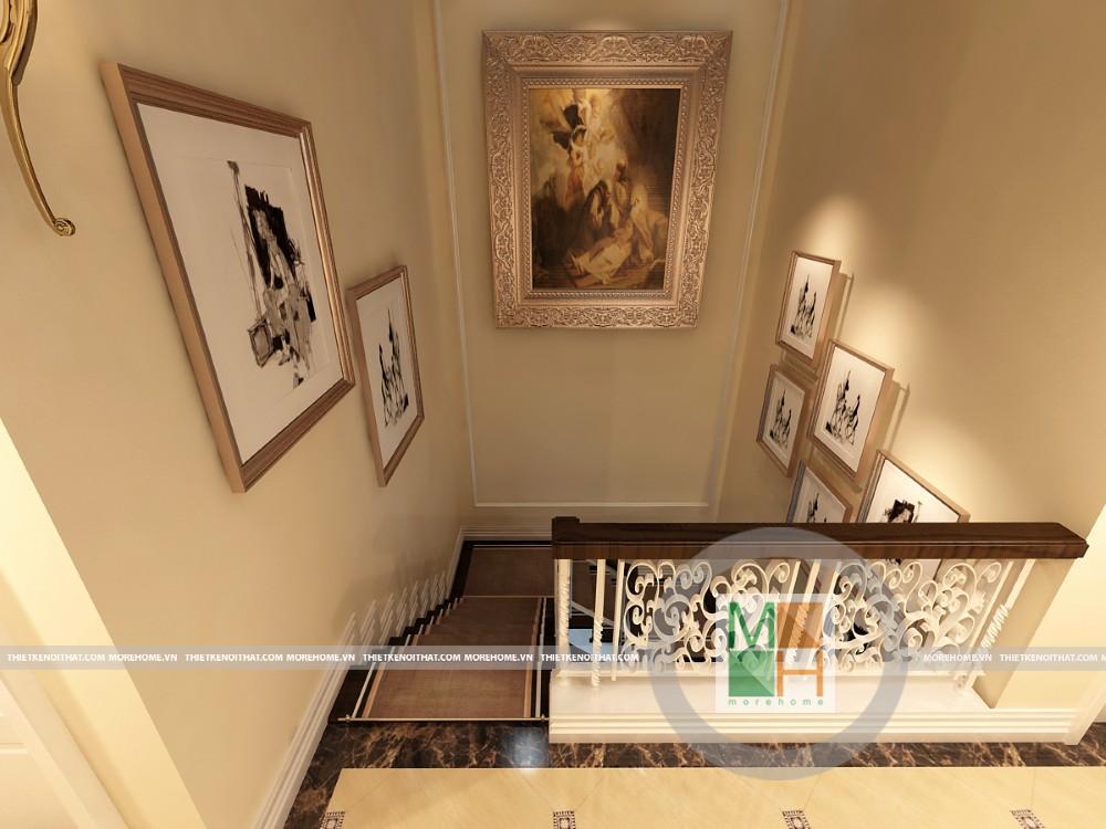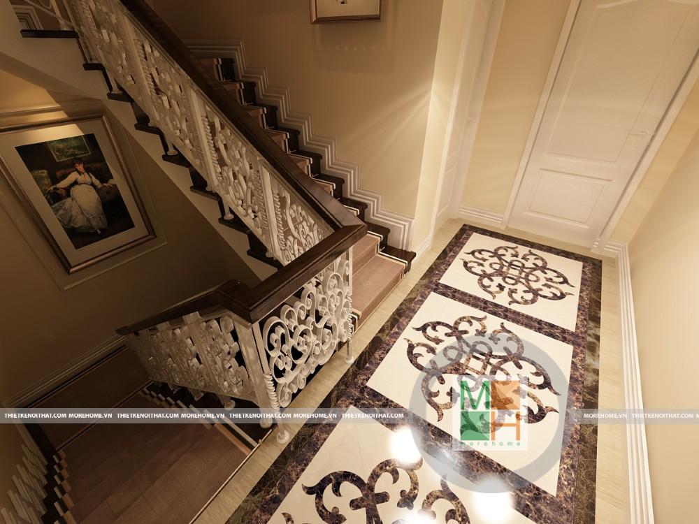 Cầu thang được thiết kế kiểu cổ điển, khối liền, lát đá cùng tông màu với gạch lót sàn và viền lan can màu đen nổi bật. Hoa văn của lan can màu trắng, dạng xoắn hoa lá truyền thống, nổi bật với tay vịn màu đen. Tường cạnh đó cũng được viền gờ nổi với những đường thẳng mạnh mẽ. Tông tường màu xanh dịu nhẹ cùng với màu đá ốp cầu thang, màu trắng của hoa văn và màu đen của tay vịn tạo nên một tổng thể vừa hài hòa, vừa nổi bật. Cạnh cầu thang là cửa sổ lớn, hướng ánh sáng vào khiến cho cầu thang luôn đủ sáng và tạo không gian thoáng đãng.