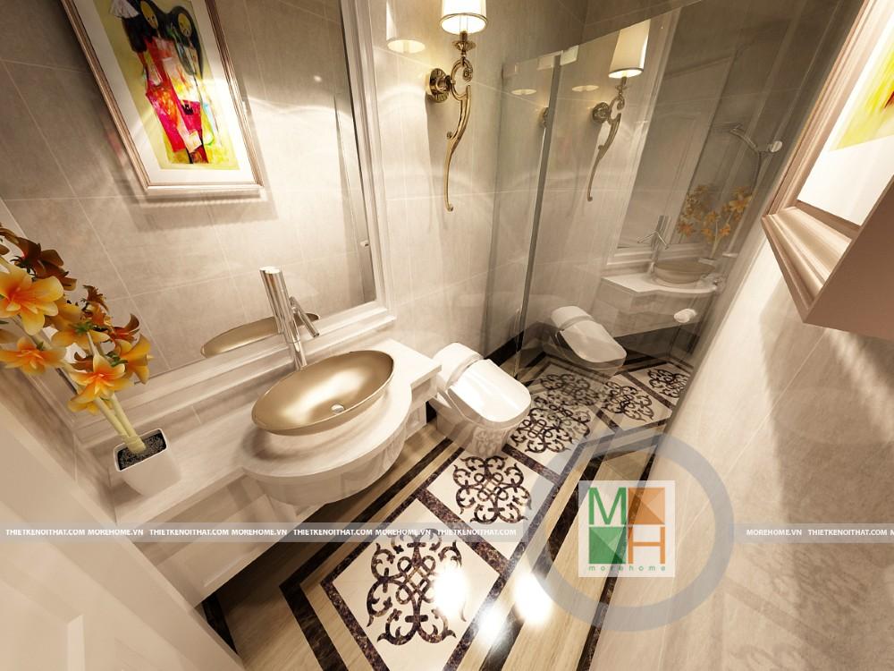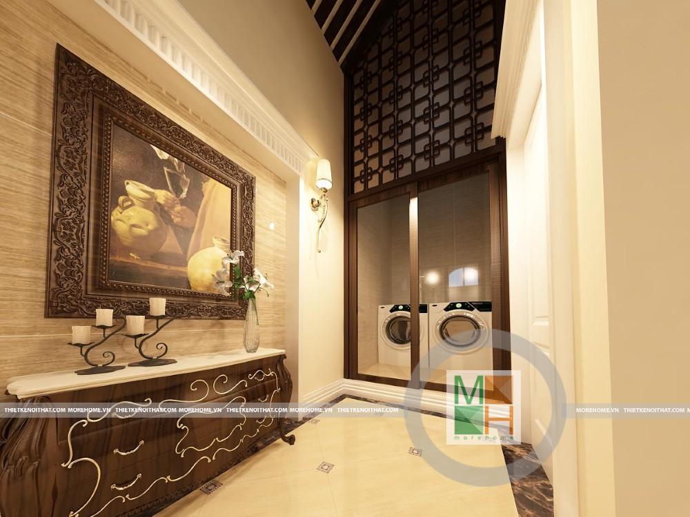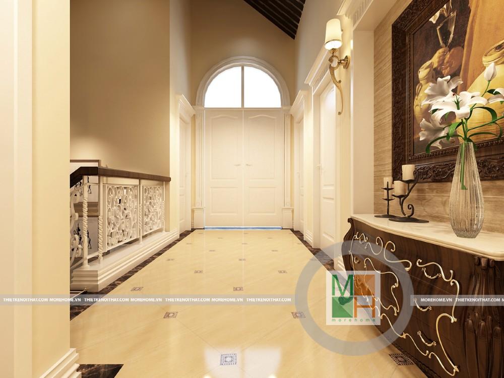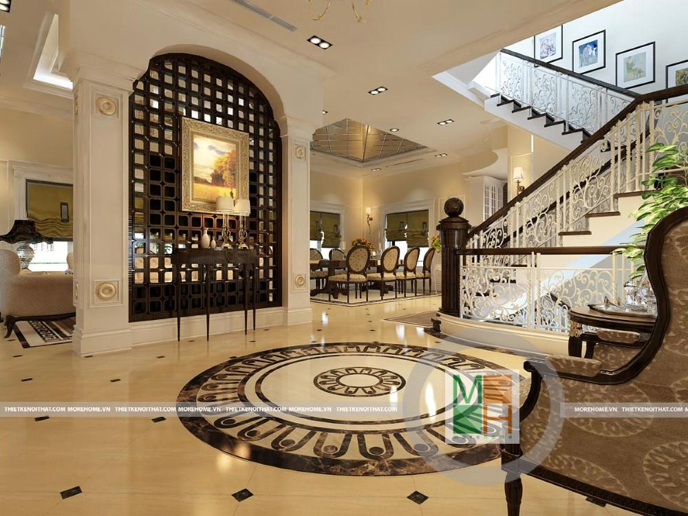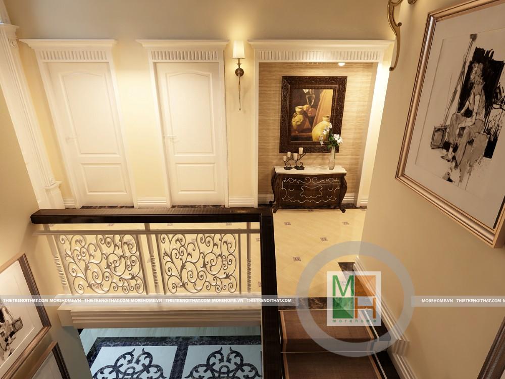 Cầu thang được thiết kế kiểu cổ điển, khối liền, lát đá cùng tông màu với gạch lót sàn và viền lan can màu đen nổi bật. Hoa văn của lan can màu trắng, dạng xoắn hoa lá truyền thống, nổi bật với tay vịn màu đen. Tường cạnh đó cũng được viền gờ nổi với những đường thẳng mạnh mẽ. Tông tường màu xanh dịu nhẹ cùng với màu đá ốp cầu thang, màu trắng của hoa văn và màu đen của tay vịn tạo nên một tổng thể vừa hài hòa, vừa nổi bật. Cạnh cầu thang là cửa sổ lớn, hướng ánh sáng vào khiến cho cầu thang luôn đủ sáng và tạo không gian thoáng đãng.