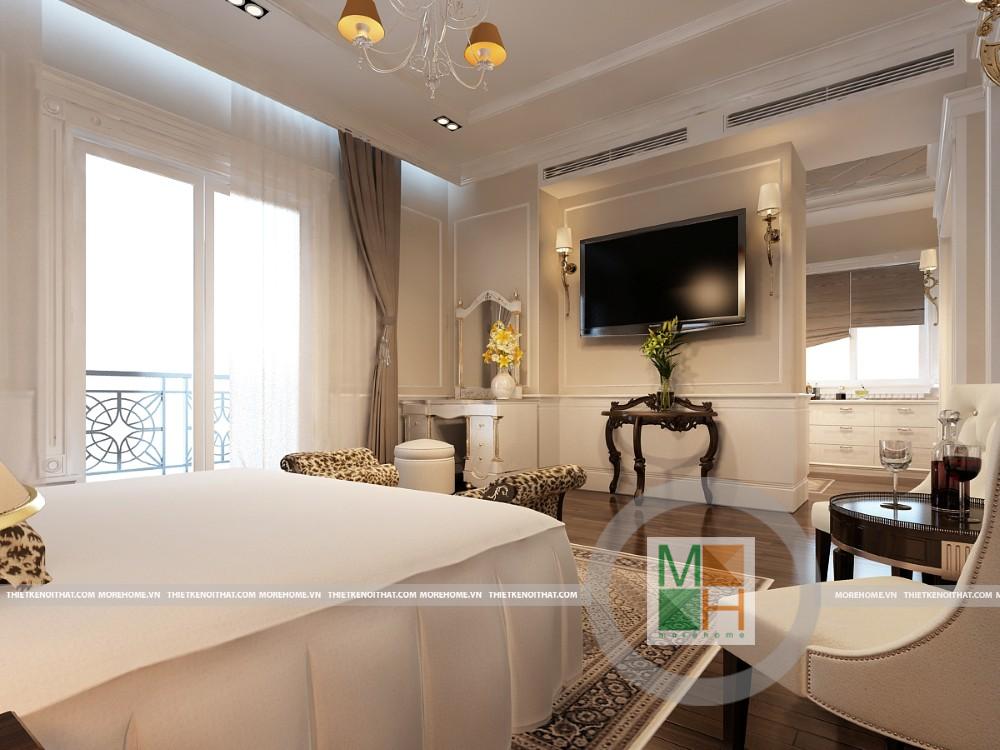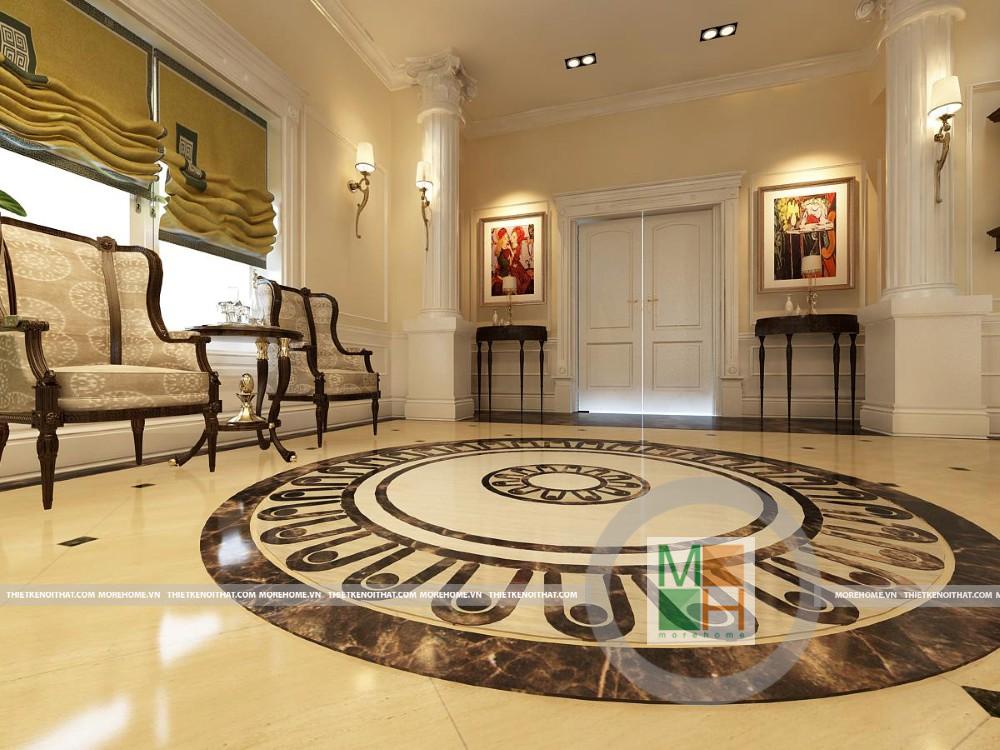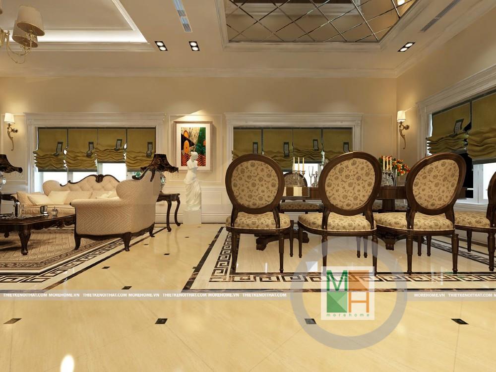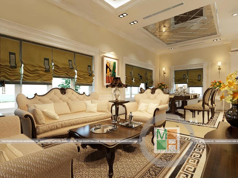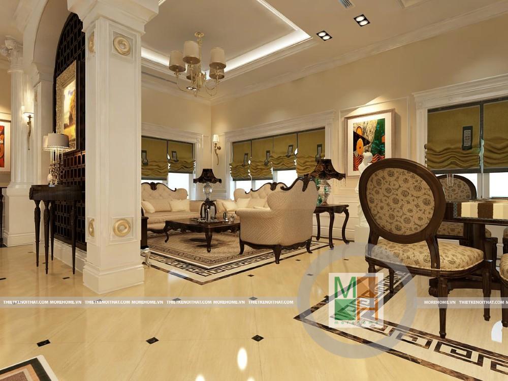 Khu phòng khách có diện tích rất rộng rãi, sô pha màu nhũ, ghế bành màu nhũ, sơn tường trắng làm cho không gian khu phòng trở nên vô cùng sang trọng. Điểm thêm vào đó là những chi tiết trang trí mạ vàng như bình hoa, chiếc cup, v.v… càng làm cho căn phòng thêm nổi bật. Căn phòng được trang trí với nhiều chi tiết khá phức tạp nhưng vô cùng tinh tế như đèn chùm, đèn hắt trần, rèm cửa, hay đơn giản chỉ là những viền đen tương phản trên những chiếc ghế. Điểm nhấn của căn phòng đó là bộ đèn hắt trần và đèn chùm với ánh sáng vàng nhạt, giúp cho căn phòng màu vốn dĩ đã là màu trắng không quá lạnh.