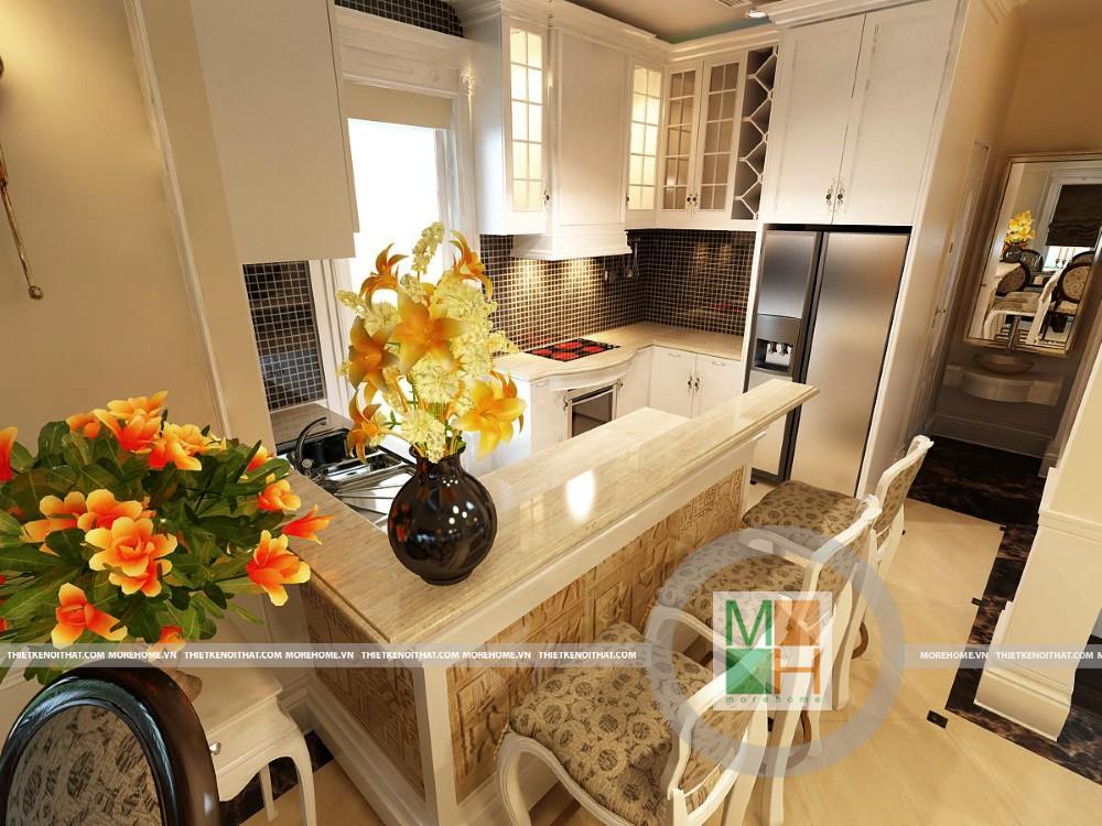 Phòng bếp được trang bị đầy đủ các thiết bị cao cấp. Gian bếp được ngăn với phòng khách bằng vách ngăn với kiểu thiết kế mở khá đặc biệt, khiến cho không gian của hai gian phòng không bị tách biệt và hạn chế, đồng thời đó cũng là một dụng ý thẩm mỹ hay. Bộ bàn ghế của gian bếp được thiết kế tương phản đen trắng khiến cho chúng ta có một cảm giác rất sạch sẽ và sang trọng. Diện tích lớn nên việc bố trí bàn ăn và khu bếp nấu cũng rất thoải mái và tạo được một không gian vô cùng rộng thoáng. Mỗi một gian phòng đều được lát một kiểu gạch riêng, tạo những điểm nhấn riêng cho từng vị trí trong nhà mà không hề bị rối mắt. Cửa sổ lớn, hướng sáng khiến cho căn phòng luôn đầy đủ ánh sáng tự nhiên.