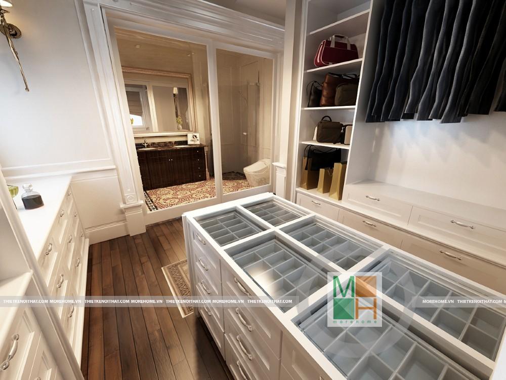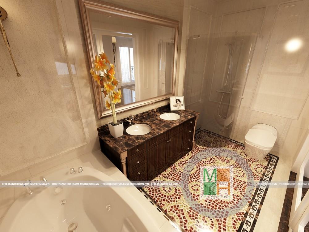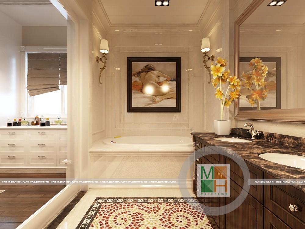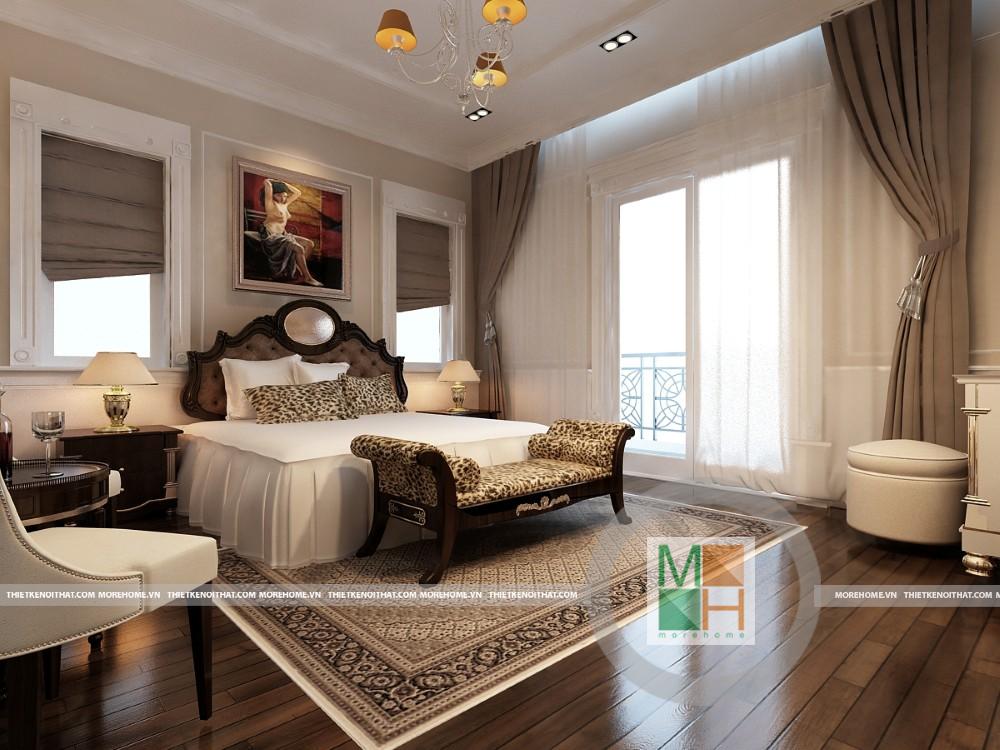 Phòng ngủ master được trang trí thật sự lộng lẫy với tông màu vàng và diện tích rất rộng cùng nội thất sang trọng. Sàn gỗ màu ấm, hài hòa cùng tông màu đèn vàng của phòng. Những đường nét được thiết kế cứng cáp, mạnh mẽ cùng những điểm nhấn mạnh. Tủ đồ được đặt sâu bên trong cùng với đó là phòng thay đồ vừa kín đáo vừa giúp căn phòng tiết kiệm được tối đa diện tích. Kệ sách khá lớn được đặt sát tường cùng với đó là bàn làm việc. Giường lớn được đặt đối diện màn hình TV và sau đó là khung cửa sổ rất rộng, tạo một không gian có ánh sáng đầy đủ và vô cùng tự nhiên. Ngoài ra, cửa thông ra ban công của phòng cũng rất rộng, tạo độ mở lớn cho căn phòng. Nổi bật trong căn phòng là những chiếc bàn làm việc, bàn trang điểm, kệ để TV, quạt trần, tất cả đều màu nâu sẫm, tạo sự tương phải tránh nhàm chán cho phòng. Khu vệ sinh của phòng ngủ master thật sự là một điểm cộng cho căn phòng. Diên tích khu vệ sinh rất rộng, thiết kế đặc trưng là những đường thẳng cứng cáp, bồn tắm lớn sang trọng, cửa sổ rộng thoáng. Thiết kế tông màu vẫn giữ nguyên với màu ấm, thích hợp với không gian của một phòng tắm.