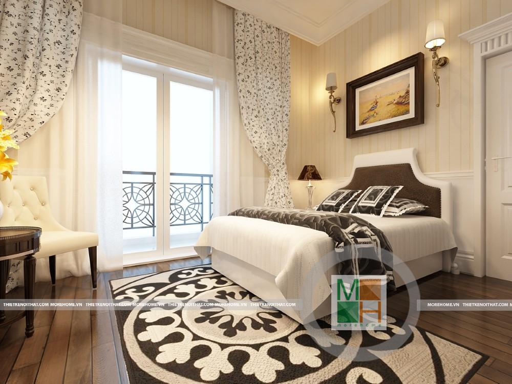 Phòng ngủ chung khá rộng, thiết kế màu sắc tương phản mạnh đen- trắng với của tường- hoa văn tường- rèm- tủ đồ. Hòa cùng với sự tương phản màu sắc là những đường nét thẳng cứng cáp như mành cửa, tủ đồ, giường hay đèn trần. những điểm nhấn nay khiến cho căn phòng trở nên rất mạnh mẽ và lịch sự. Một điểm đặc biệt trong thiết kế của căn phòng đó là bàn làm việc được đặt phía dưới tủ đồ, tiết kiệm được không gian và tạo ra nét đặc sắc trong kiến trúc nội thất. Khu vệ sinh có diện tích khá rộng và màu sắc khá đặc biệt. Điểm nhấn về tương phản vẫn được áp dụng ở đây nhưng có vẻ như mọi thứ đã thiên về gam màu tối với đá lát sàn và ốp tường màu đen. Buồng tắm được cách biệt bằng vách kính viền kim loại sang trọng.