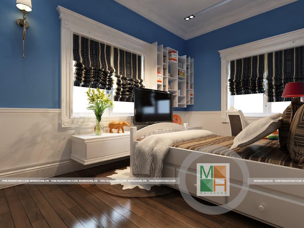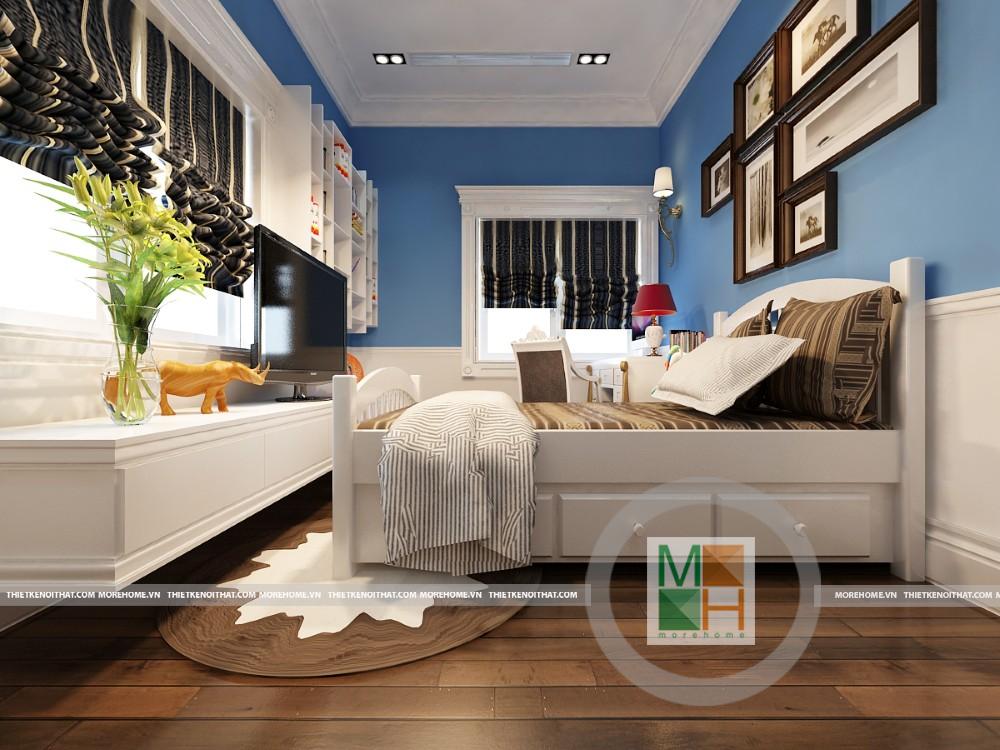 Phòng ngủ con gái được trang trí nhẹ nhàng, nữ tính. Giường màu hồng nhẹ, đặt cạnh cửa sổ nhỏ. Cạnh đó là góc học tập và làm việc với kệ sách. Phòng không rộng nhưng không quá nhiều chi tiết nên vẫn khá thoáng đãng nhờ cửa sổ và cửa ra ban công đầy ánh sáng. Tường được trang trí họa tiết kẻ sọc nhẹ nhàng cùng tông màu trung tính vô cùng dễ chịu.