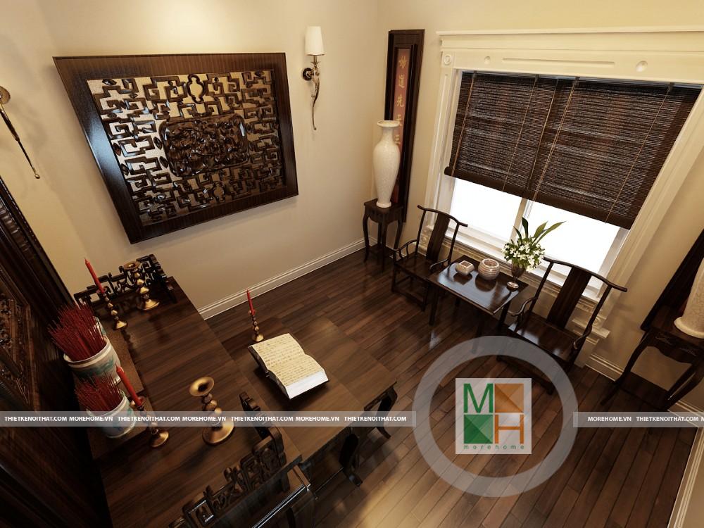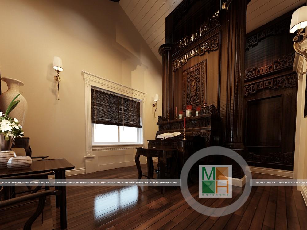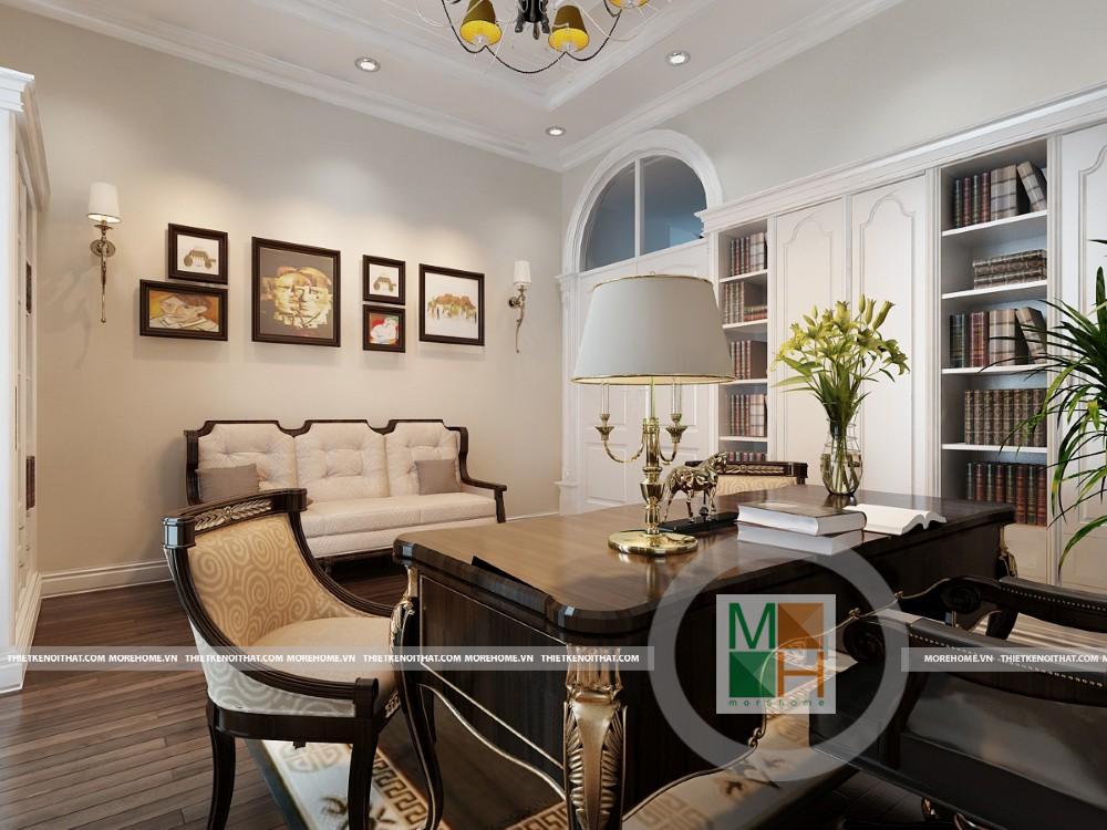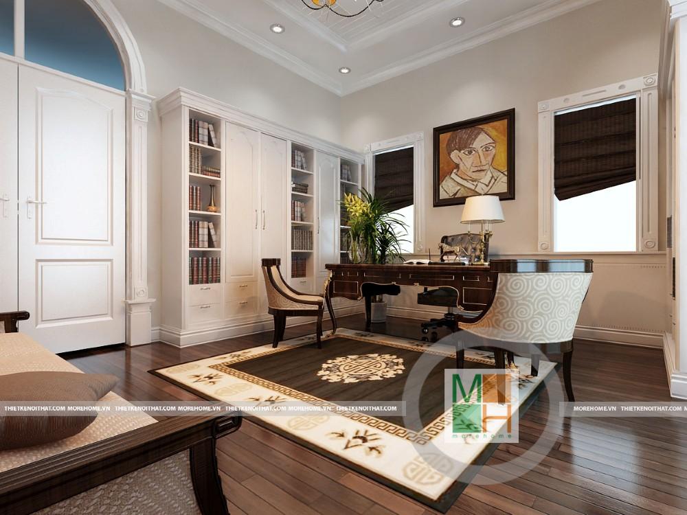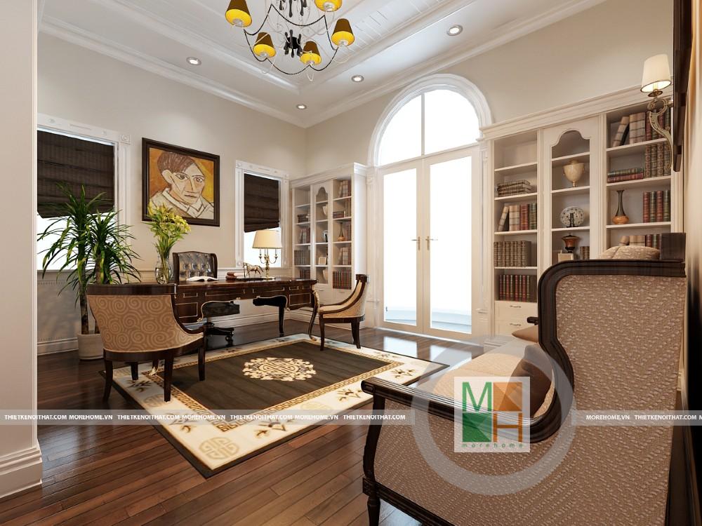 Tầng thượng được thiết kế thành một phòng đọc đặc biệt. Không gian mở đầy ánh sáng với cửa sổ lớn và cửa ra ban công rất rộng. Tông màu ấm, bàn ghế gỗ mộc nâu sẫm nổi bật, sô pha được đặt cạnh cửa sổ tiện cho việc đọc sách dưới ánh sáng tự nhiên. Đèn trần được thiết kế dạng chụp cổ điển, tạo sự đơn giản nhẹ nhàng.