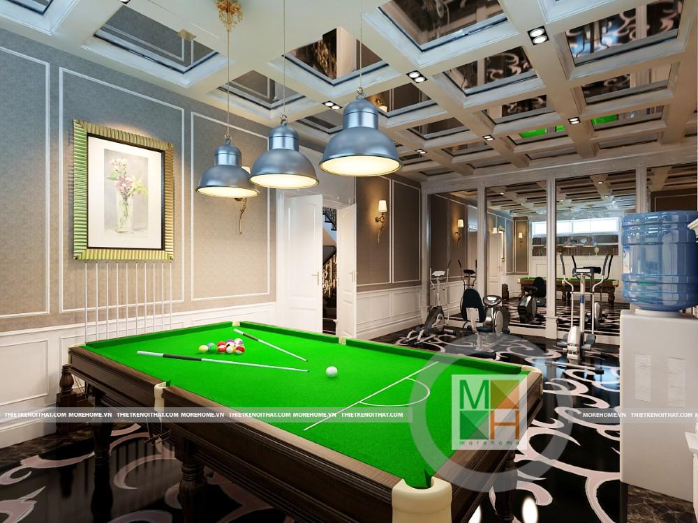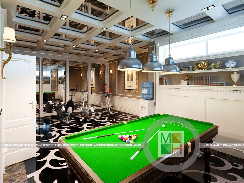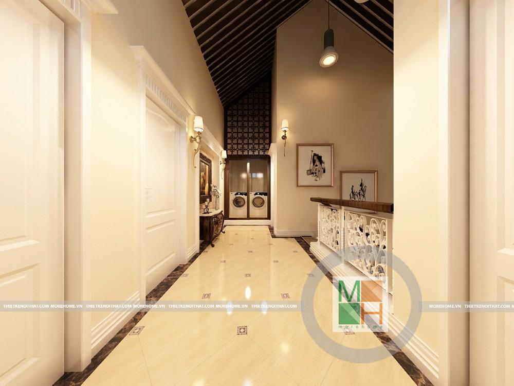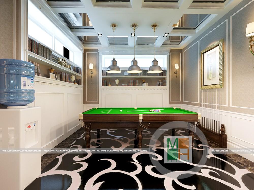 Gian sinh hoạt chung nằm ở gác 2, không quá rộng nhưng rất sang trọng. Salon màu kem và nâu tương phản mạnh, đèn trần được thiết kế không quá phức tạp như gian phòng khách nhưng lại tạo được sự nhẹ nhàng. Cuối gian sinh hoạt chung là cửa sổ khá lớn, khiến cho gian phòng vừa có được sự ấm cúng của nơi cả gia đình sum họp, vừa có được không gian mở,hài hòa với thiên nhiên.