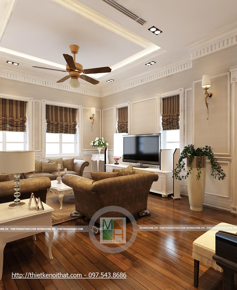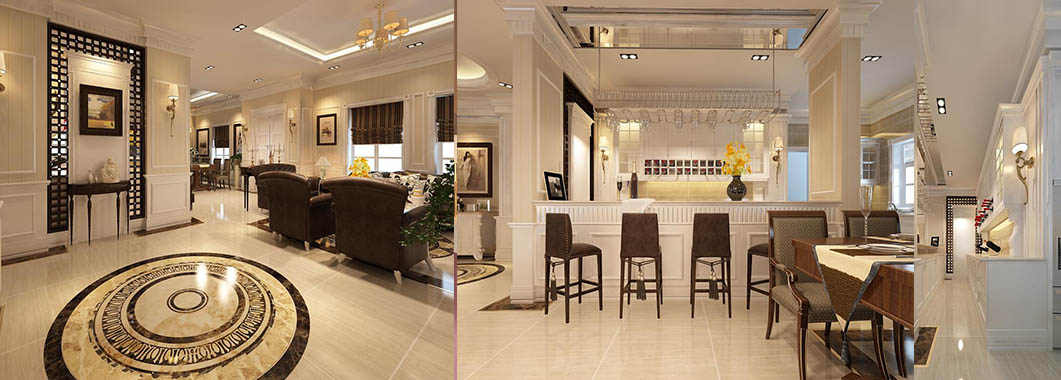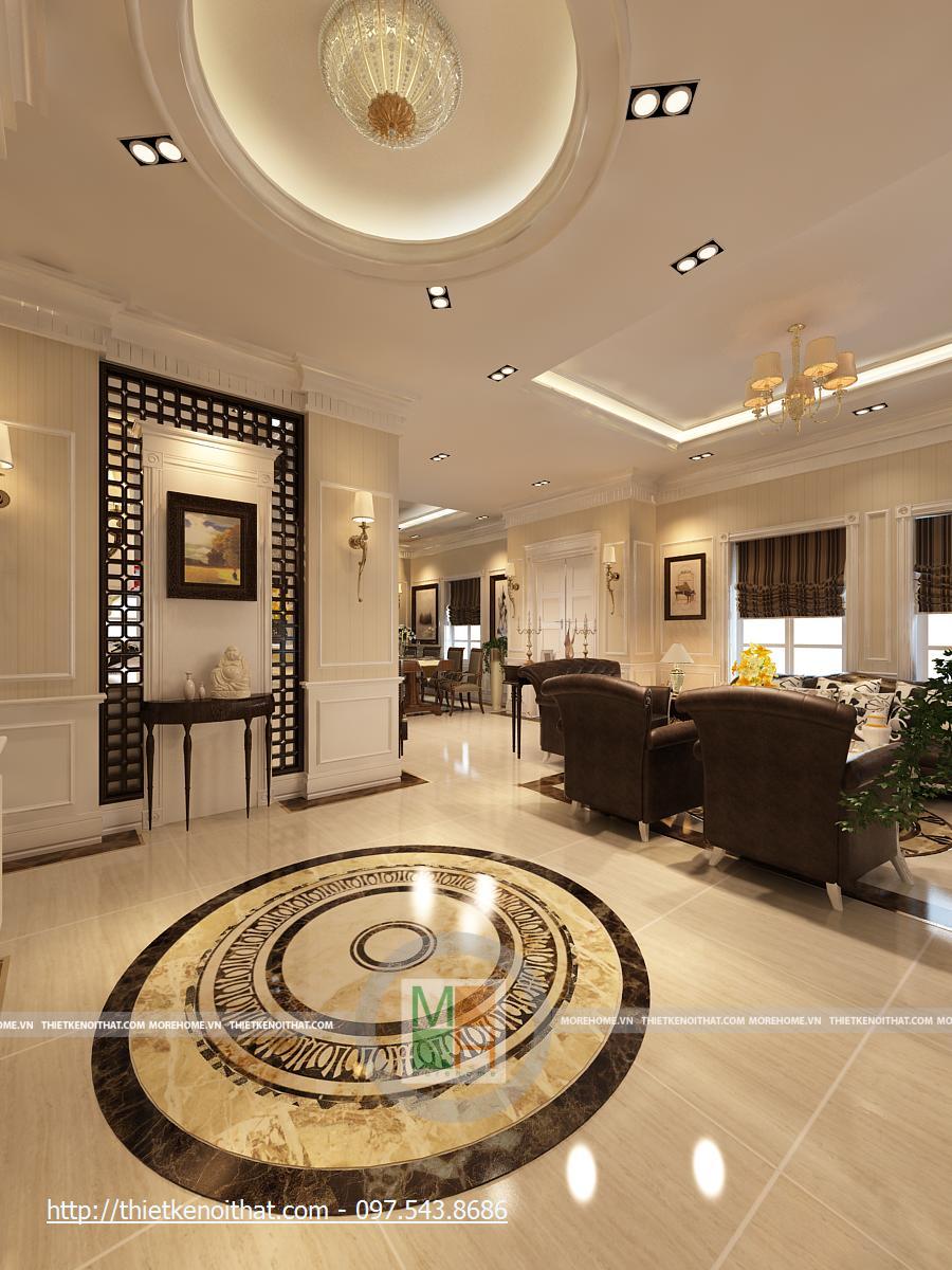Một tổng thể sang trọng, đầy ánh sáng và sự tương phản mạnh mẽ là tổng quan chung của phòng khách. Ánh sáng tự nhiên được tận dụng nhờ khung kính lớn, hoàn toàn không chắp ghép. Không gian phòng khách được sắp đặt theo từng khu vực khá gọn gàng, tạo những không gian tách biệt. Nơi tiếp khách được lùi vào trong so với hành lang đi lại, tạo sự kín đáo nhẹ nhàng. Chúng ta có thể thấy được sự phối hợp màu sắc hài hòa trong căn phòng. Trong tổng thể sáng màu của màu gạch và màu tường thì bộ salon nâu sẫm lại là điểm nhấn. Việc kết hợp màu rèm cửa và màu salon là một nét tinh tế của căn phòng, giúp cho màu nâu sẫm của salon không bị lạc lõng và đơn điệu. Gian khách được tách biệt với hành lang chính từ cửa vào bằng một vách ngăn, tạo sự riêng tư cho từng khu trong căn phòng.