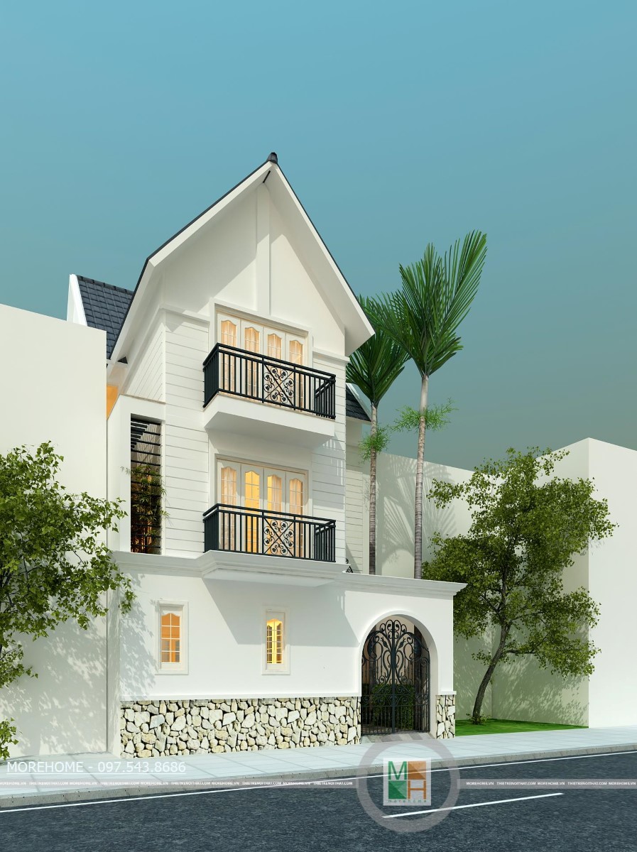 Thiết kế viền ngoài của căn biệt thự được cách tân sáng tạo bằng đá tự nhiên. Thay vì bức tường thô cứng bao quanh tạo sự cứng nhắc và bó buộc, thiết kế đã tạo viên chân bằng đá sáng tạo giúp tăng vẻ đẹp thẩm mỹ cho căn nhà tránh tối đa sự nhàm chán và đơn điệu từ tone màu trắng. Bên cạnh đó, thiết kế hai cửa sổ nhỏ hình chữ nhật đứng như mở ra một không gian khác cho căn biệt thự, mang lại sự ấm áp từ một căn nhà kiên cố, ấm áp và thân thuộc. Ánh sáng sử dụng trong căn biệt thự là ánh sáng vàng ấm áp hòa hợp và tạo sự cân bằng với tone màu trắng bên ngoài giúp không gian trở nên gần gũi, thật sự là một không gian trở về, quây quần và thư giãn của cả gia đình.
