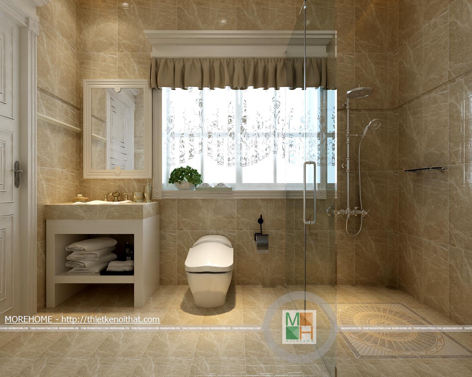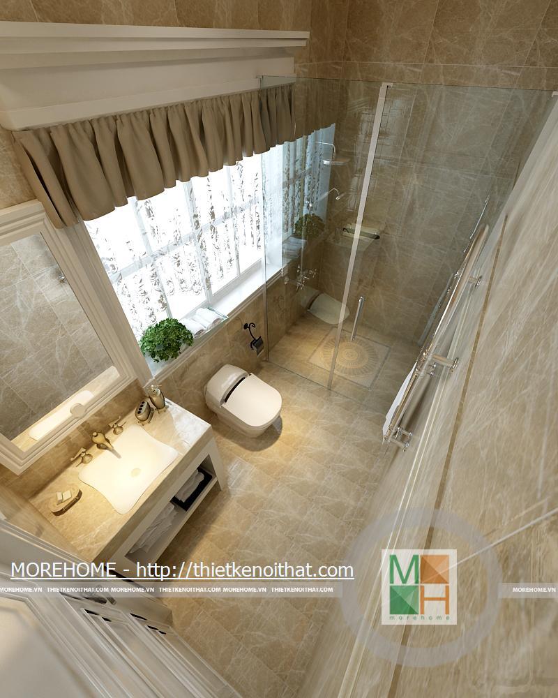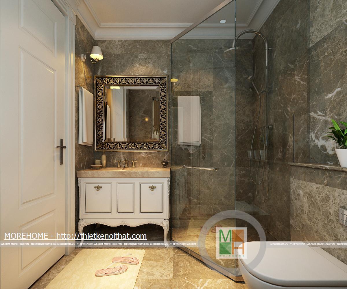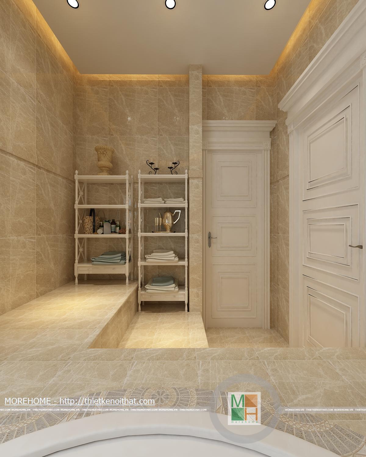 Phòng tắm lớn được trang bị bồn tắm cao cấp có diện tích rất rộng. Toàn bộ tường và nền được ốp đá tự nhiên màu sắc trang nhã. Trong phòng được kê một kệ dùng để vật dụng và đồ trang trí. Hệ thống ánh sáng trong phòng chủ yếu từ đèn âm trần và của sổ lớn hướng ánh sáng tự nhiên.