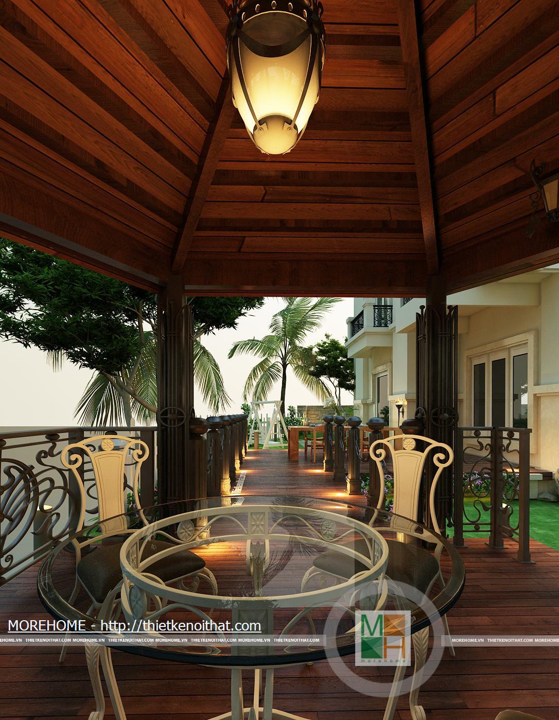Khu giải trí thư giãn có diện tích rộng, thoáng đãng hướng ra hồ nhân tạo, tạo không gian hòa quyện với thiên nhiên. Sân vườn được liên kết với căn nhà bằng một hành lang rộng rãi. Toàn sảnh vườn được thiết kế hoàn toàn từ gỗ tự nhiên tôn thêm nét sang trọng cho căn biệt thự. Trên hành lang lớn có 1 bộ bàn ăn phục vụ cho như cầu ăn uống ngoài trời. Ngoài ra còn có một sảnh lớn có mái che, trên sảnh được đặt một bộ bàn ghế nhỏ để gai chủ có thể nghỉ ngơi thư giãn đọc sách báo hoặc uống cà phê vào buổi sáng. Thêm một điểm cộng cho lối kiến trúc độc đáo này chính là hệ thống đèn chiếu sáng được đặt trên các cột gỗ dọc hành lang. Lán che ô tô cũng được thiết kế rộng rãi phù hợp với diện tích không gian khu vườn. Nổi bật trên nền cỏ xanh là những lối đi nhỏ được lát đá tự nhiên. Phía bên hông nhà cũng được tận dụng để đặt một hòn non bộ nhỏ, kiểu bố trí đơn giản nhưng vẫn đem lại được không gian thoải mái cho toàn bộ ngôi nhà