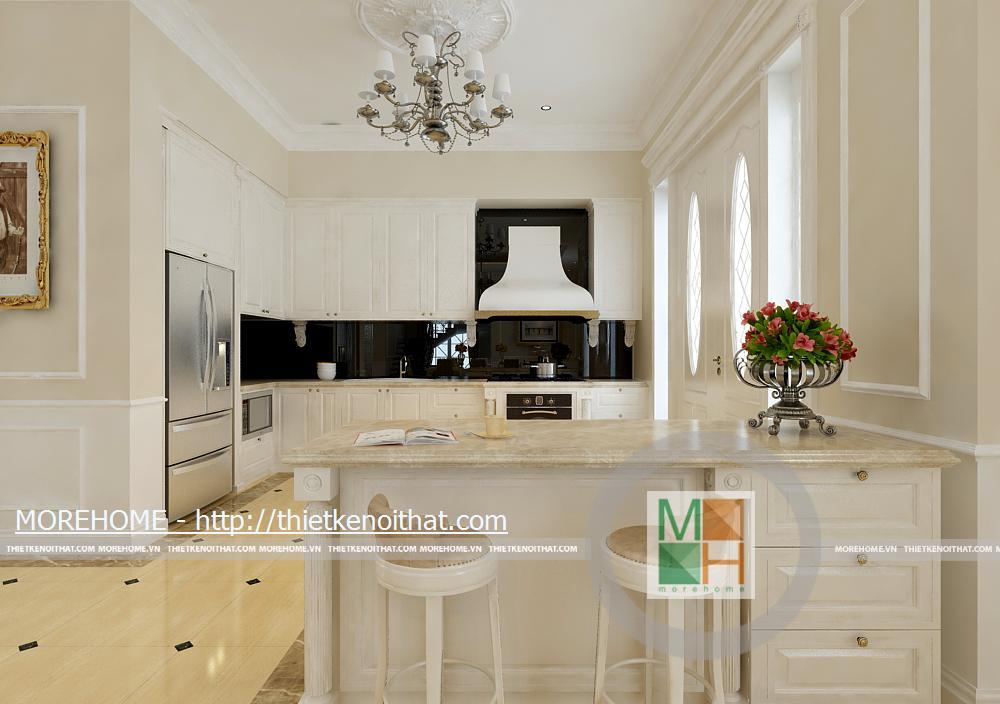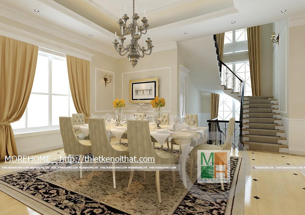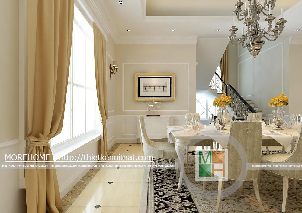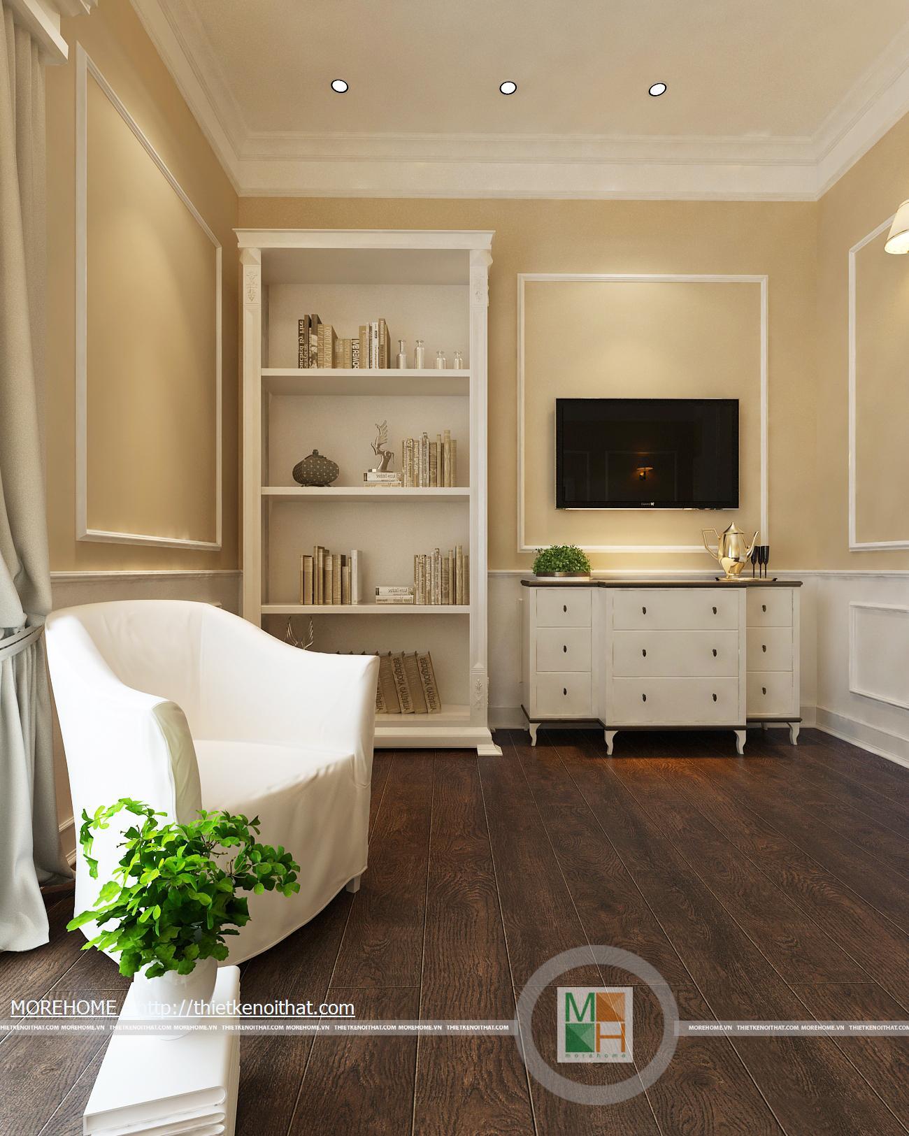 Phòng khách rộng và được tôn thêm bởi tông màu trắng sáng. Sàn nhà được lát gạch màu vàng sâm panh nhẹ, tôn thêm sự sang trọng cho căn nhà. Nội thất cũng được thiết kế cùng tông màu với gạch lát sàn, kiểu dáng pha chút cổ điển, mang hơi hướng của kiến trúc Pháp cổ. Hệ thống đèn chiếu sáng bao gồm đèn chùm, đèn hắt, đèn tường tạo không gian ánh sáng đa dạng cho căn phòng. Điểm nhấn cho không gian phòng khách chính là chiếc piano vừa để lấp đầy khoảng trống vừa để chơi nhạc và cũng thể hiện gia chủ là người yêu nghệ thuật. Ngoài ra chi tiết kệ trang trí được đặt bên piano còn làm cho phòng khách thêm phần trang nhã.