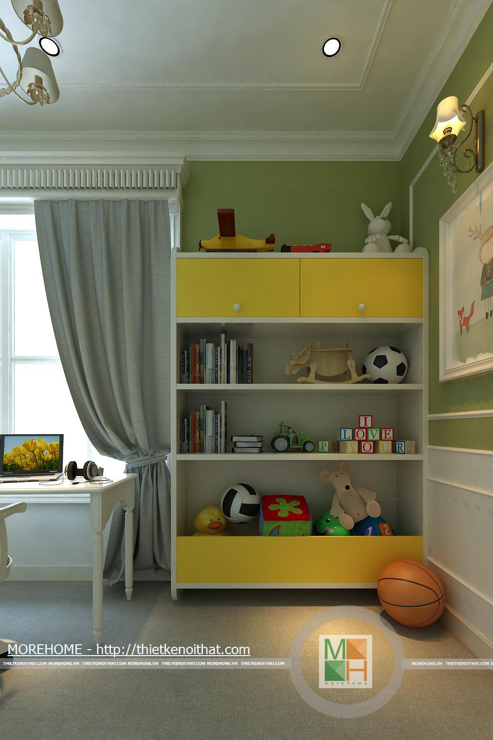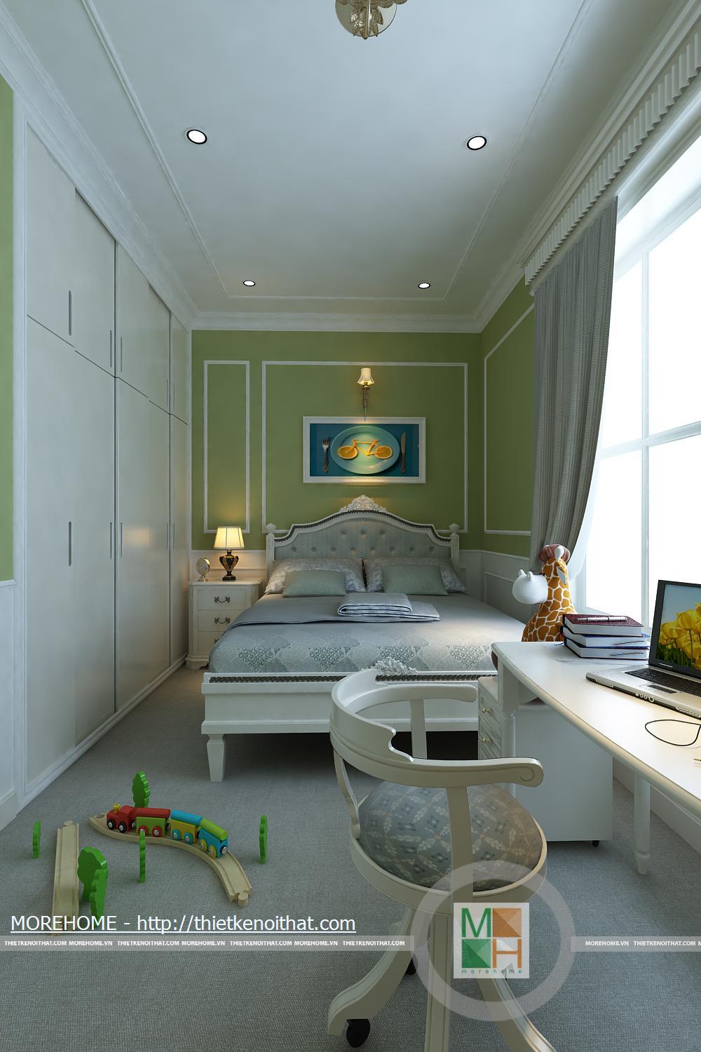 Tổng thể ngôi nhà có năm phòng ngủ bao gồm phòng ngủ con trai, phòng ngủ nhỏ, phòng ngủ ông bà, phòng ngủ bố mẹ và phòng ngủ khách. Phòng ngủ con trai được thiết kế nội thất hiện đại năng động phù hợp với lứa tuổi. Tủ đồ được kê sát tường tiết kiệm không gian cho căn phòng. Bàn học kê hướng ra cửa sổ đón ánh sáng. Bên bàn học bố trí một tủ kiêm kệ để đồ chơi, sách vở. Phòng ngủ nhỏ lấy màu trắng là gam màu chủ đạo, đan xen một số màu sắc nổi bật như đỏ, đen. Căn phòng được thiết kế đơn giản không cầu kì nhưng vẫn vô cùng hiện đại. Nội thất trong phòng được tối giản phù hợp với diện tích phòng. Phòng ngủ ông bà lấy phong cách cổ điển làm điểm nhấn, các đường nét trên nội thất phòng đều mềm mại, tinh tế. Cả căn phòng là sự hài hòa về màu sắc cũng như cách bố trí nội thất. Cửa lớn mở ra ban công để gia chủ có thể hít thở bầu không khí trong lành bên ngoài trời vào buổi sáng. WC của phòng ngủ ông bà cũng được trang bị khá là tiện nghi đầy đủ, không gian thoải mái tạo cho ông bà. Sự hiện đại của căn nhà còn được thể hiện ở phòng ngủ của khách. Thiết kế đơn giản nhưng vẫn vô cùng lịch sự và trang nhã, phòng ngủ này tạo cho khách một không gian thoải mái và thân thiện. Diện tích phòng rộng, bên giường ngủ kê một bộ bàn ghế nhỏ để khách có thể uống cá phê hoặc đọc sách vào buổi sáng. Đối diện giường ngủ là một kệ để sách cùng vật dụng trang trí và một TV. Toàn bộ ánh sáng trong phòng kết hợp với màu sơn tường tạo cho phòng ngủ này một sự ấm cũng và thân thiện.