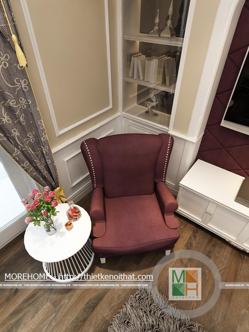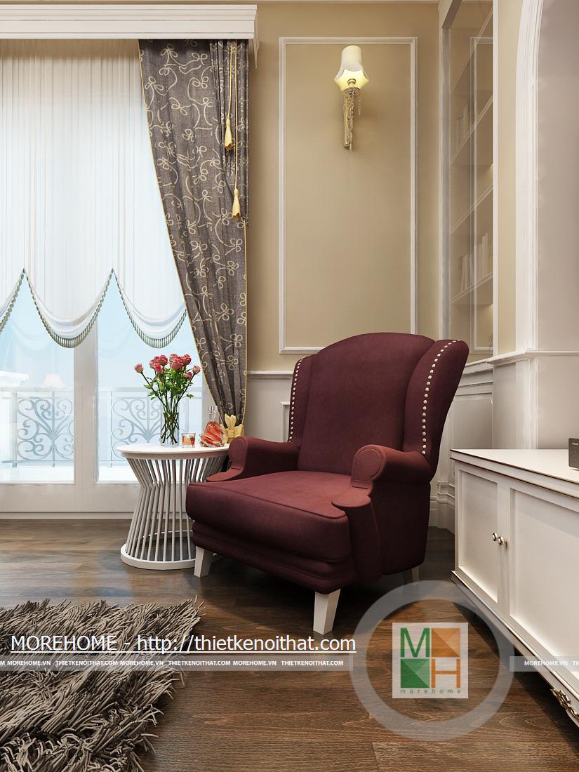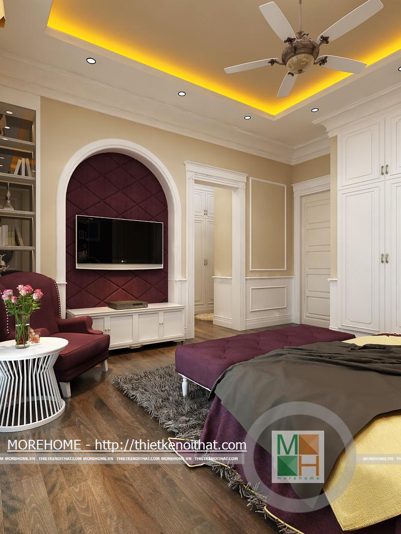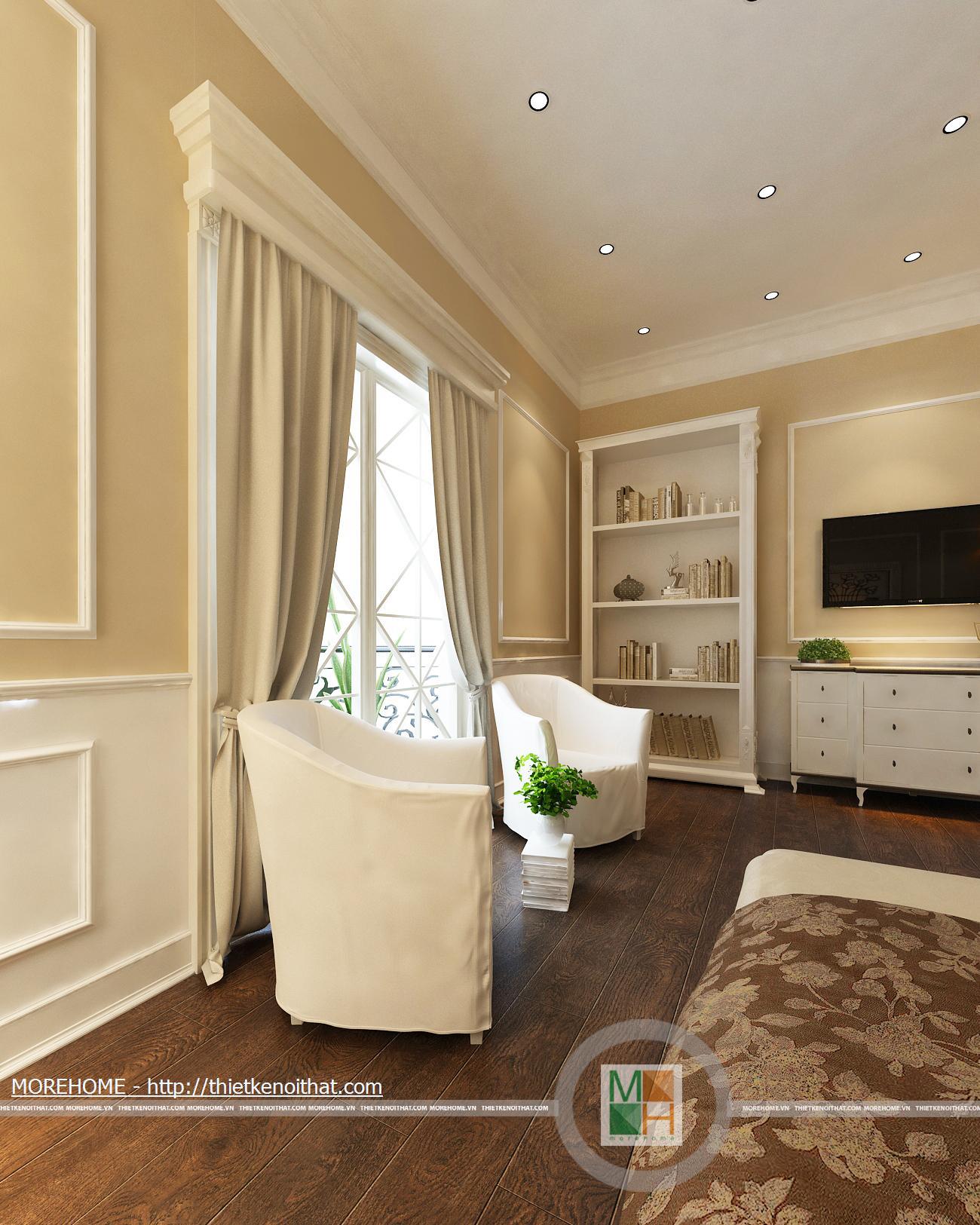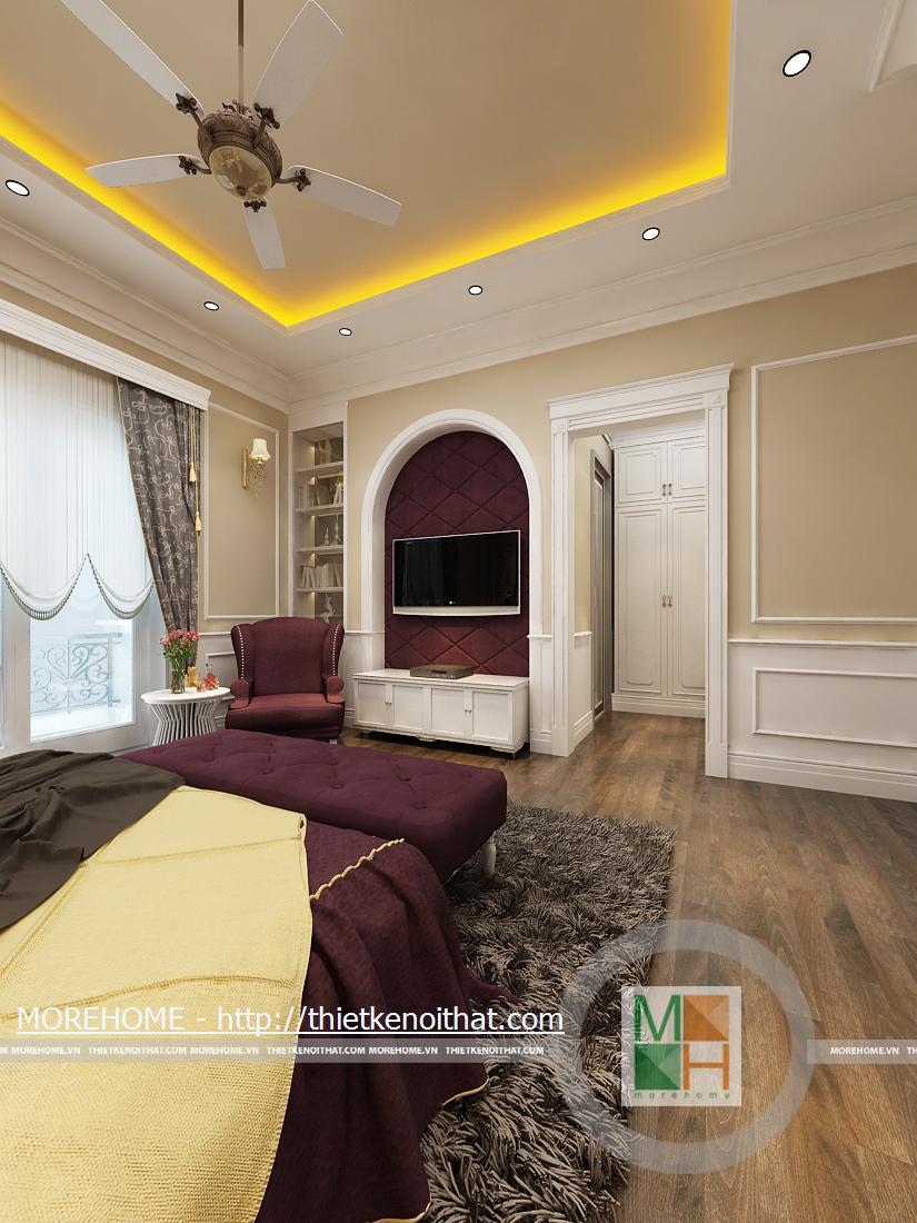 Phòng ngủ bố mẹ được thiết kế nội thất theo phong cách hiện đại có pha chút Tây Âu. Từng đường nét hoa văn trang trí trong nội thất toát đều toát lên vẻ sang trọng cho căn phòng. Điểm nhấn cho căn phòng là sự cách điệu về màu sắc, đan xen của hai tông màu chính. Cản phòng được chiếu sáng bởi hệ thống đèn âm trần và đèn mắt trâu tạo màu sắc cho phòng ngủ. Cửa lớn hướng ra ngoài ban công đem lại ánh sáng tự nhiên giúp cho không gian phòng thêm thông thoáng hơn. Bên cạnh đó căn phòng còn được thiết kế thêm một gian nhỏ dùng để đọc sách và làm việc. Phòng tắm được trang bị nội thất tiện nghi, toàn bộ tường được ốp đá cẩm thạch. Buồng tắm lớn đặt ở góc phòng và ở phía gần cửa ra vào có một chiếc gương vừa dùng để trang trí và phục vụ gia chủ.