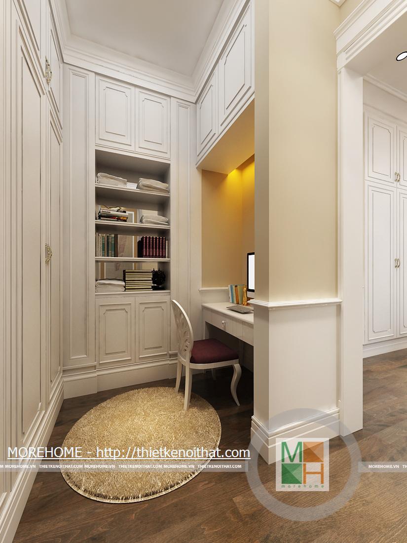 Phòng thay đồ với một tủ lớn có thể chứa nhiều đồ đạc vật dụng. Đối diện với tủ là một chiếc gương lớn phục vụ nhu cầu của gia chủ.