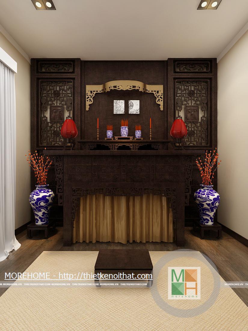 Bàn thờ tổ tiên được đặt trong một phòng riêng, thiết kế theo phong cách phương Đông. Không gian phòng thờ không quá rộng do đó dễ tạo được sự ấm cúng. Nội thất trong phòng như ban thờ, bình hoa…được thiết kế theo lối truyền thống.