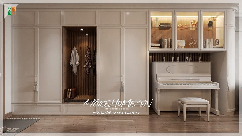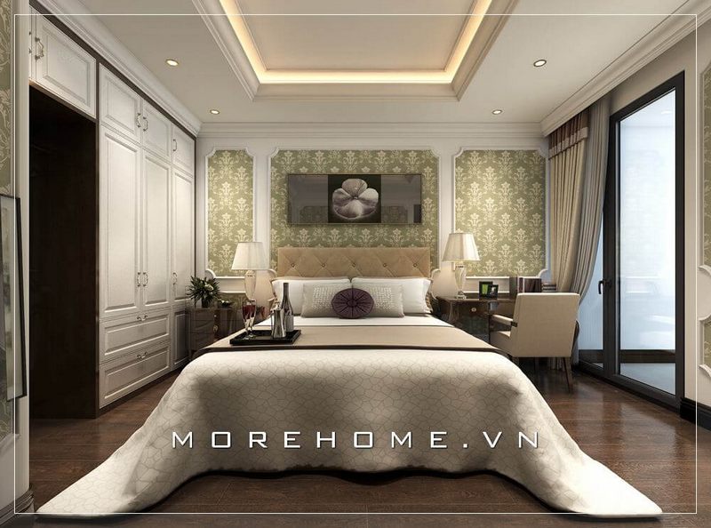 Tủ quần áo tân cổ điển được thiết kế âm tường, tận dụng được tối đa không gian căn phòng ngủ