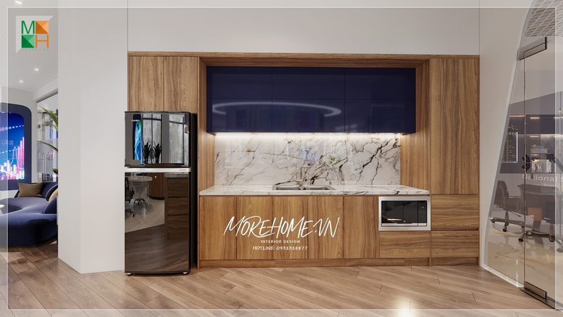 Thiết kế văn phòng làm việc có bếp riêng tiện lợi cho sử dụng quá trình nấu nướng ăn uống của nhân viên.