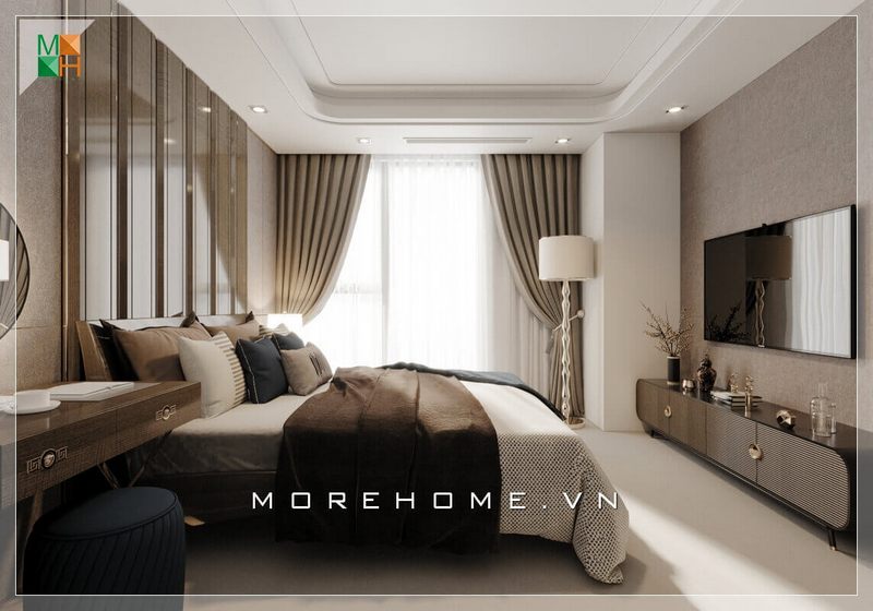 Mẫu phòng ngủ mang phong cách tân đổ điển, thiết kế màu trắng nâu chủ đạo. Tone màu trung tính thường mang lại cảm giác dễ chịu và thoải mái cho gia chủ.