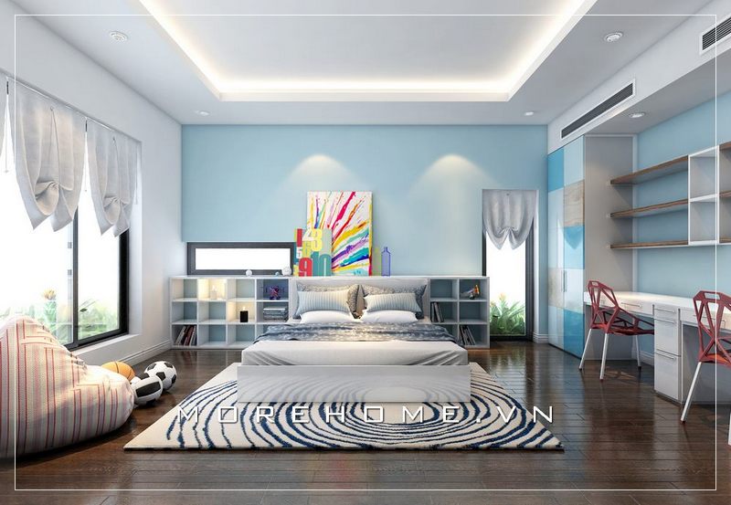 Mẫu giường ngủ gỗ công nghiệp Acrylic màu trắng bóng gương đầy ấn tượng được bố trí ngay trong phòng ngủ 2 bé trai