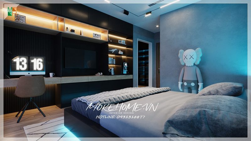 Sắp xếp nội thất phòng ngủ hiện đai trẻ trung với gam sáng màu xuyên suốt không gian từ tường, trần, đồ nội thất.