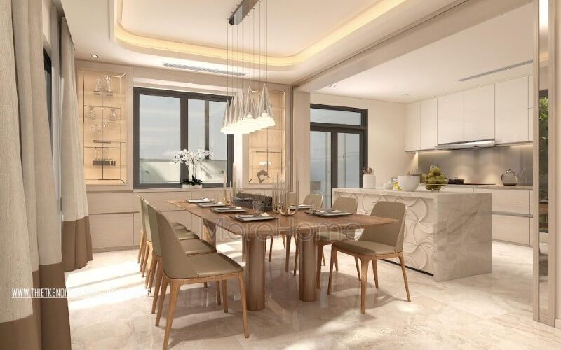 Thiết kế nội thất phòng ăn gỗ tự nhiên kết hợp đèn chiếu sáng, tủ kệ hay các chi tiết nhỏ từ cửa sổ, rèm cửa đều khá ấn tượng mang đến sự hài hòa cho không gian sống.