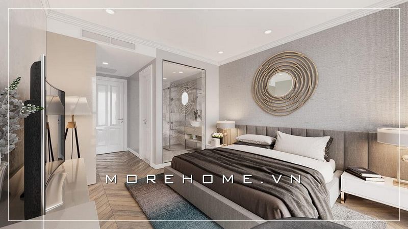 Nội thất phòng ngủ biệt thự phong cách tân cổ điển, vách tường được trang trí bằng giấy dán tường cao cấp mang lại sự sinh động, tưới mới và không kém phần sang trọng
