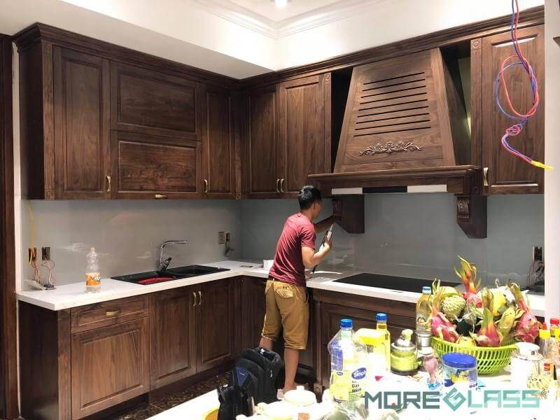 Thi công phòng bếp với mẫu kính cường lực ốp bếp màu trắng sữa sẽ làm giảm bớt cảm giác nặng nề từ nội thất gỗ óc chó