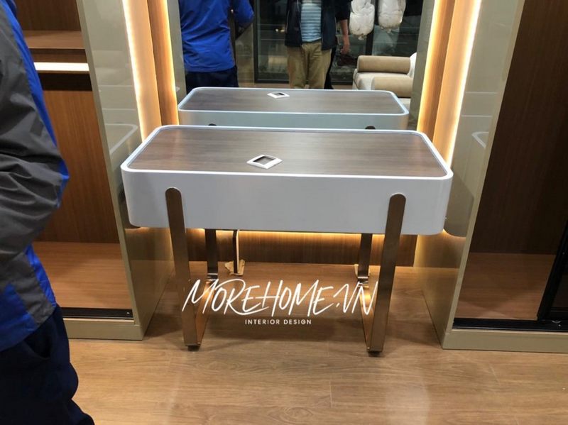 Mẫu bàn trang điểm độc đáo với khung bàn bằng gỗ công nghiệp kết hợp chân inox mạ vàng hiện đại cao cấp