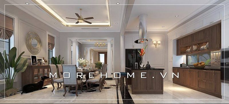 Phòng ăn được thiết kế theo phong cách tân cổ điển với sự kết hợp giữa nội thất gỗ tự nhiên cao cấp và sự sang trọng.